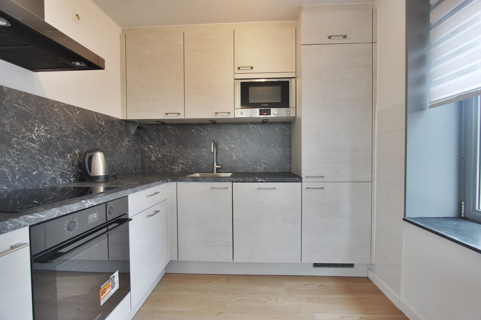 De nieuwe keuken is voorzien van diverse inbouwapparatuur zoals een vaatwasser, koelkast, vriezer, combi-oven, 4-pits inductie kookplaat met afzuigkap en meer dan voldoende opbergruimte.