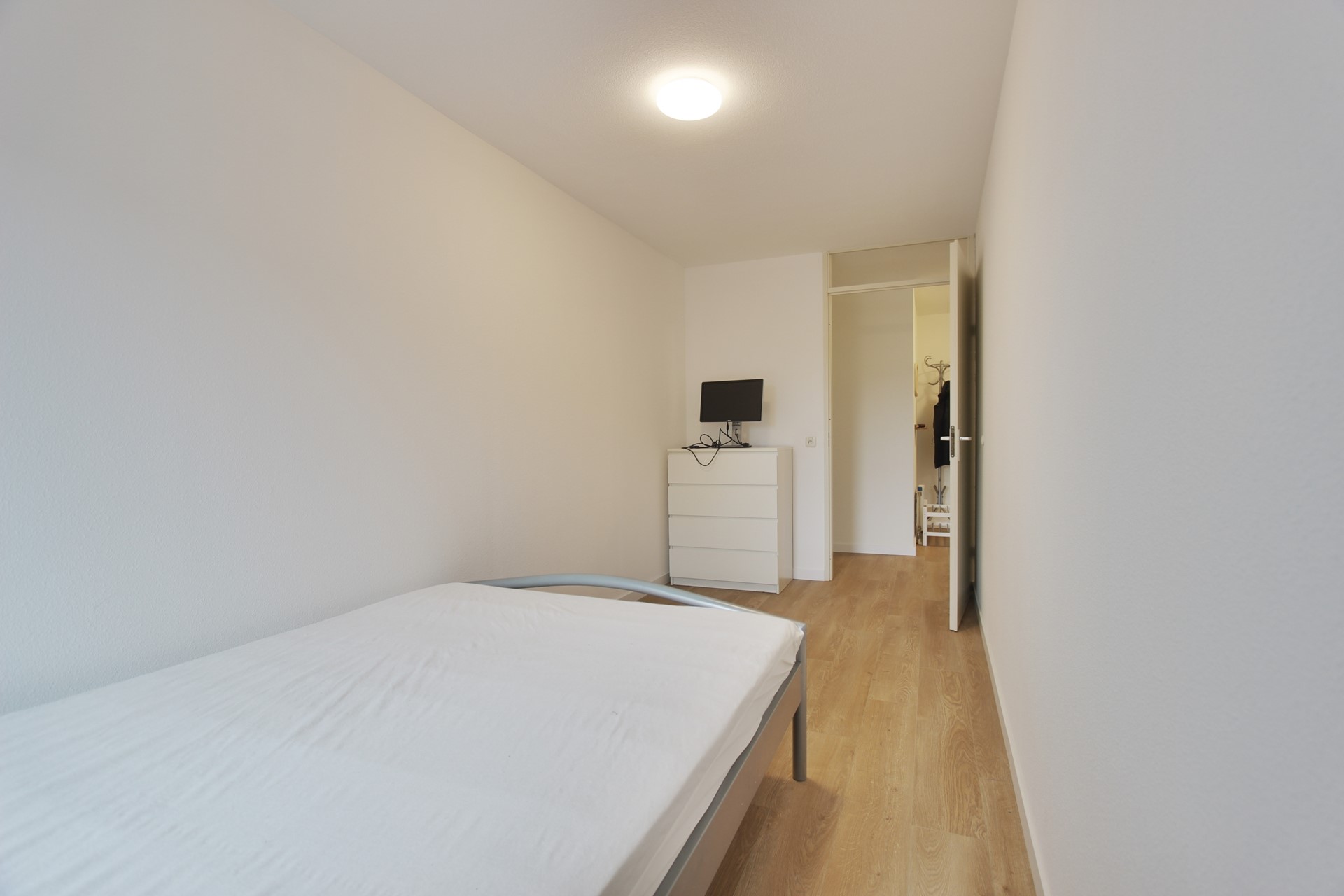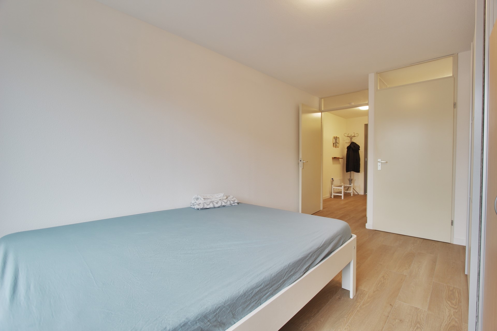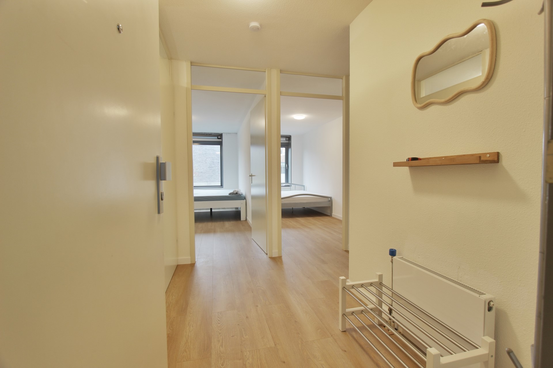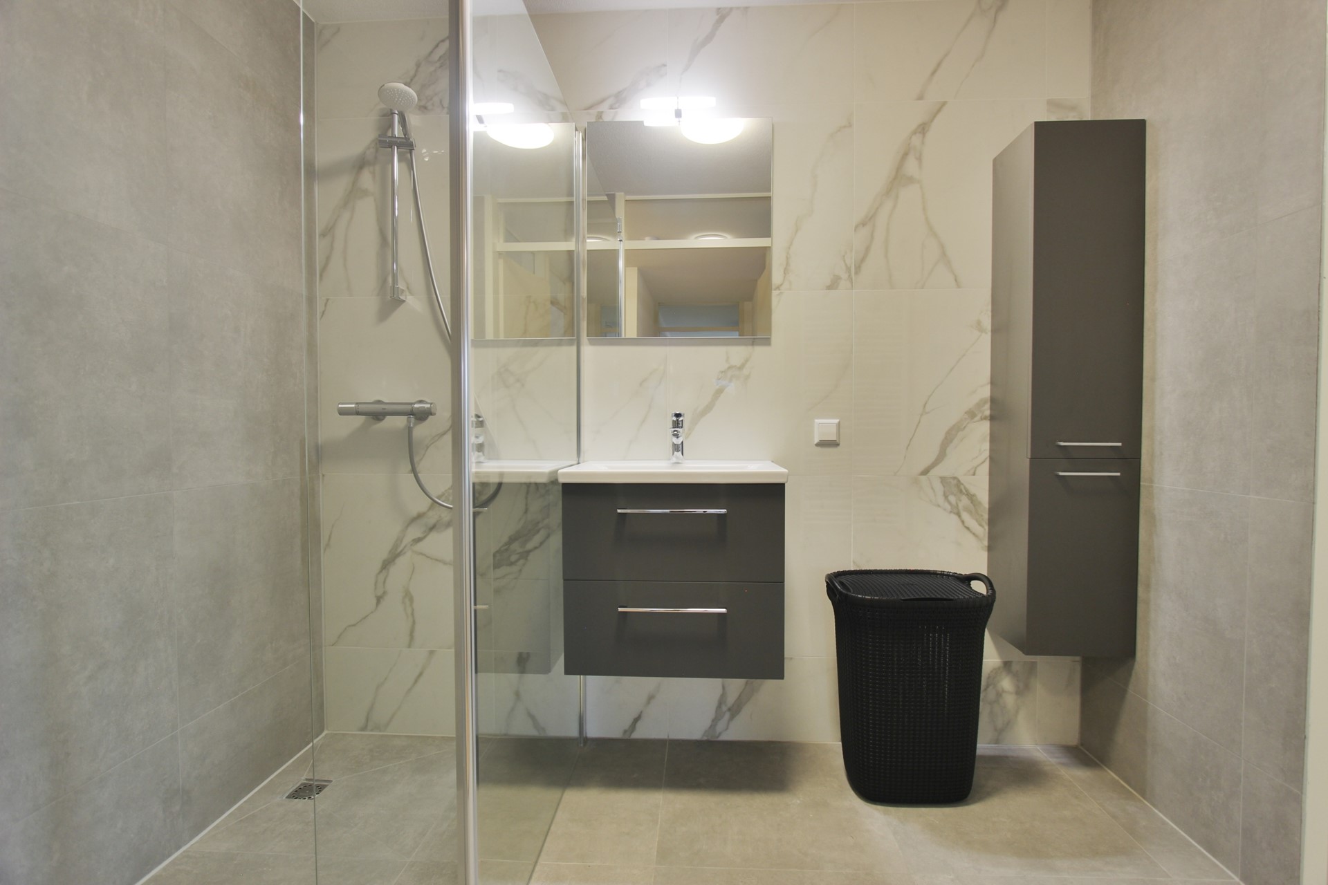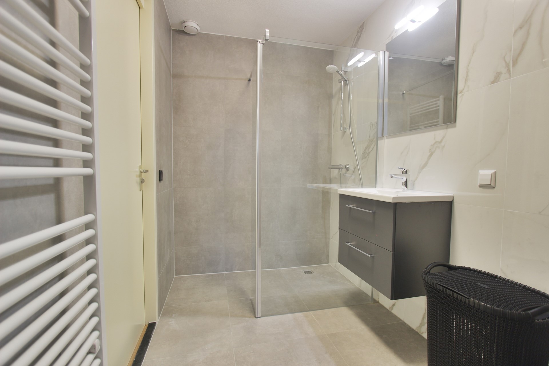 Het appartement heeft 2 slaapkamers en een ruime nieuwe gerenoveerde badkamer voorzien van een inloopdouche, wastafel met meubel, spiegel en handdoeken radiator.