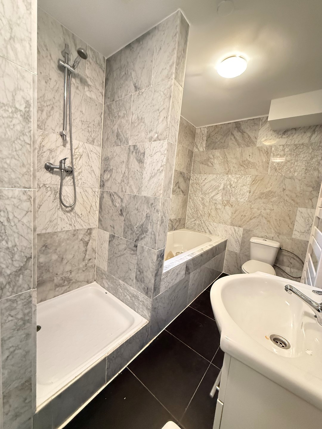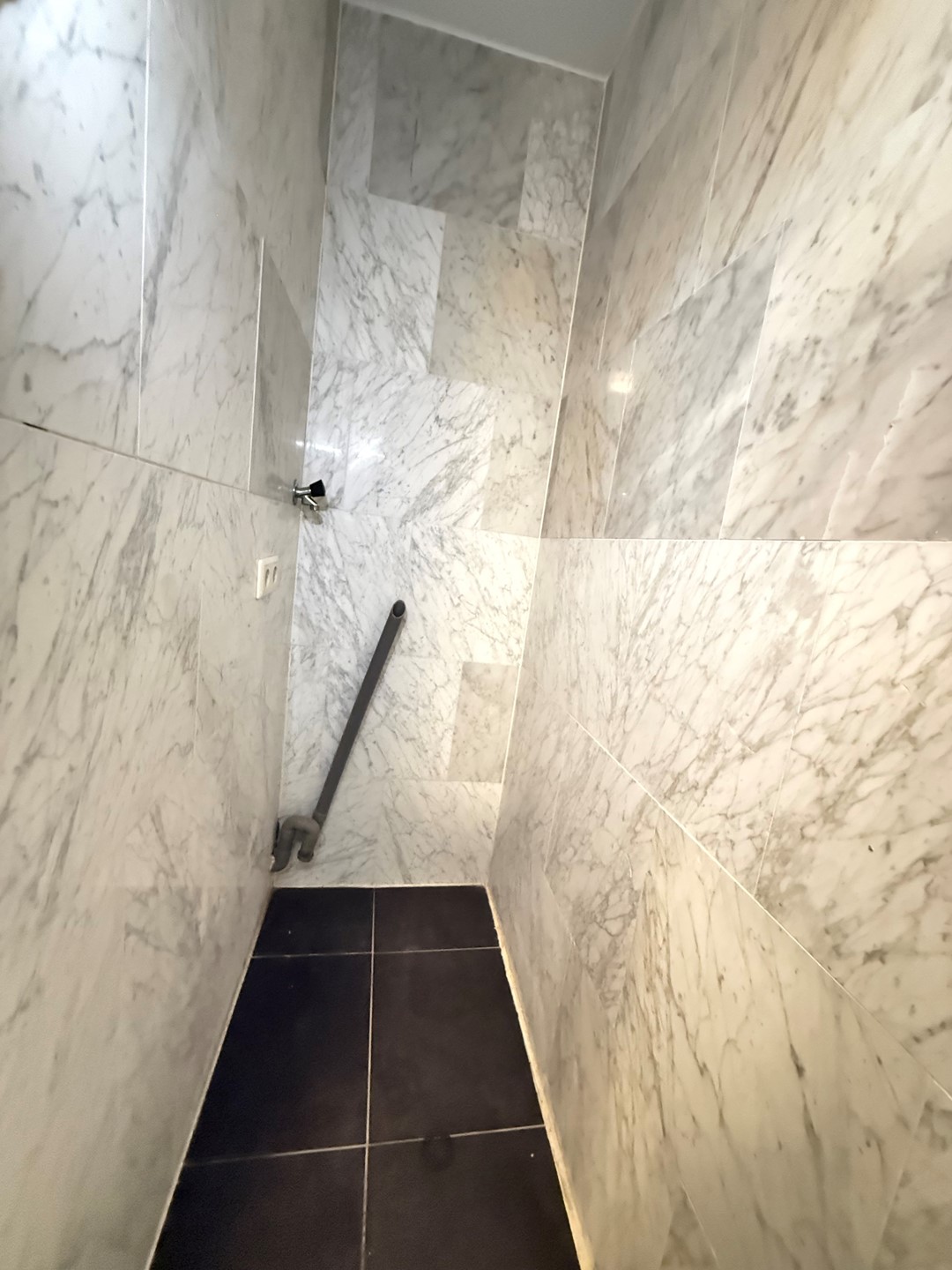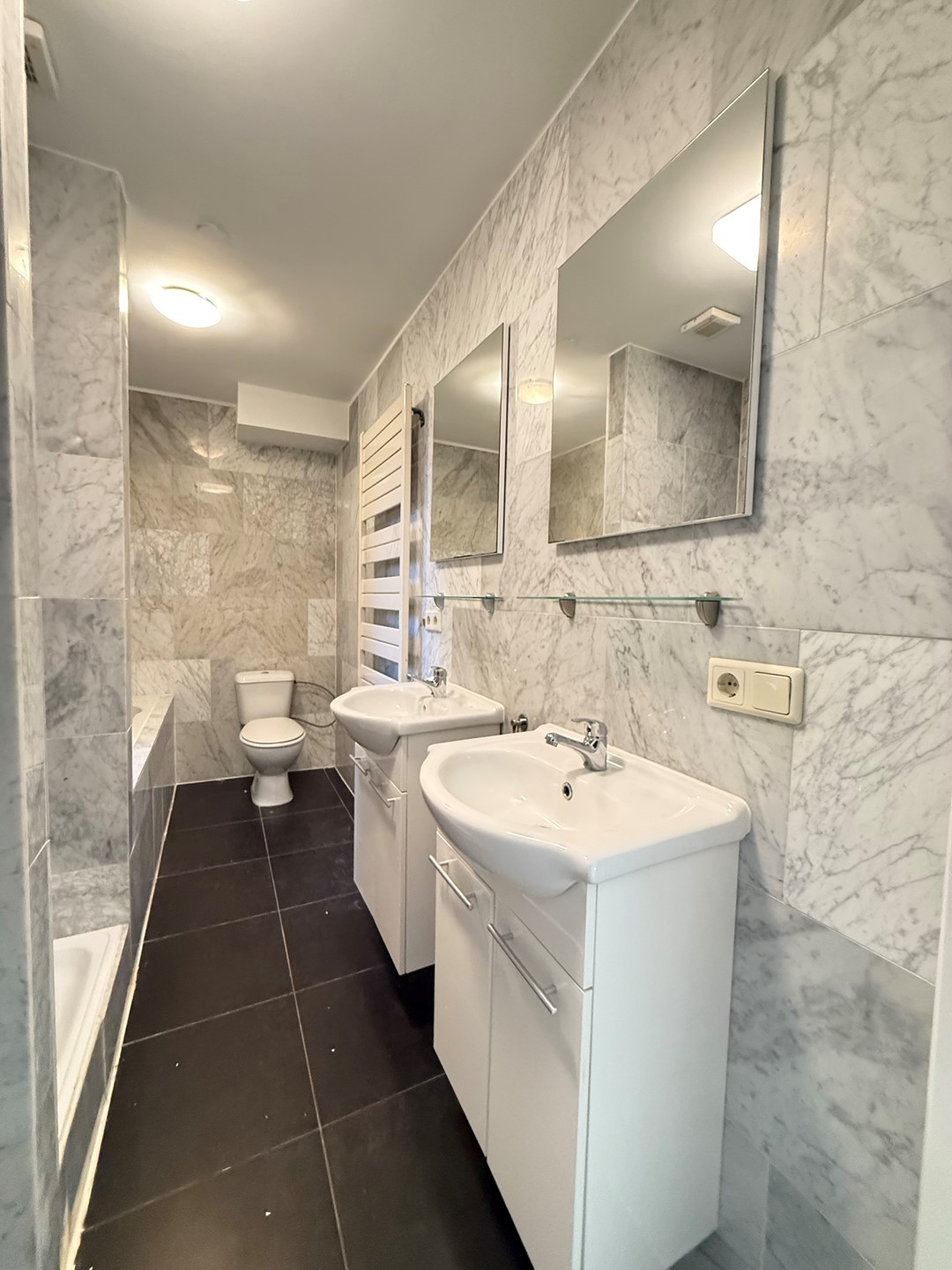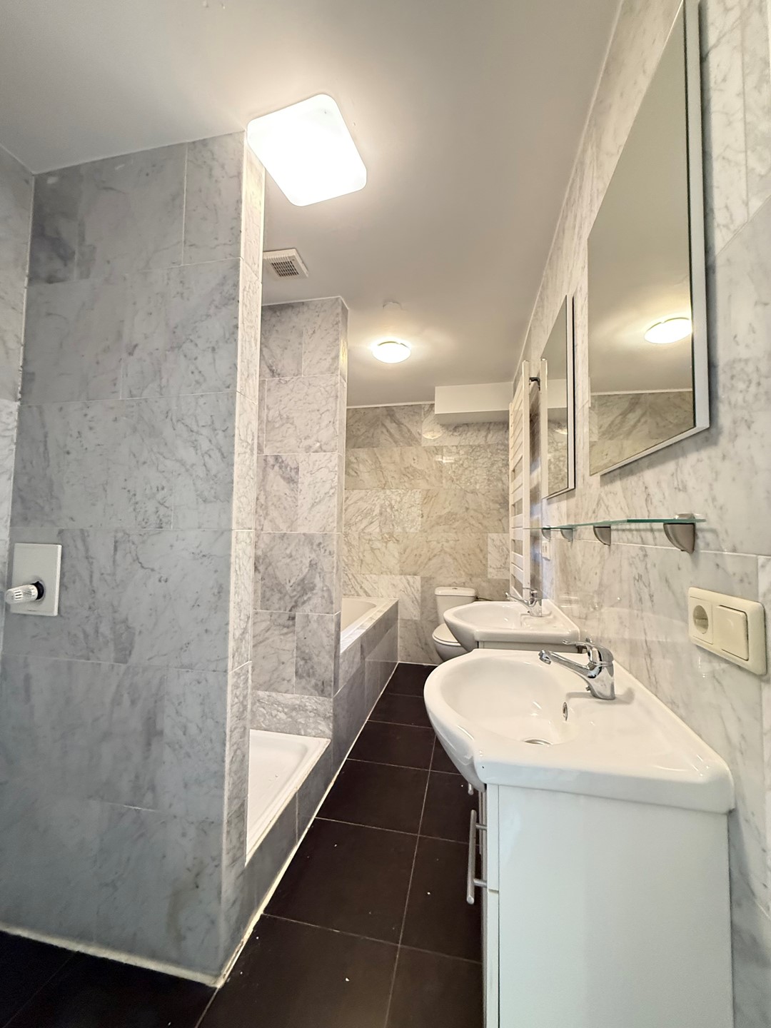 De badkamer is voorzien van een douche, badkuip, twee wastafels en een aansluiting voor de wasmachine/droger. Separaat toilet aanwezig.