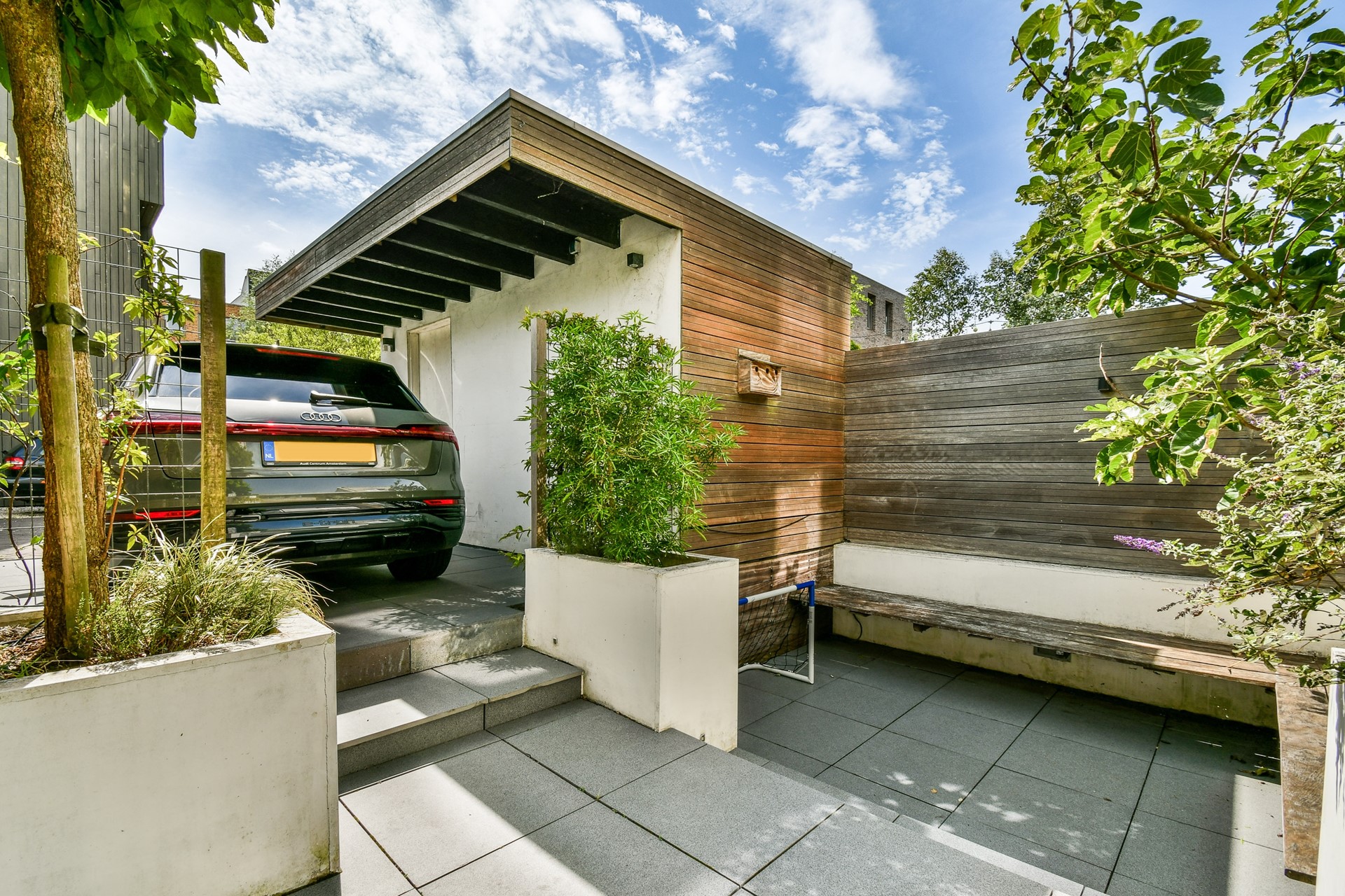 De zonnige tuin op het zuidwesten is fraai aangelegd en voorzien van een mooie hardhouten vlonder en een gezellige zitkuil. Aan de achterzijde van de woning bevindt zich de oprit met een privéparkeerplek op eigen perceel, inclusief aansluiting voor een elektrische auto. Tevens is hier een praktische bergruimte aanwezig.