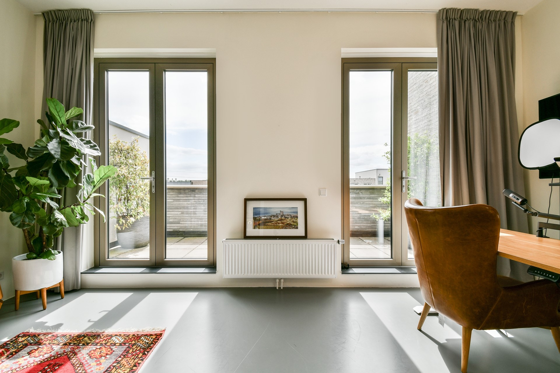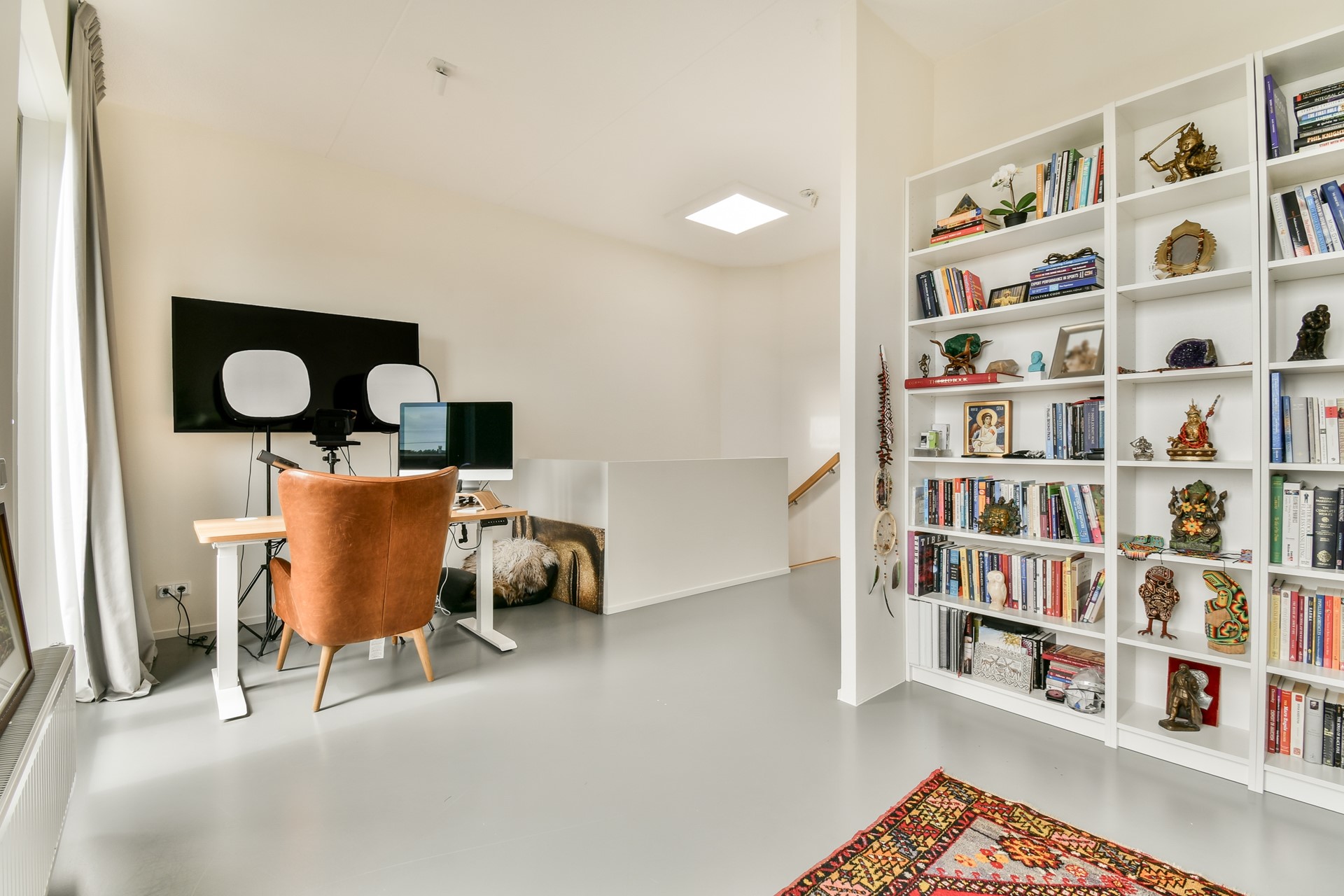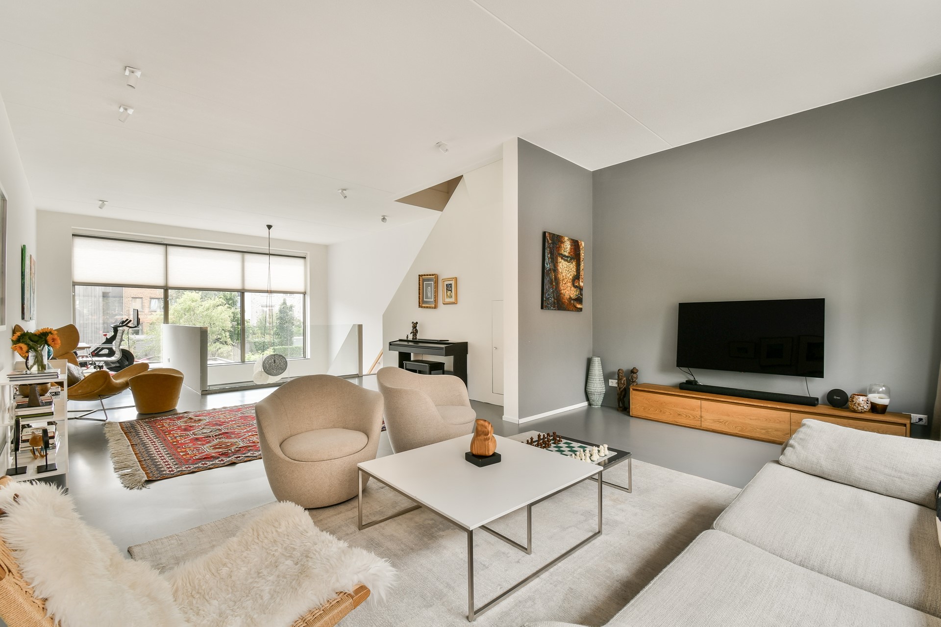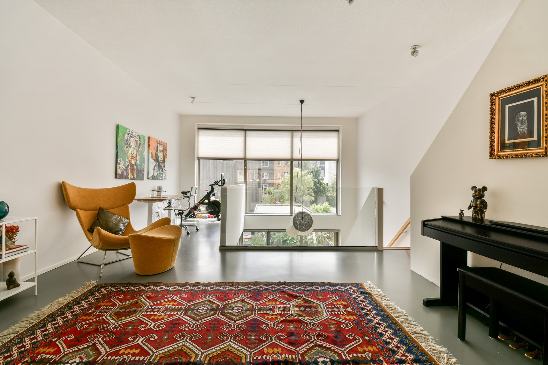 De eerste verdieping is volledig ingericht als woonkamer. Door de vide, die uitkijkt op de woonkeuken, en de grote raampartijen wordt de ruimte gevuld met natuurlijk licht. De indrukwekkende glazen pui over de volledige breedte van de woning, gecombineerd met een plafondhoogte van circa 6 meter, zorgt voor een bijzonder ruimtelijk en licht effect dat zowel op de begane grond als op de eerste verdieping goed merkbaar is.