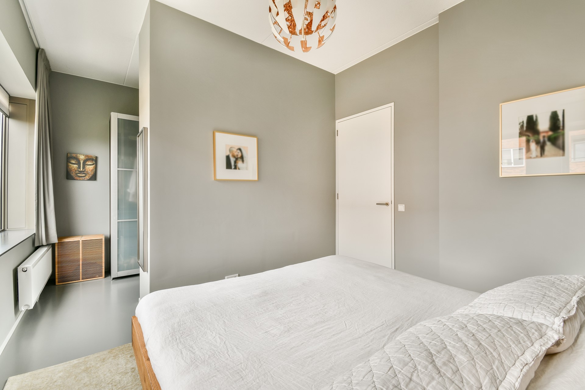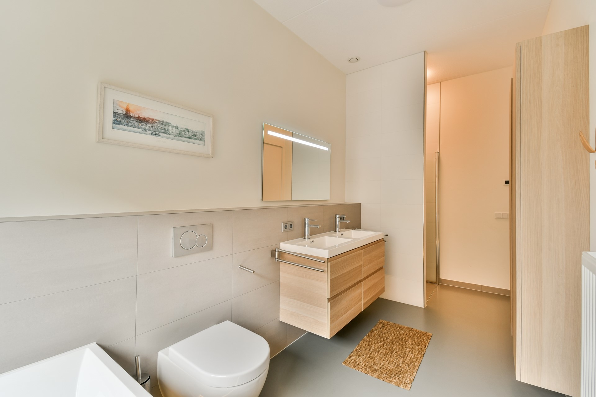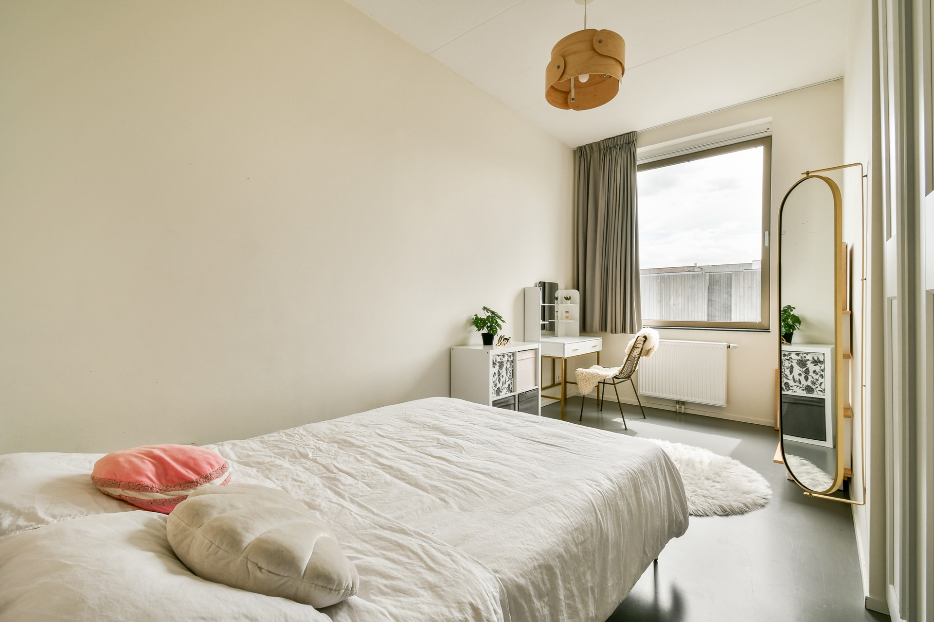 De gietvloer loopt naadloos door over de gehele woning, en zet zich op deze verdieping moeiteloos voort in zowel de slaapkamers als de badkamer.
