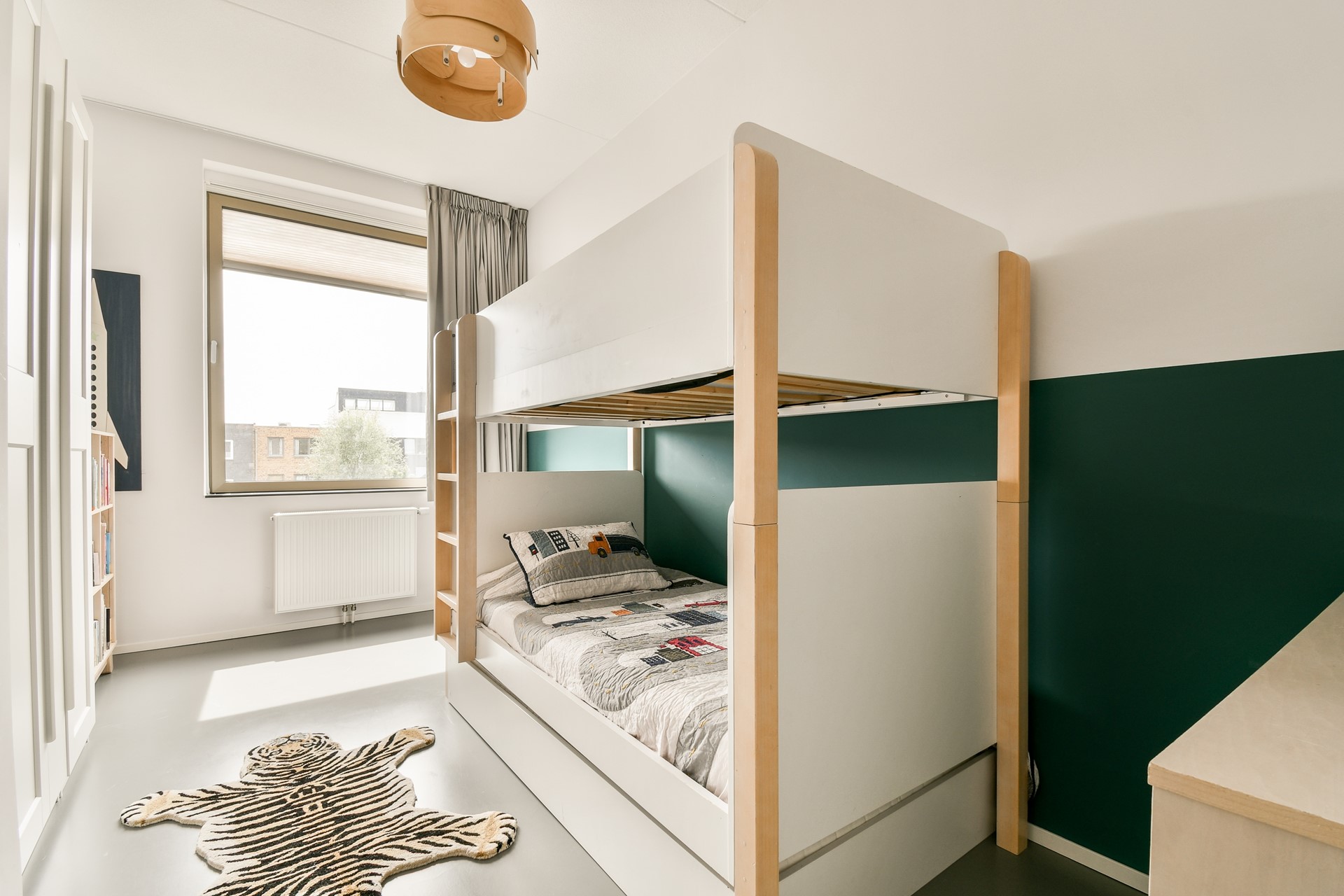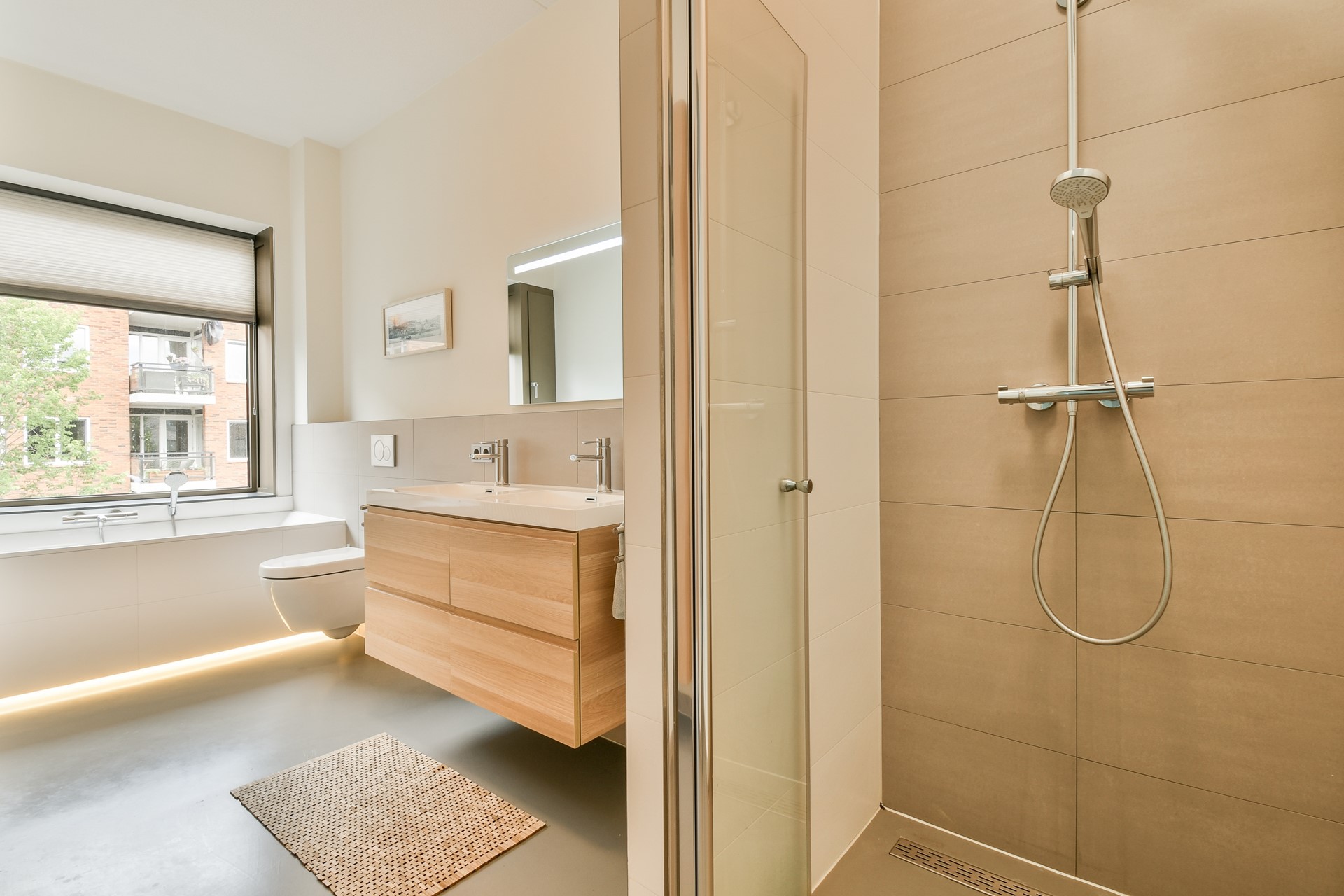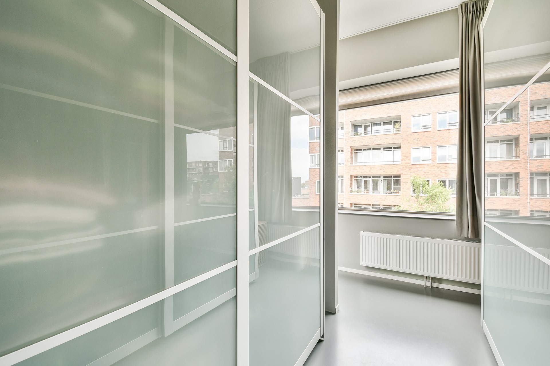 De gietvloer loopt naadloos door over de gehele woning, en zet zich op deze verdieping moeiteloos voort in zowel de slaapkamers als de badkamer.