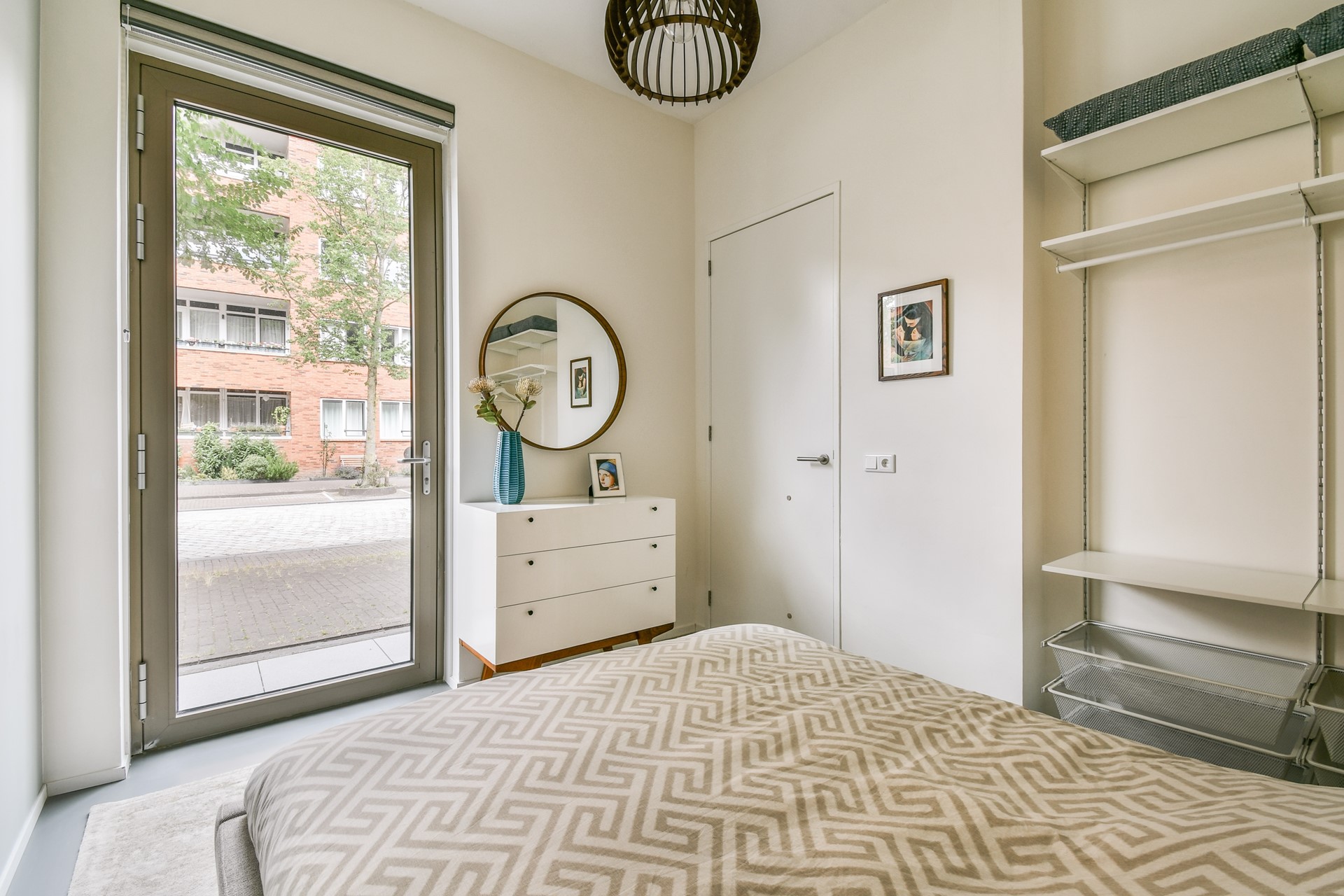Entrance through the hall with a private front door. The hall includes a wardrobe, storage space, a toilet, and a pantry. At the front of the house is the first bedroom, overlooking the peaceful street and featuring its own entrance.