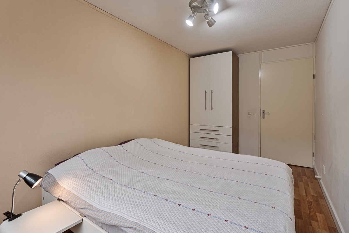 The main bedroom has a 2-person bed and a wardrobe. The bathroom is nicely spacious with a bathtub, a shower, washing machine and a dryer. Off the hall you find a seperate toilet.