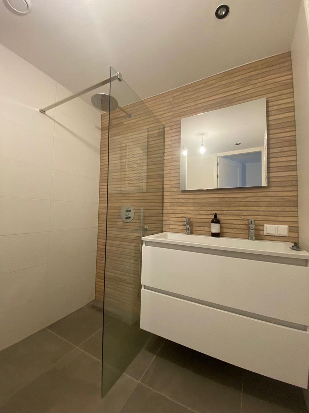 Badkamer met douche en wastafel