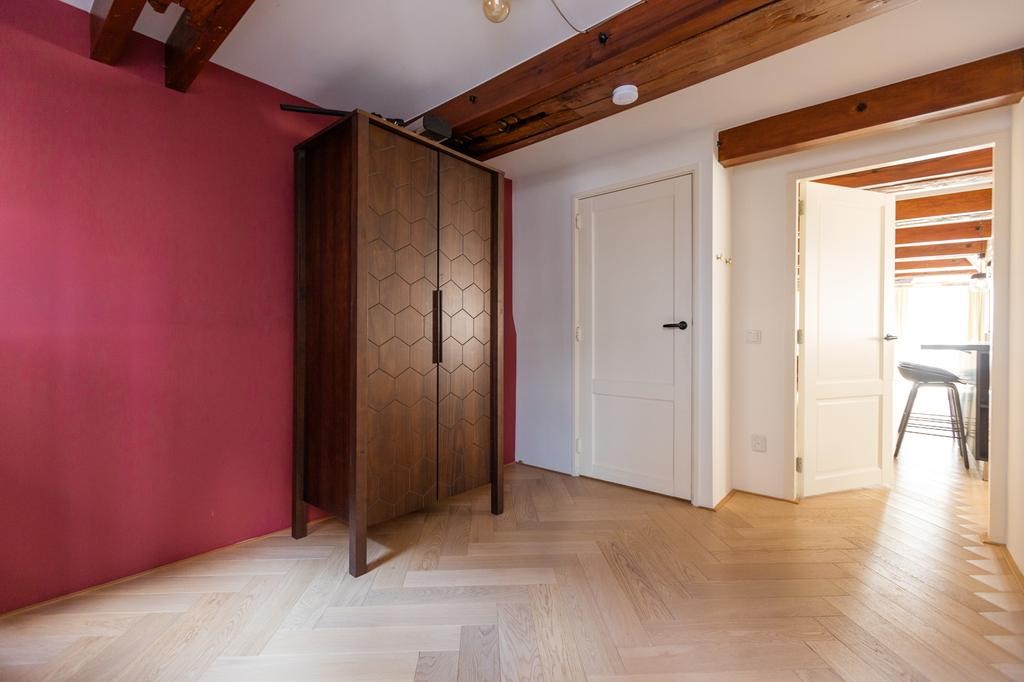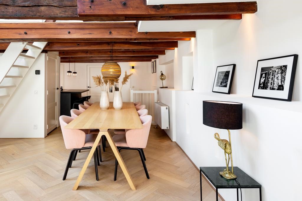Unique and charming apartment in a 17th century monumental building, located in a quiet street in the center of Amsterdam! This fully furnished apartment of approximately 94 m2 (105 m2 floor surface because of sloping roof) with playful layout is located on the two top floors of the building, has a spacious living with open kitchen and beautiful wooden beam structure of the roof in sight, two bedrooms, and a roof terrace with fantastic views! Equipped with a luxurious kitchen including island, modern bathroom with double shower, aqua clean toilet, double glazing, stunning herringbone floor and stylish furniture.