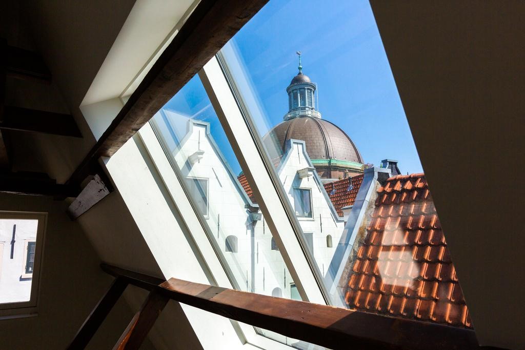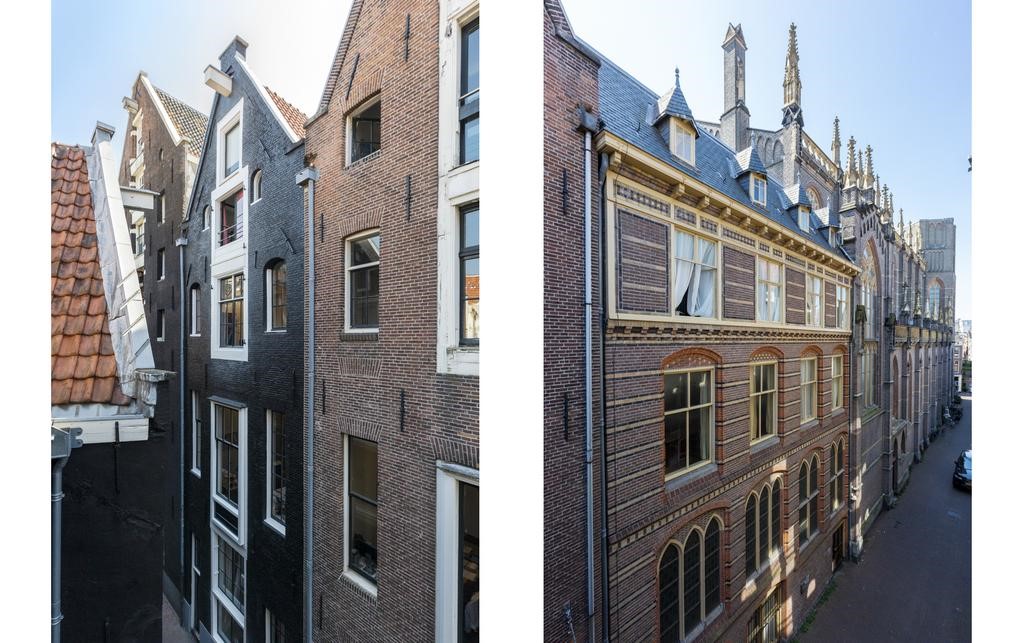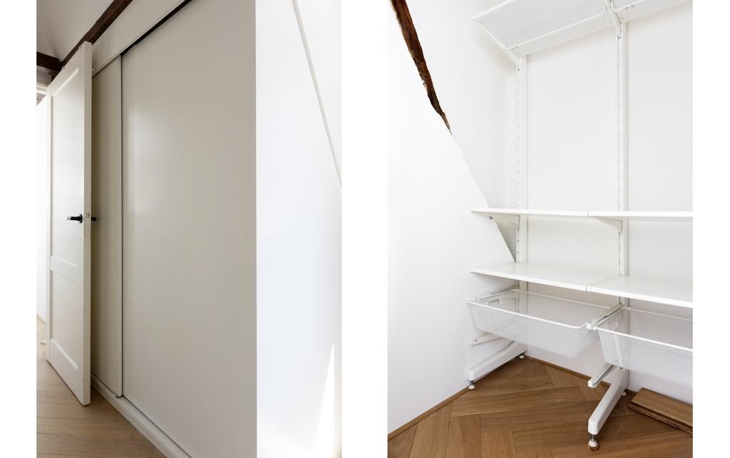 Through the open stairs in the living room you reach the top floor, the entresol gives is a nice view to the living room, master bedroom at the rear with airco and a walk-in closet and lot's of built-in closets along the entire length of the room, roof terrace with lounge and fantastic views over the roofs of the charming old city center.