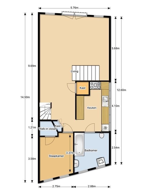 Communal entrance with bicycle storage and private storage closet, stairs to private entrance on the third floor, hall with wardrobe area, internal stairs to the fourth floor, spacious and bright living with French balcony at the front, beams and a large sky light, open kitchen with bar is equipped with 5-burner gas stove, oven, combi oven, plate heater, dishwasher, fridge and freezer, one bedroom is located at the rear of the apartment and has a large built-in closet including washer and dryer, bathroom with marble look equipped with double sink, aqua clean toilet and double walk in shower.