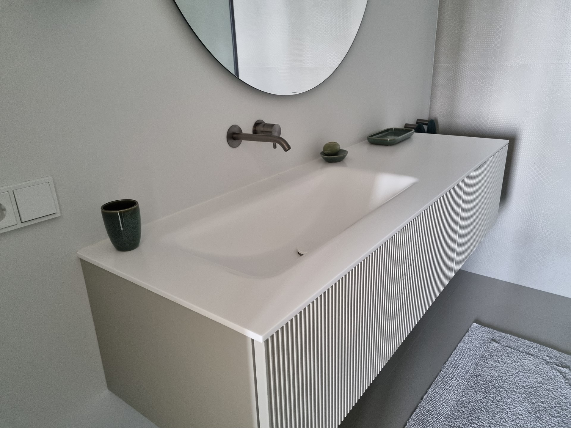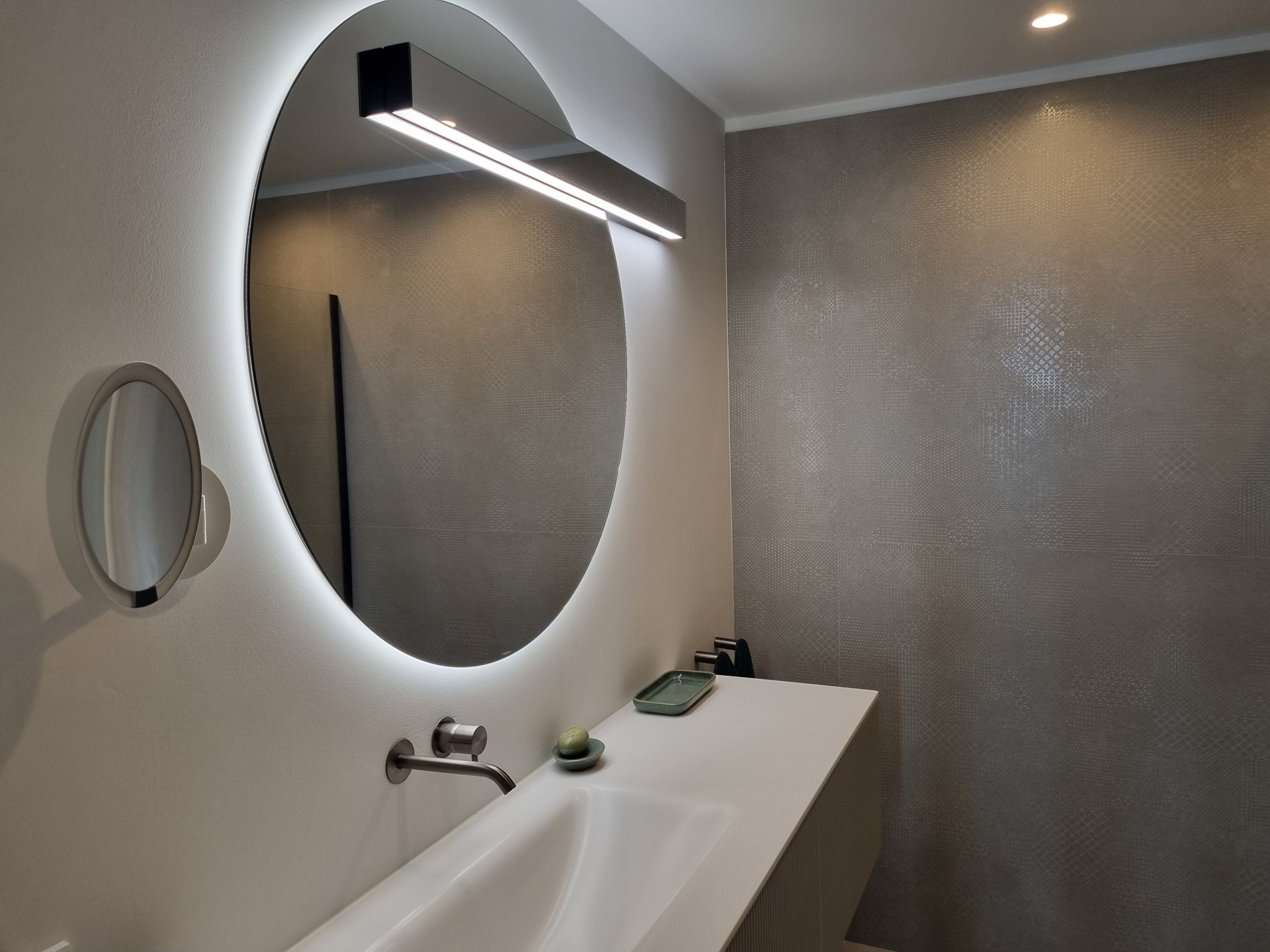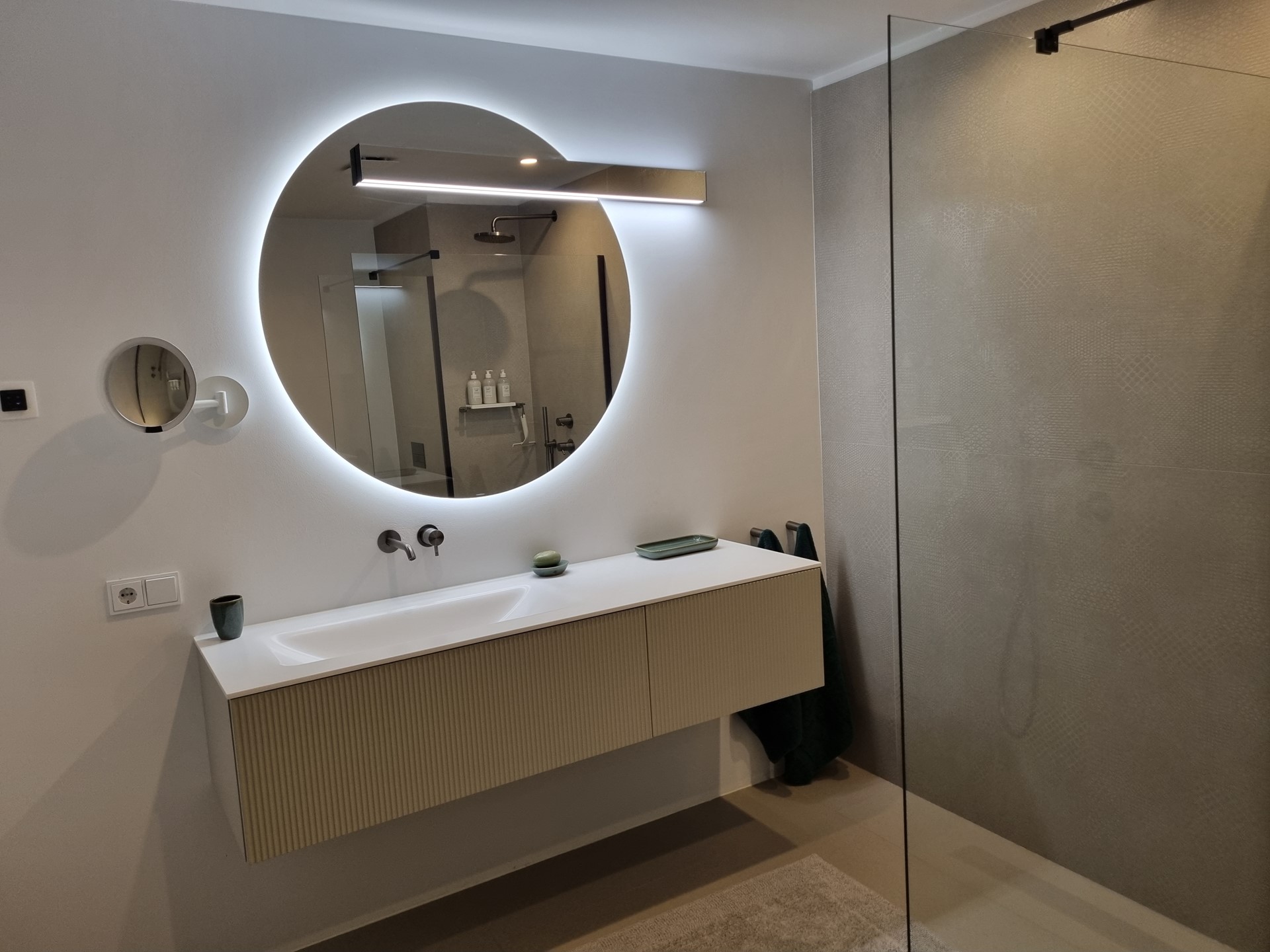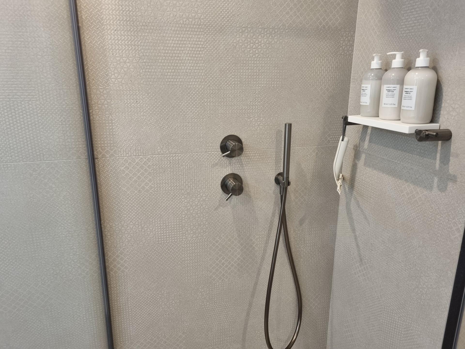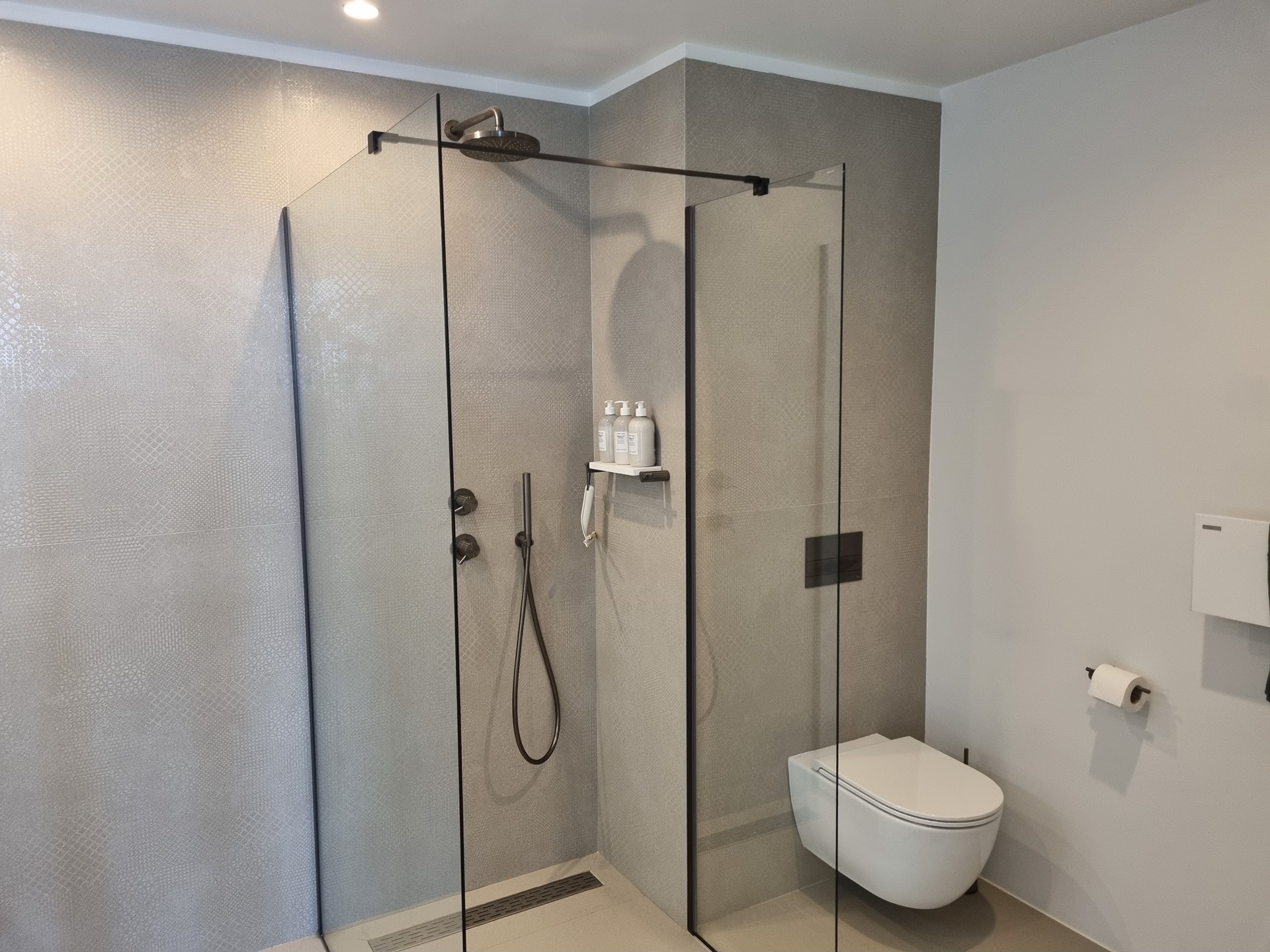The bathroom is custom-designed with high-quality sanitary fittings from renowned brands, seamless tiling, and a walk-in shower that flows beautifully with the flooring.