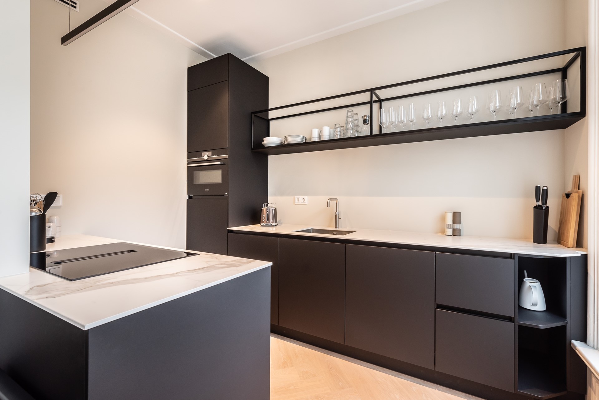 Next to the table you find the elegant open plan kitchen. It includes everything you need to prepare your delicious dinners; a microwave / oven, quooker, refrigerator, dishwasher, coffee machine, toaster and plenty of storage space. All hidden behind the stylish black matte look.