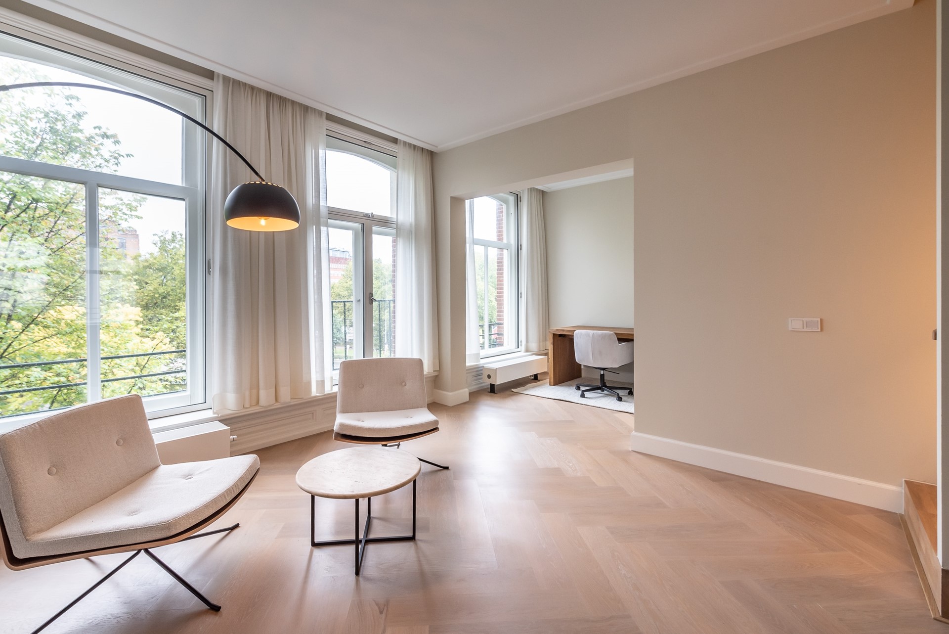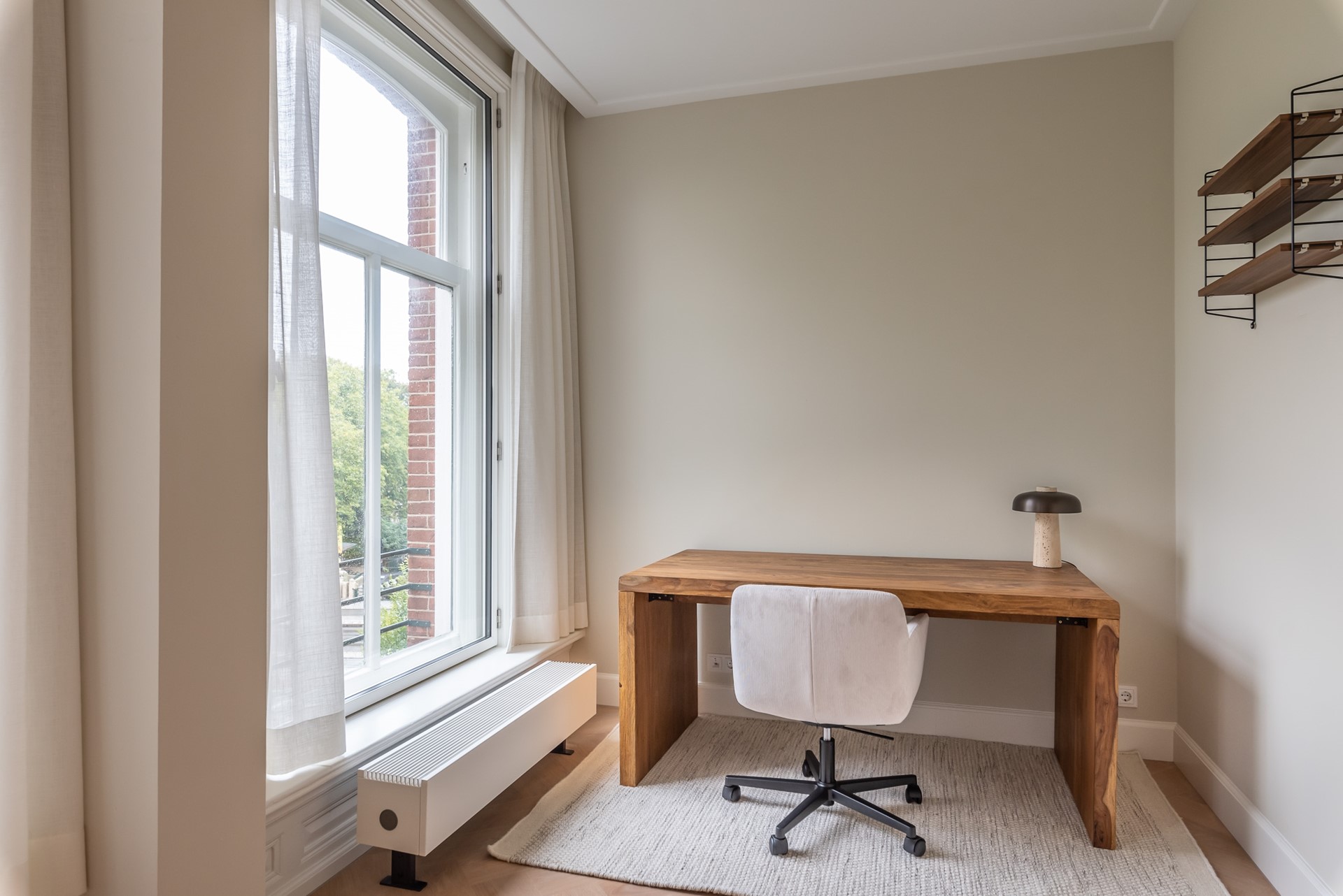Adjacent to the seating area a study room is situated. A firm wooden desk, comfortable office chair and lots of daylight make sure this is the ideal place to work from home.