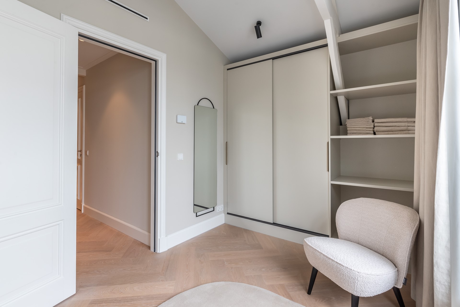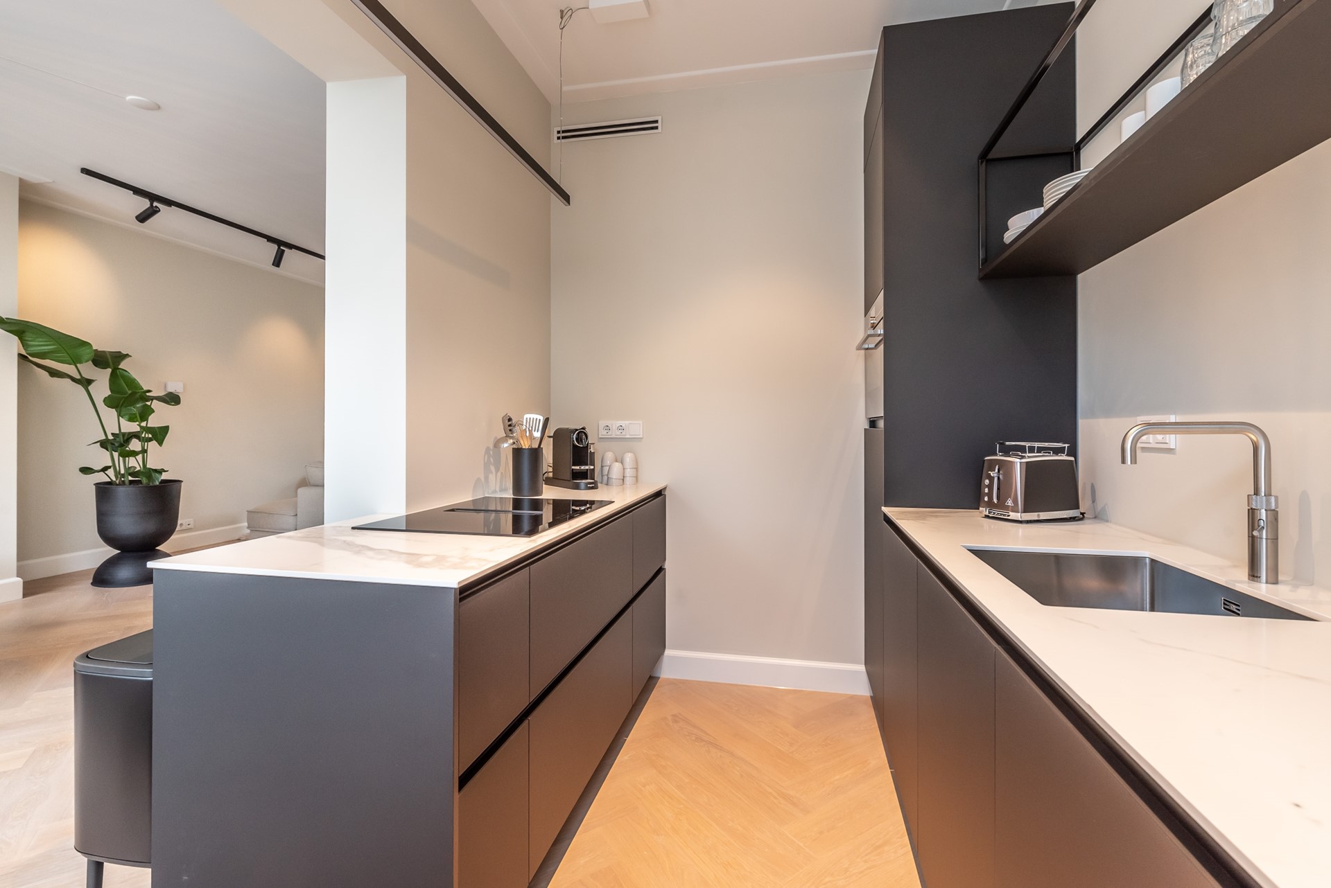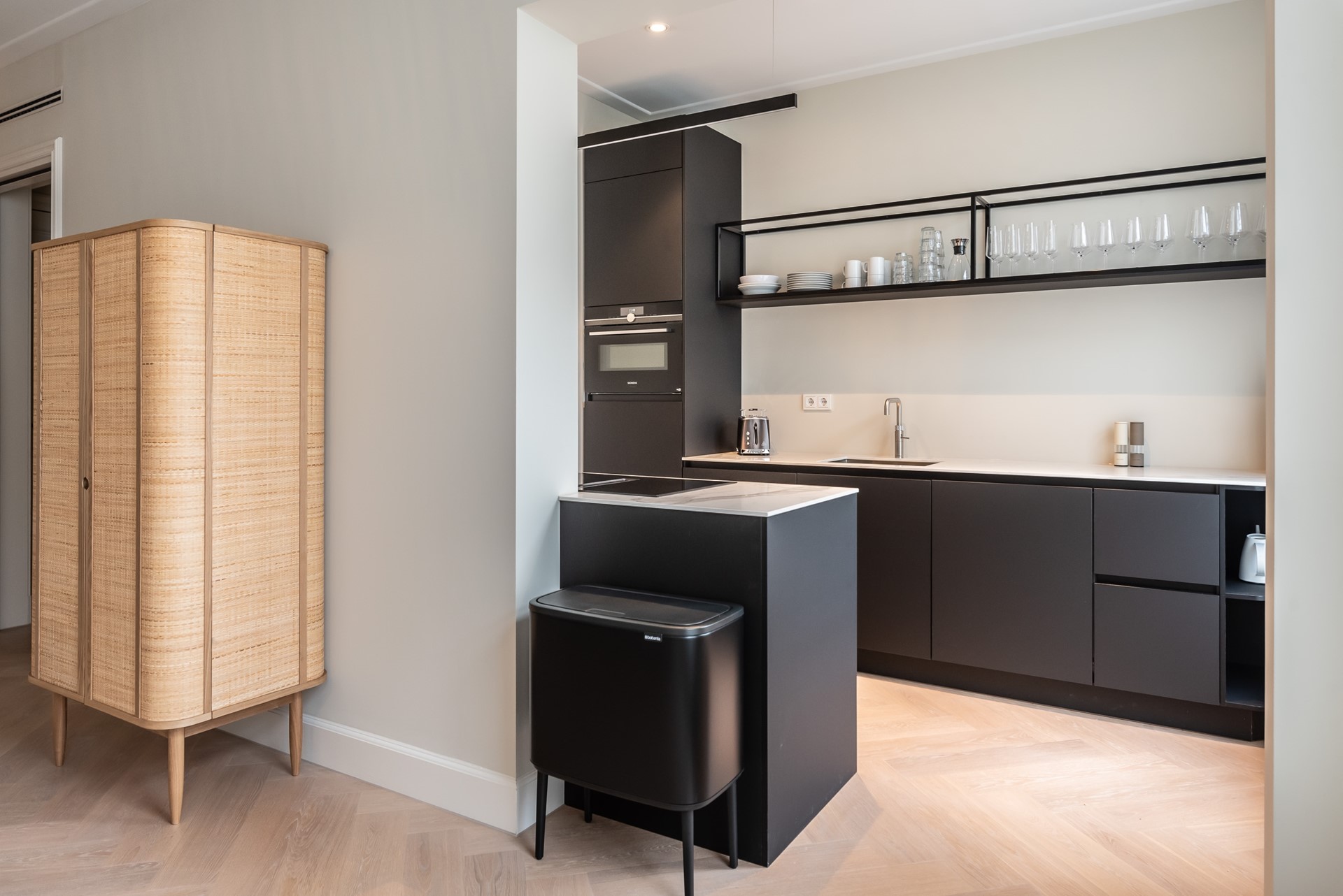A beautiful herringbone wooden floor, dimmable built-in lights and beautiful doors with matching door fittings can be found through the entire apartment, giving it an overall lush and warm feel.