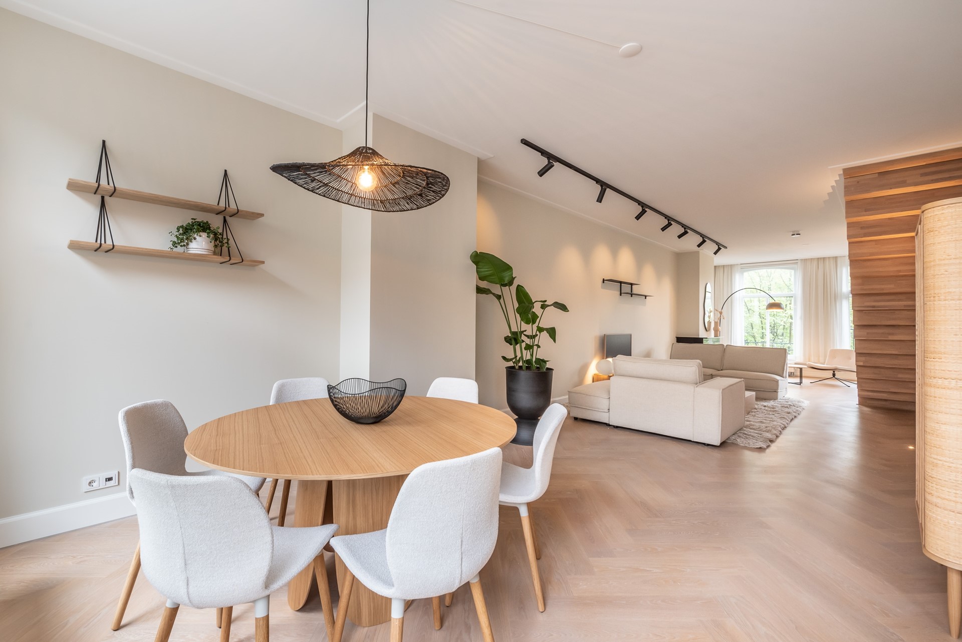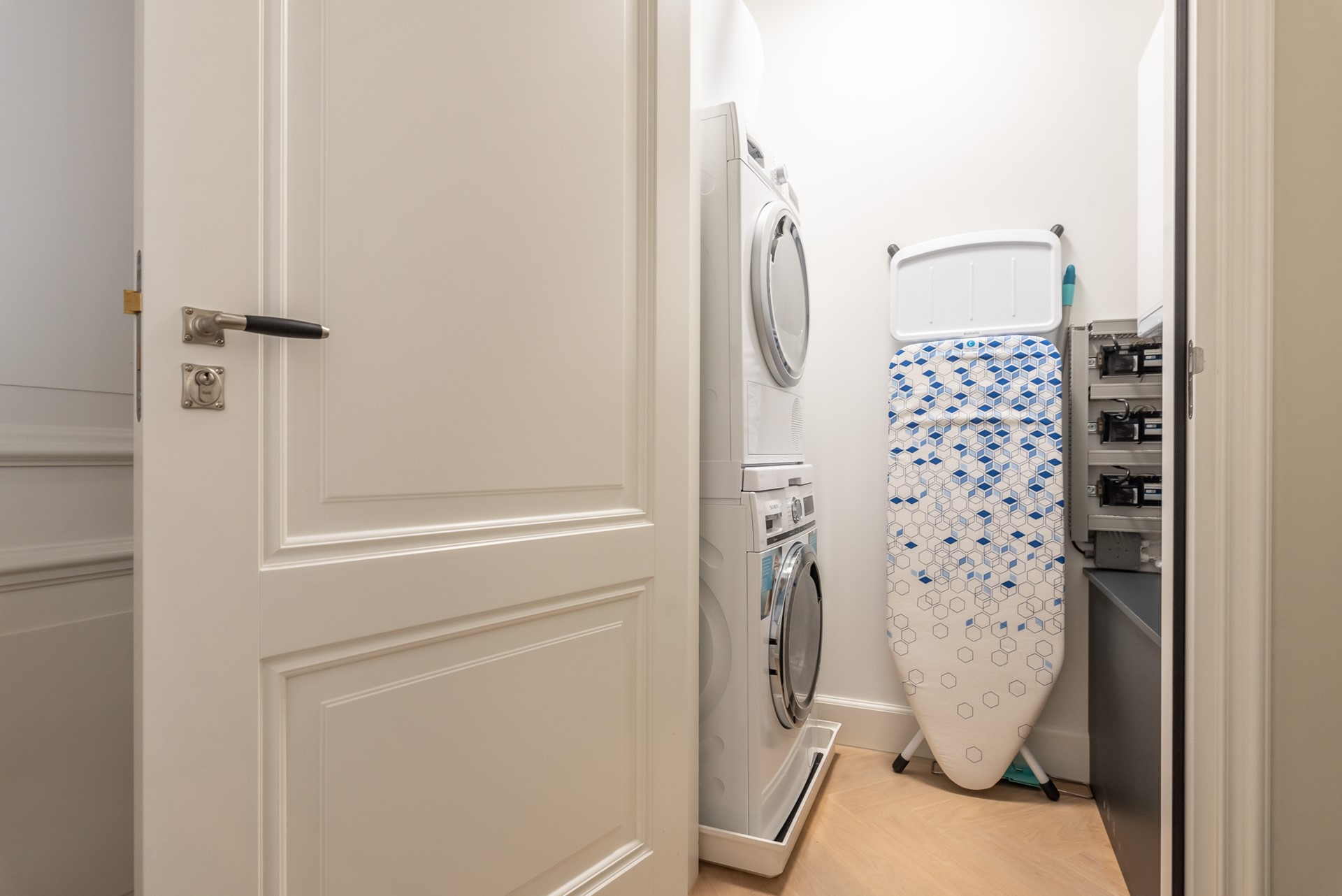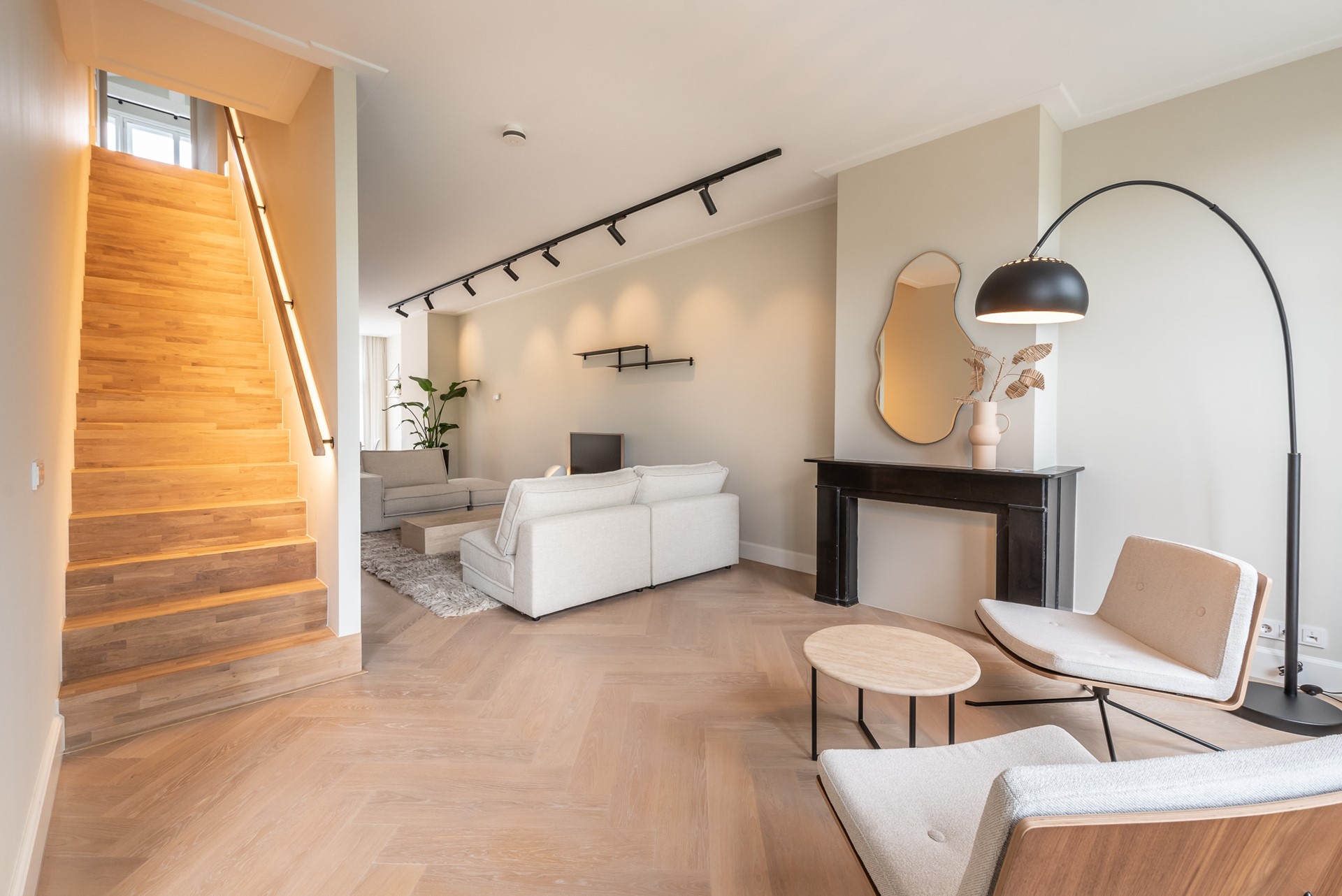 A beautiful herringbone wooden floor, dimmable built-in lights and beautiful doors with matching door fittings can be found through the entire apartment, giving it an overall lush and warm feel.