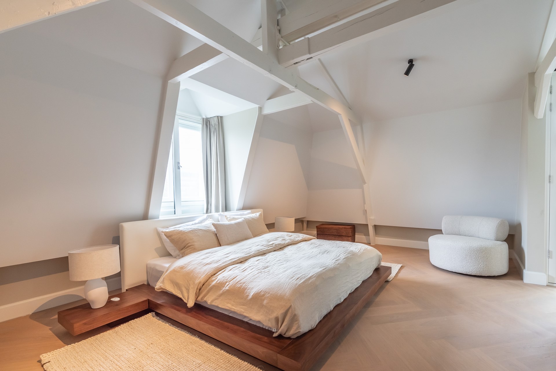 Entering the large master bedroom on the frontside of the apartment you immediately notice its high ceiling, with original wooden beams that once again reminds us that this is an historic building. A gorgeous wooden bed in the middle and a lounge seat make this room a true lush area where you can have a good night sleep, relax or just stay in.