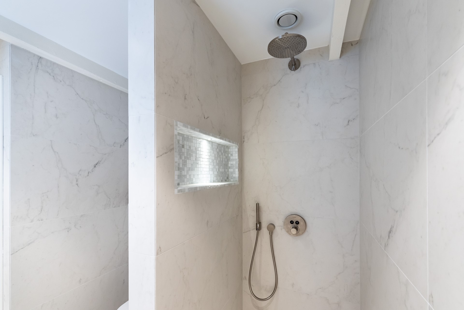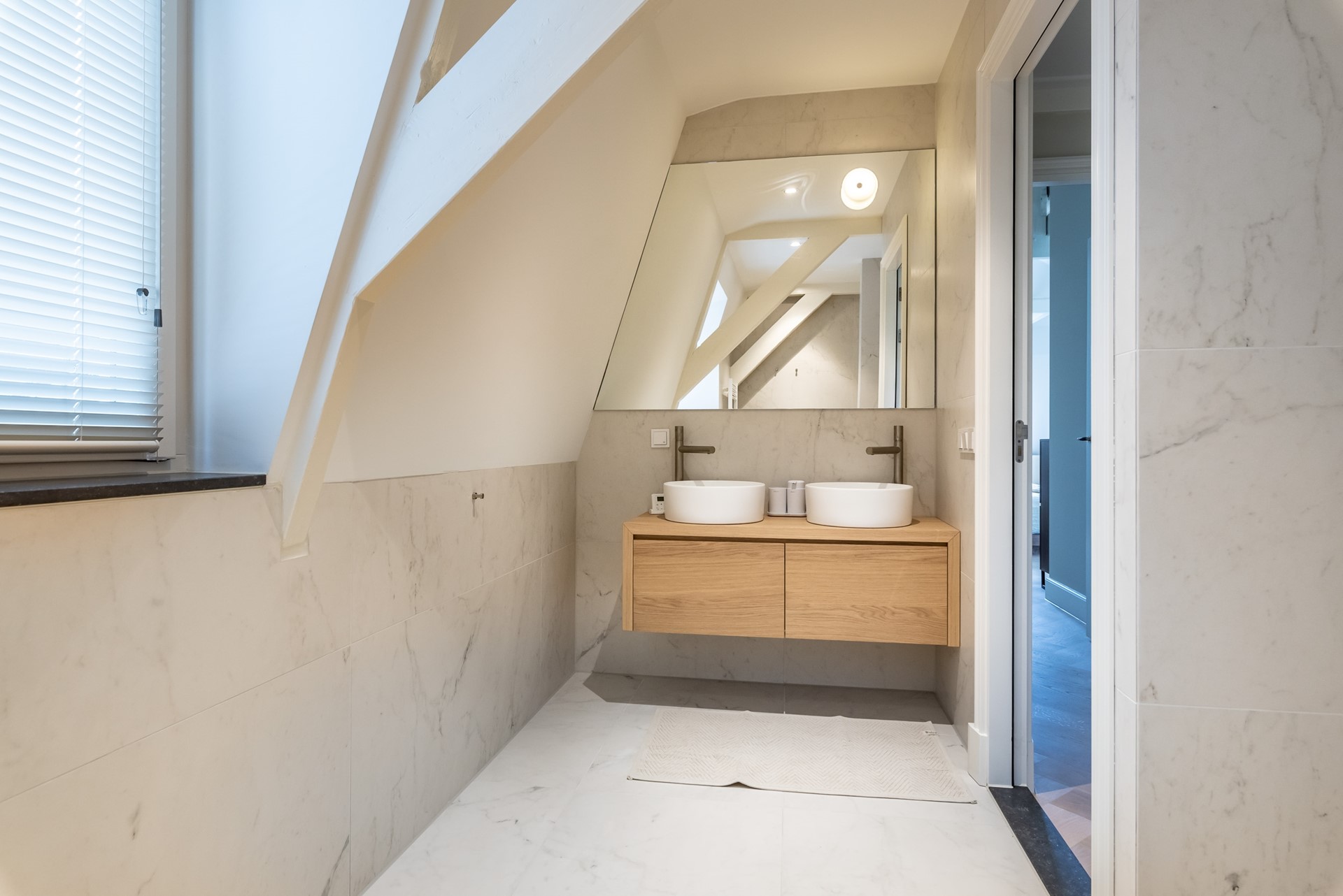 Next to the master bedroom the bathroom is situated. It has a modern double washbasin with cabinet, an extra toilet and a modern shower. All decorated with marble tiles.