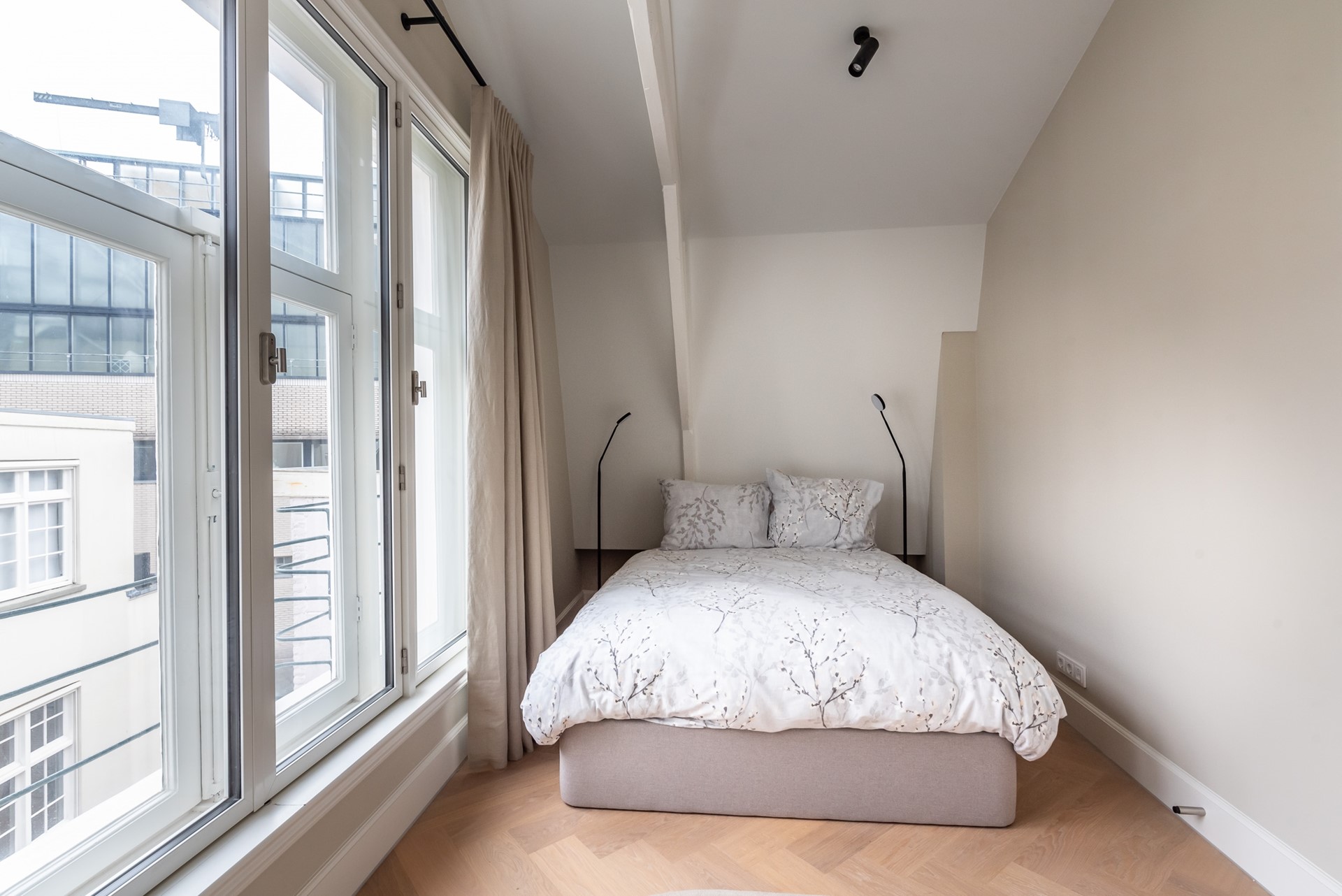 Public parking on the street. A short waiting list for a parking permit. Parking in the adjacent Hirsch building may be available on request or otherwise in the Q-Park parking on the other side of the canal.