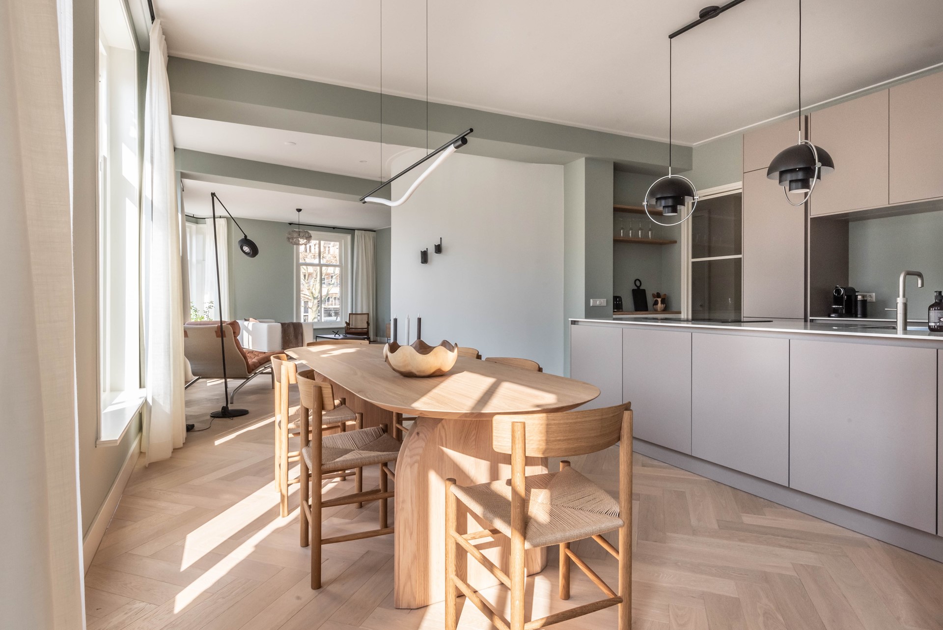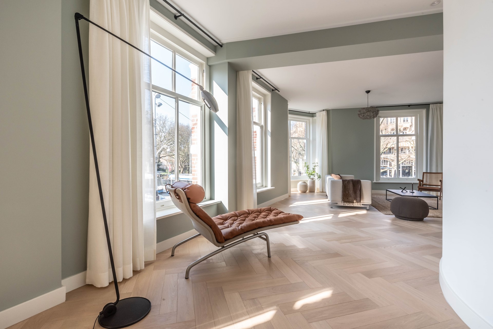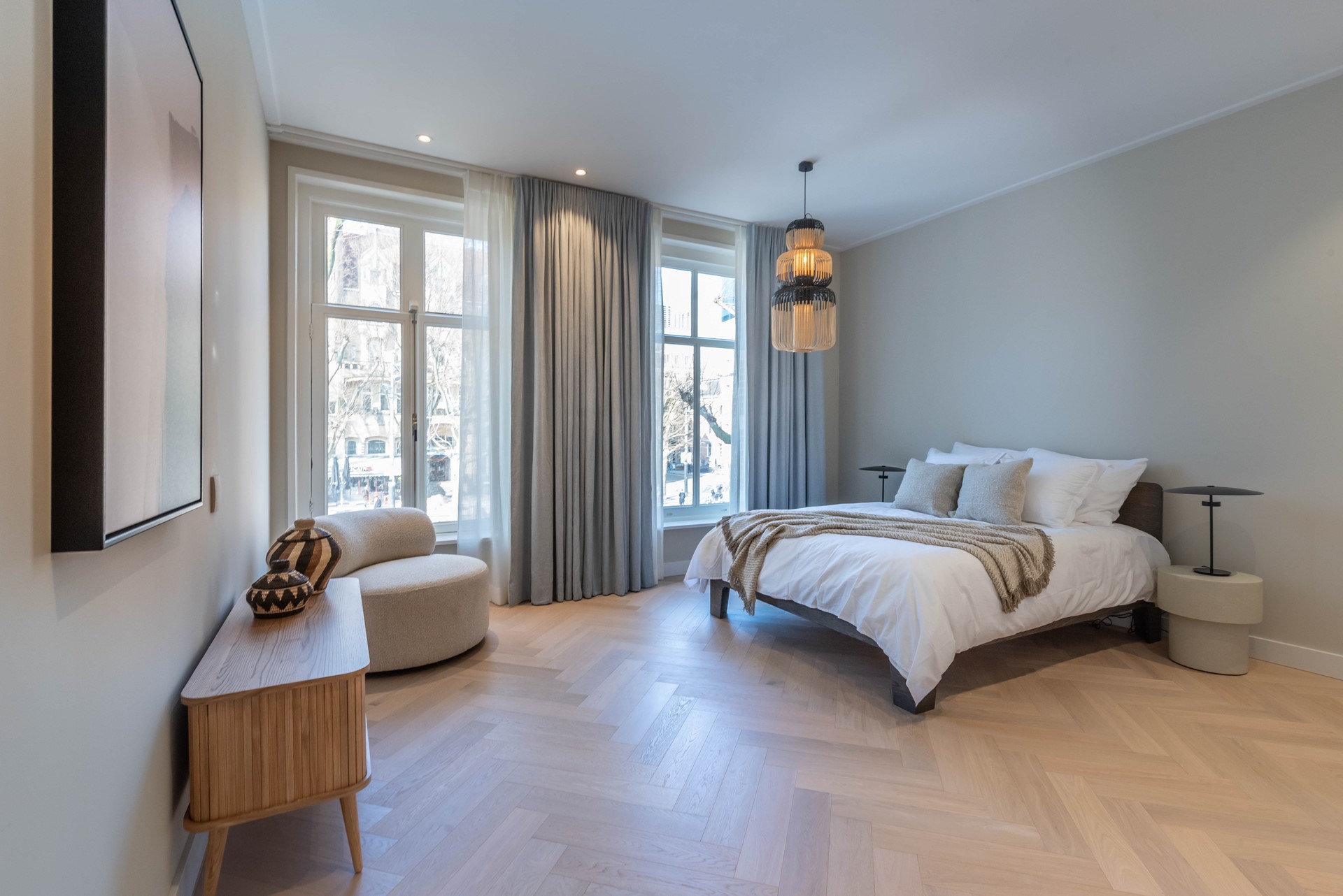 We proudly present high-end renovated, newly furnished, and styled turn-key apartments in a monumental canal house on Leidsekade. During the renovation of this building, conscious choices were made for sustainable redevelopment on the one hand and the preservation of the original architectural aspects on the other, all while maintaining a highly luxurious standard. All apartments are furnished with high-end design furniture and equipped with high-speed internet, a water purification system, a high-quality ventilation system, and have an A+ energy rating. All apartments come with mandatory bi-weekly cleaning.