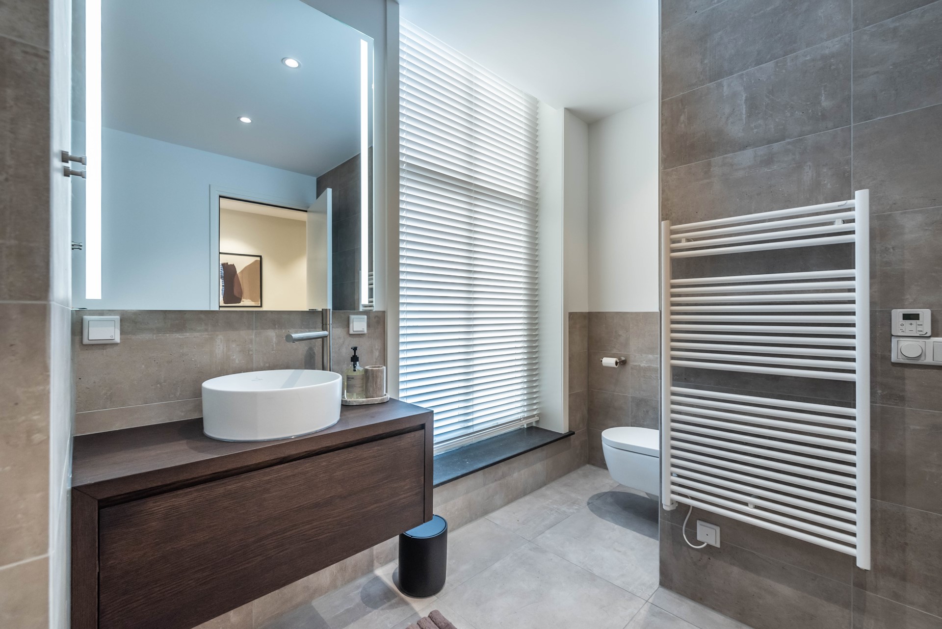 Adjacent to the master bedroom, in the center of the apartment, is the bathroom. It has a modern washbasin with cabinet, a modern shower, and a towel heater. Also accessible from the hall is a separate toilet with a small sink. Both the bathroom and toilet are decorated with beautiful marble tiles.