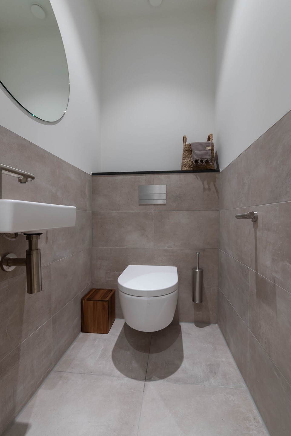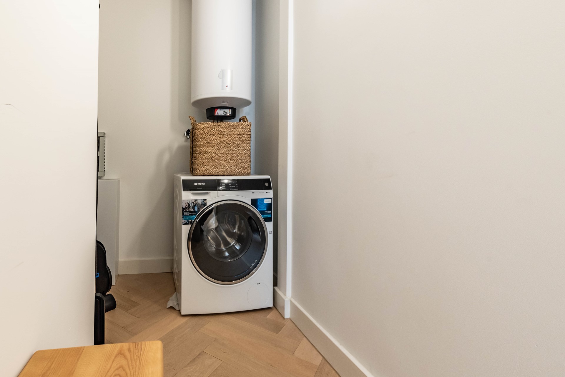 The living room also features a charming wooden dining table with four comfortable chairs. Adjacent to the dining area is the elegant open-plan kitchen, seamlessly blending style and functionality. The kitchen is equipped with all the essentials for preparing delightful meals, including a microwave/steam oven, Quooker, refrigerator, dishwasher, coffee machine, and toaster, all hidden behind a stylish black matte finish. Behind the wooden door in the kitchen, the heating system and washer/dryer combo are nicely