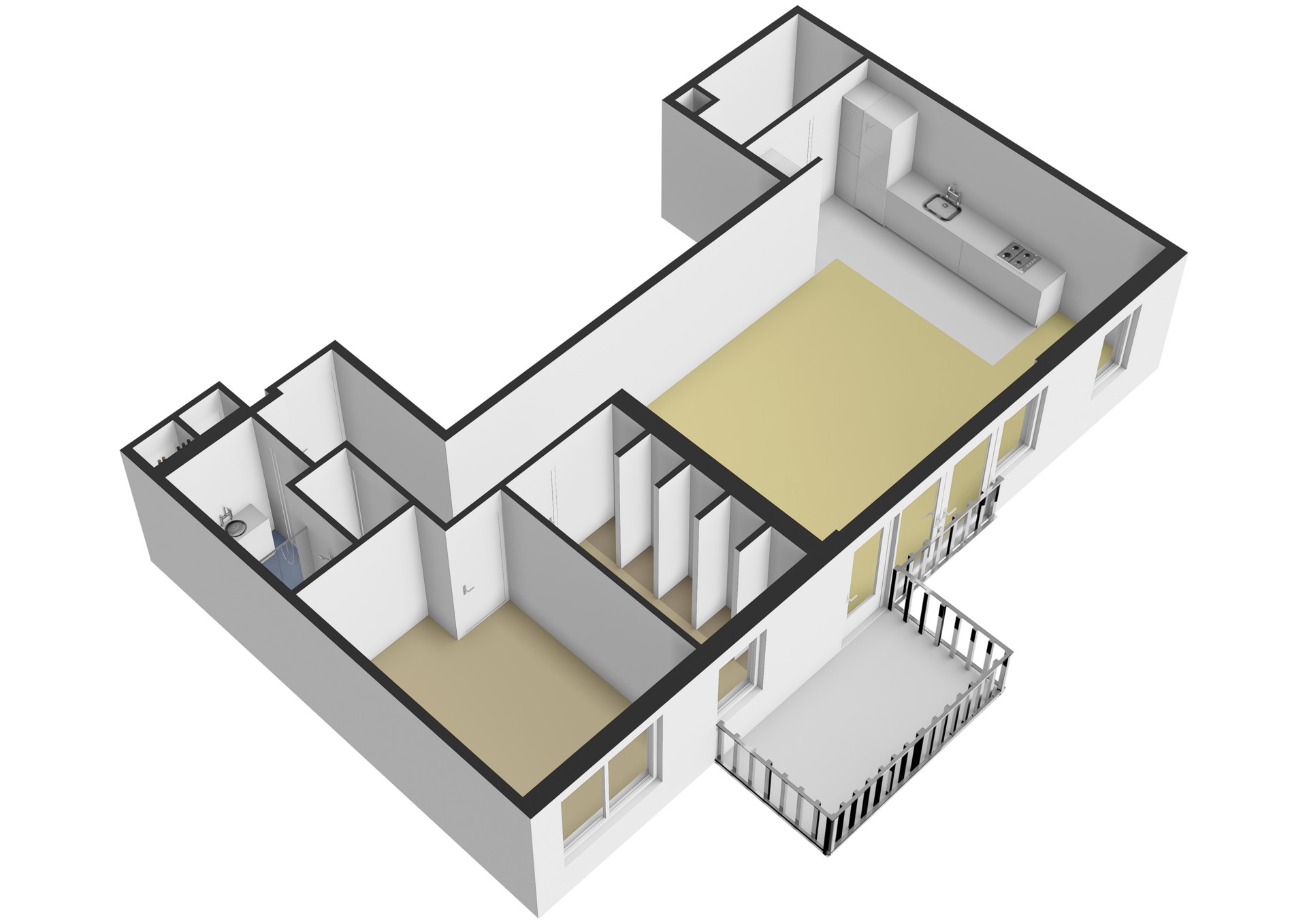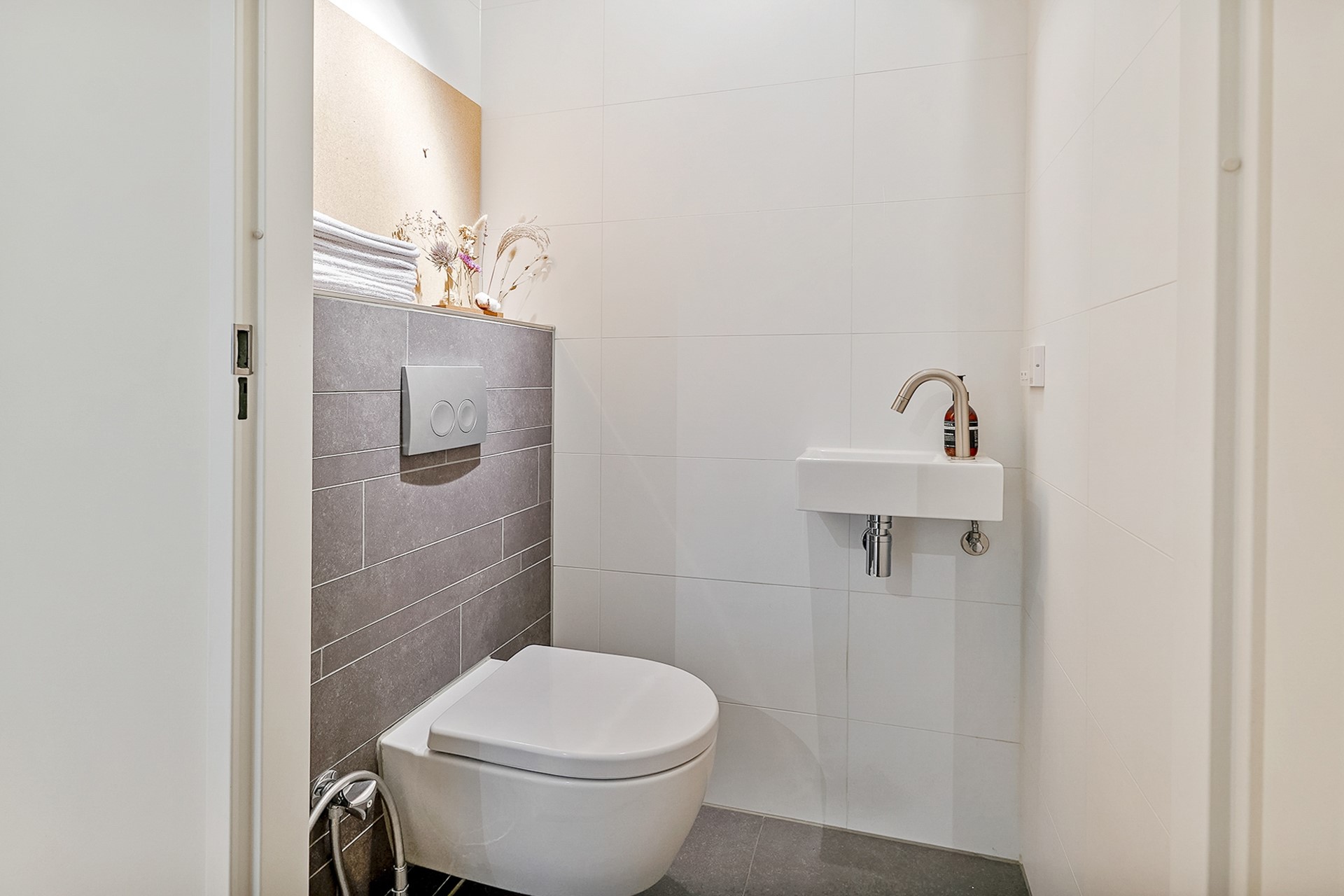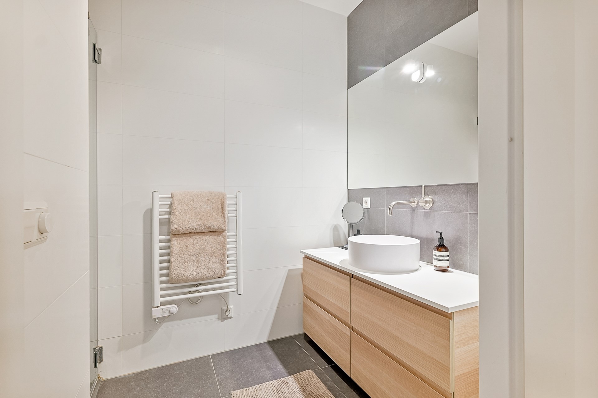 The bathroom is provided with a walk-in shower, washbasin with storage and towel radiator. There is a separate toilet in the hallway.