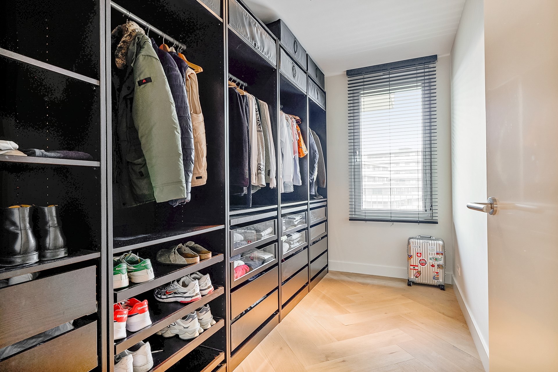 The second bedroom is currently in use as a walk-in closet. There is a possibility to remove half of the wardrobe to create an extra office space next to the window.
