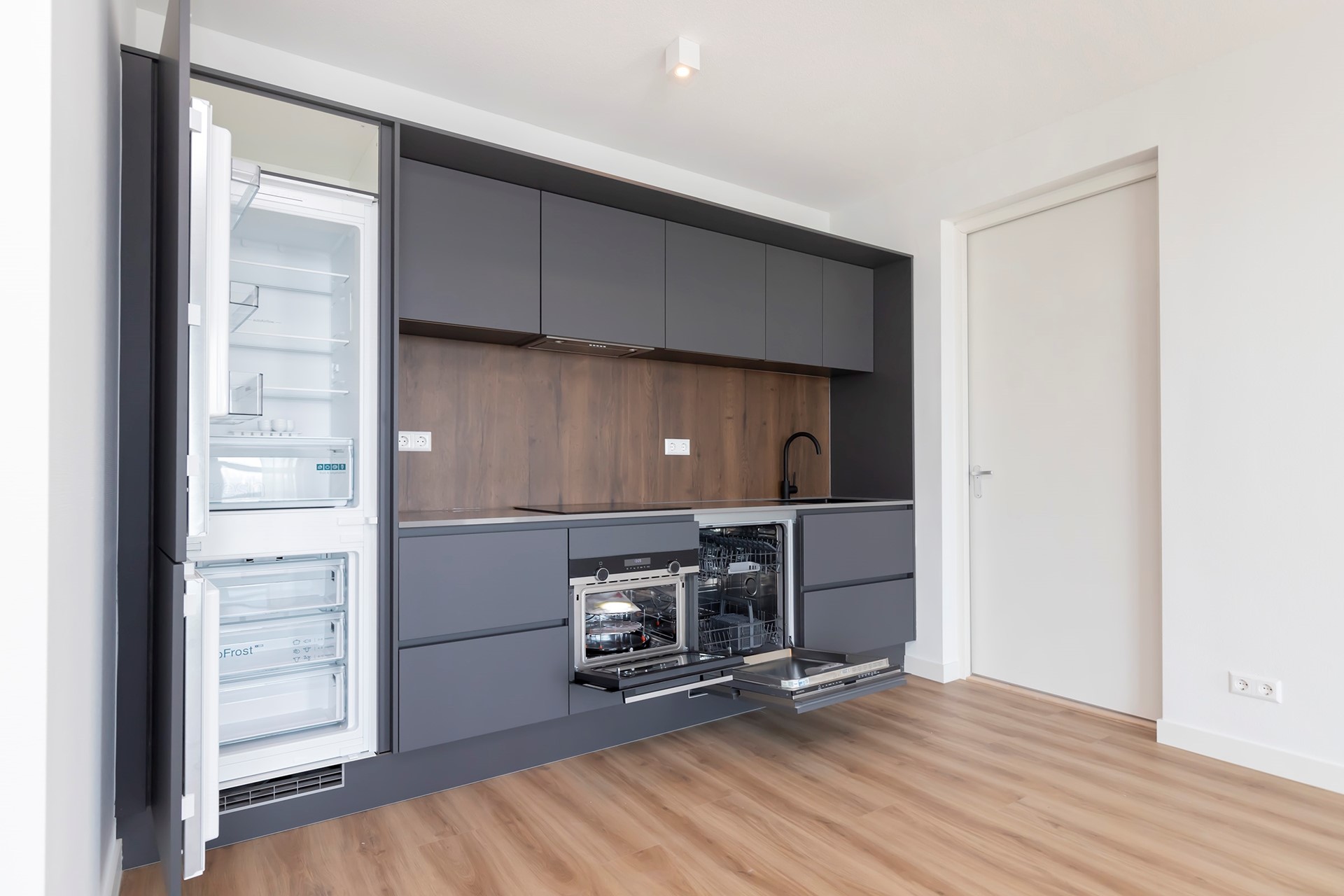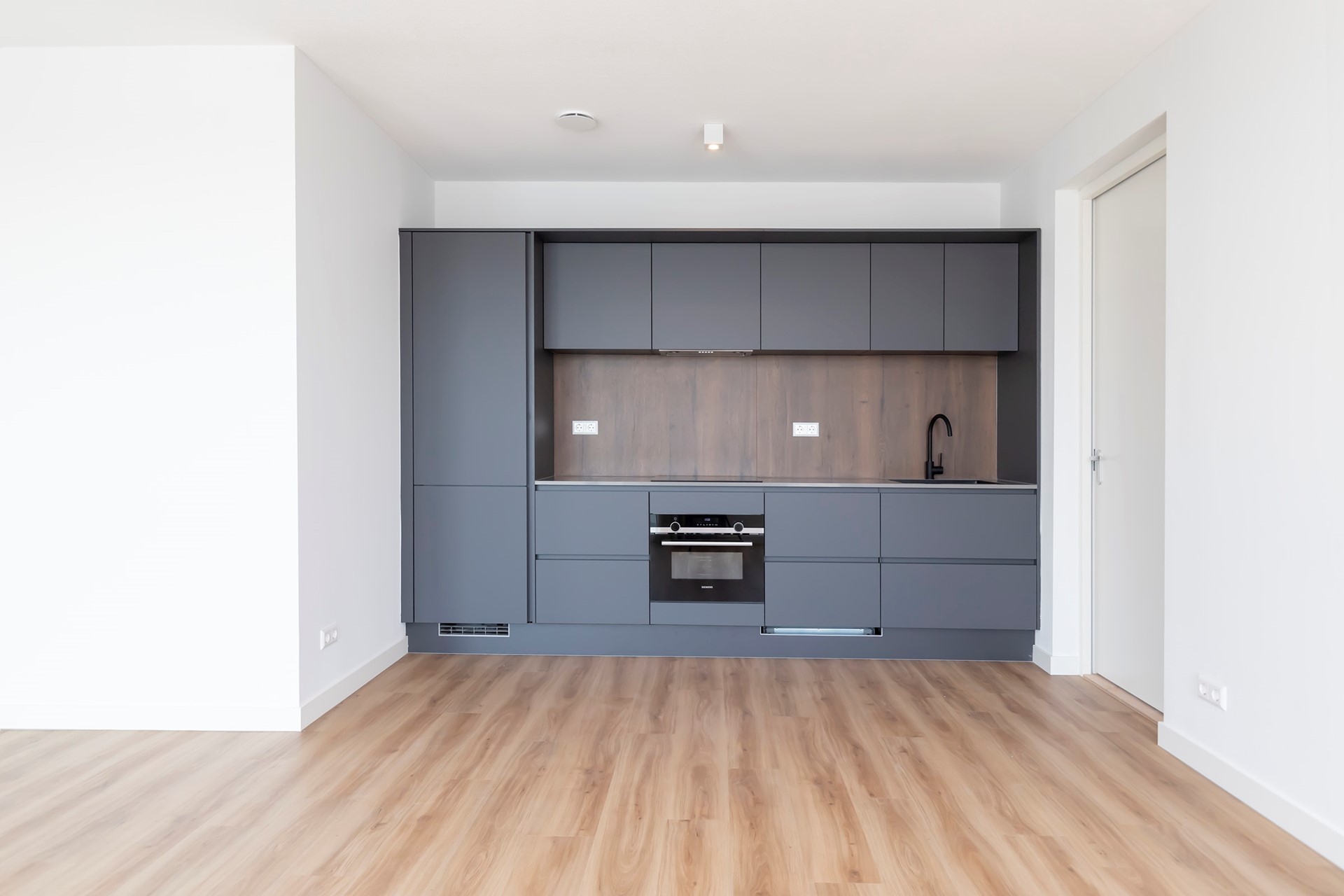 The apartment will be delivered in an unfurnished condition, including floor, fully equipped kitchen, curtains and ceiling lights.