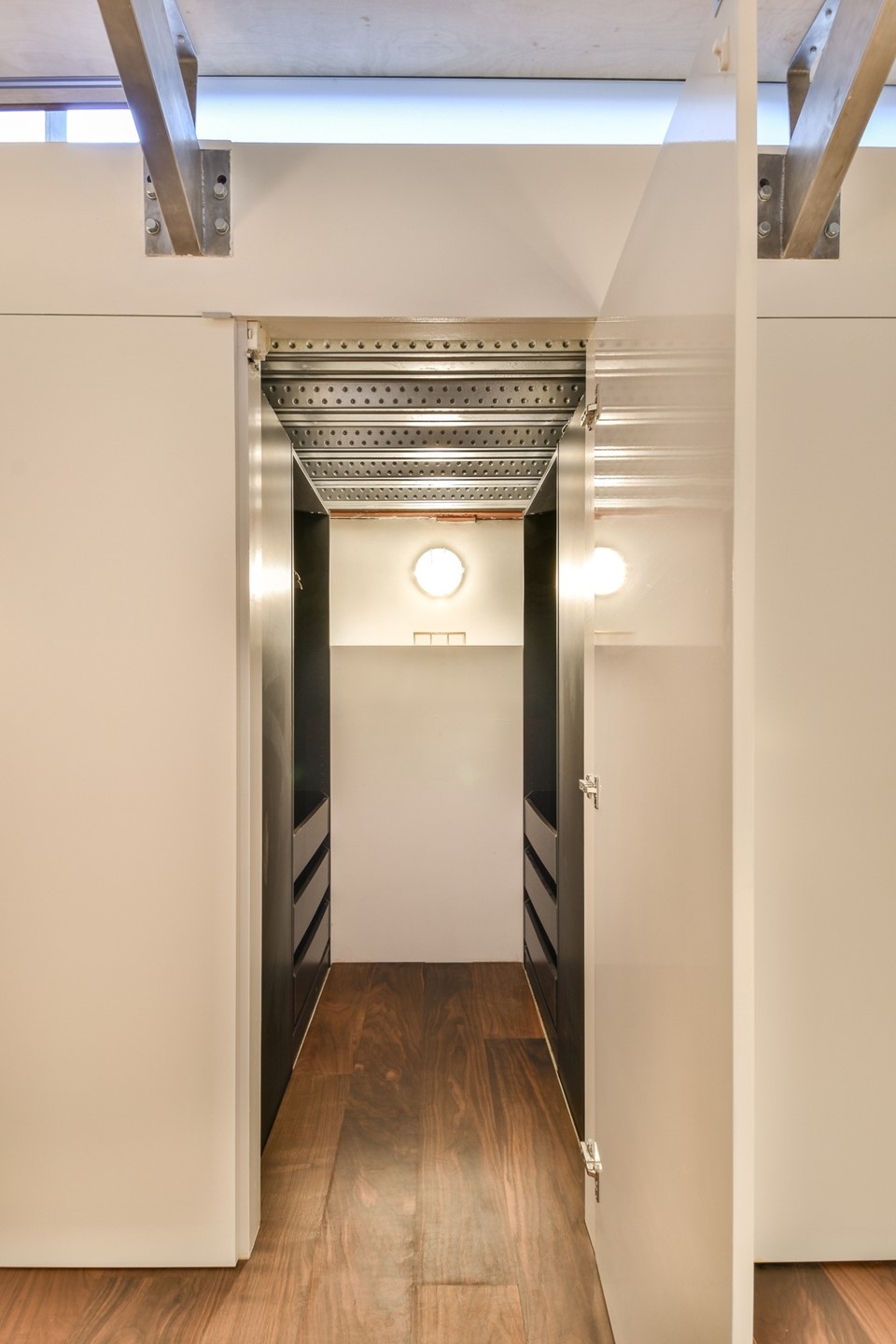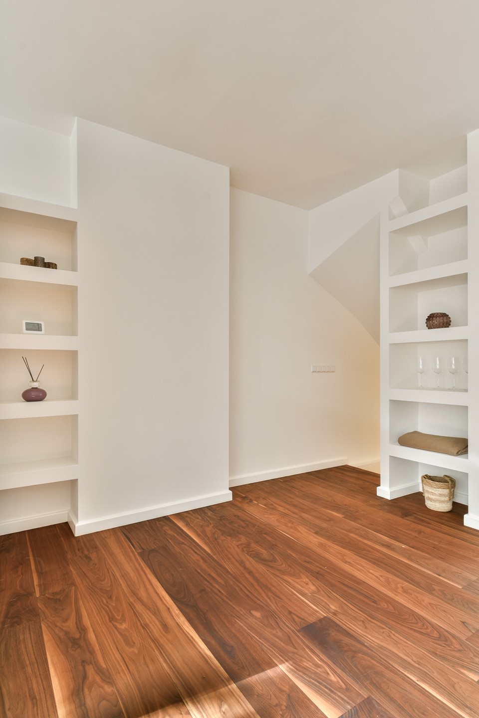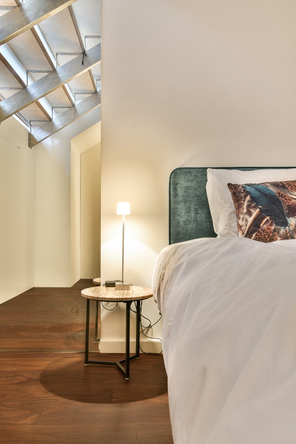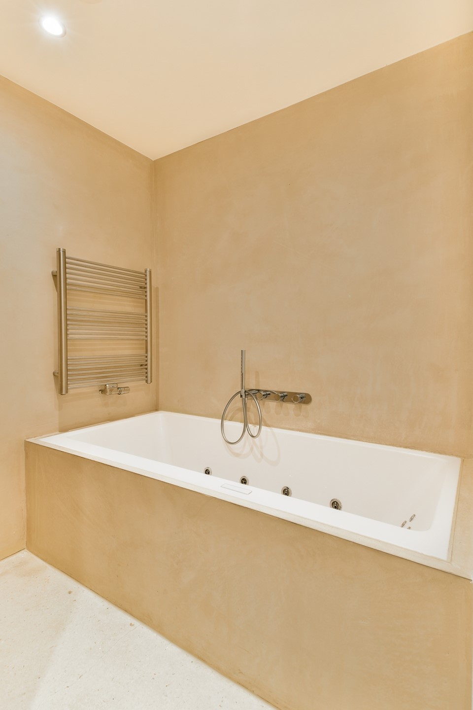 An internal staircase leads to the souterrain, where all the bedrooms are located. Two bedrooms feature double beds, with the master bedroom providing access to a walk-in closet. The third bedroom is set up as an office and comes with a desk, chair, and wardrobe. There is another smaller room which can be used as a storage. In the hallway, there is also a bathroom and a separate toilet. The bathroom includes a whirlpool bath and a walk-in shower.