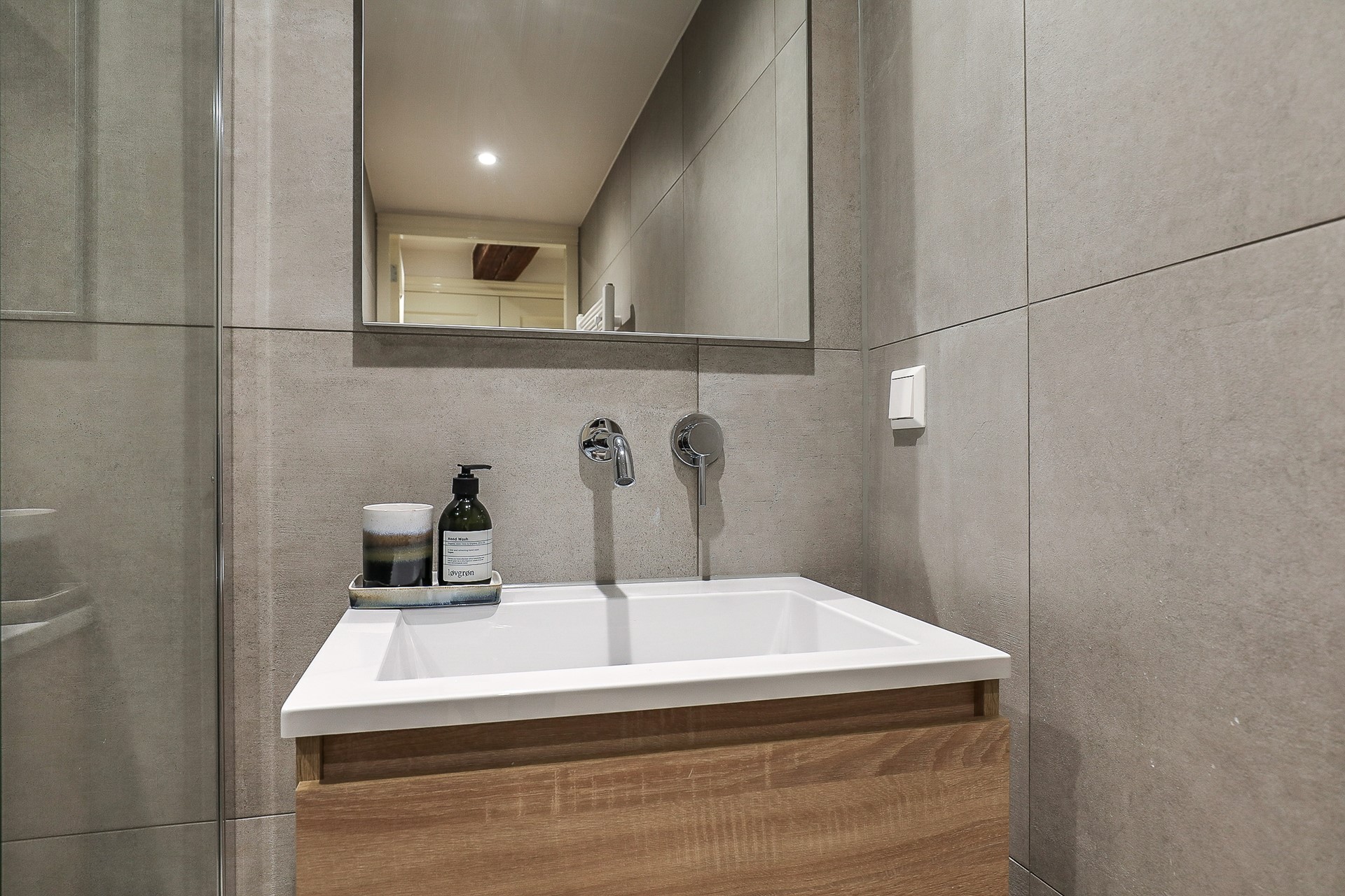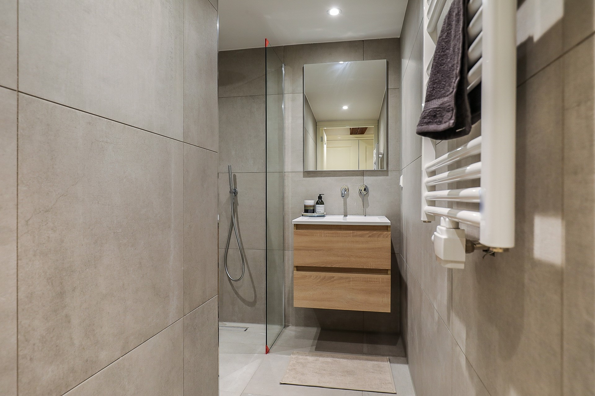 The second bathroom is fitted with a design radiator, washbasin cabinet with built-in tap, and a walk-in rain shower.