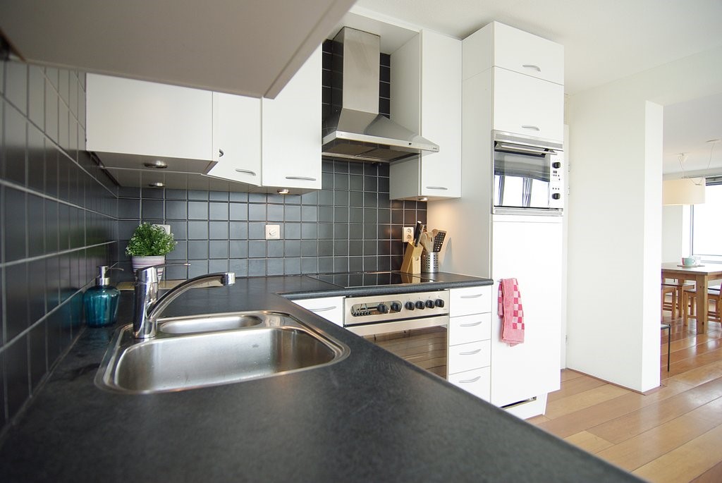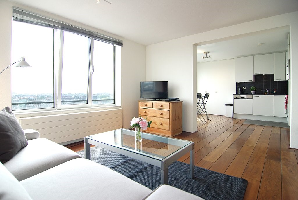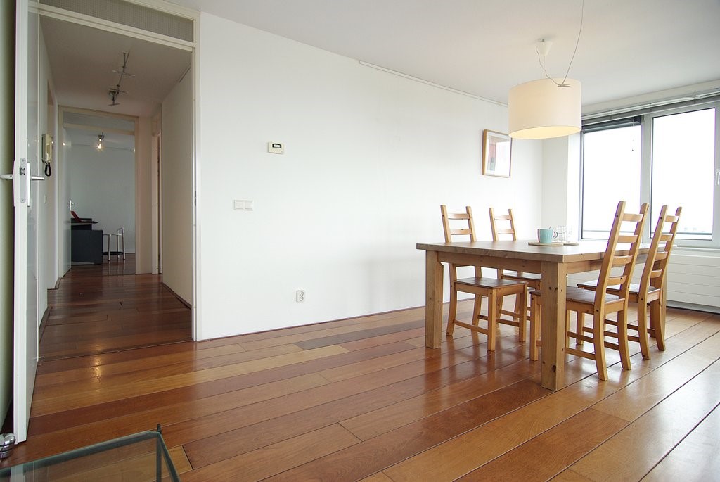 entrance on 13th. floor (with elevator), hallway, 2 bedrooms, bathroom with bath, storage room with washer and dryer machine, huge living room with wooden floors and great view over the Y river, dining area and semi open kitchen, fully equipped.