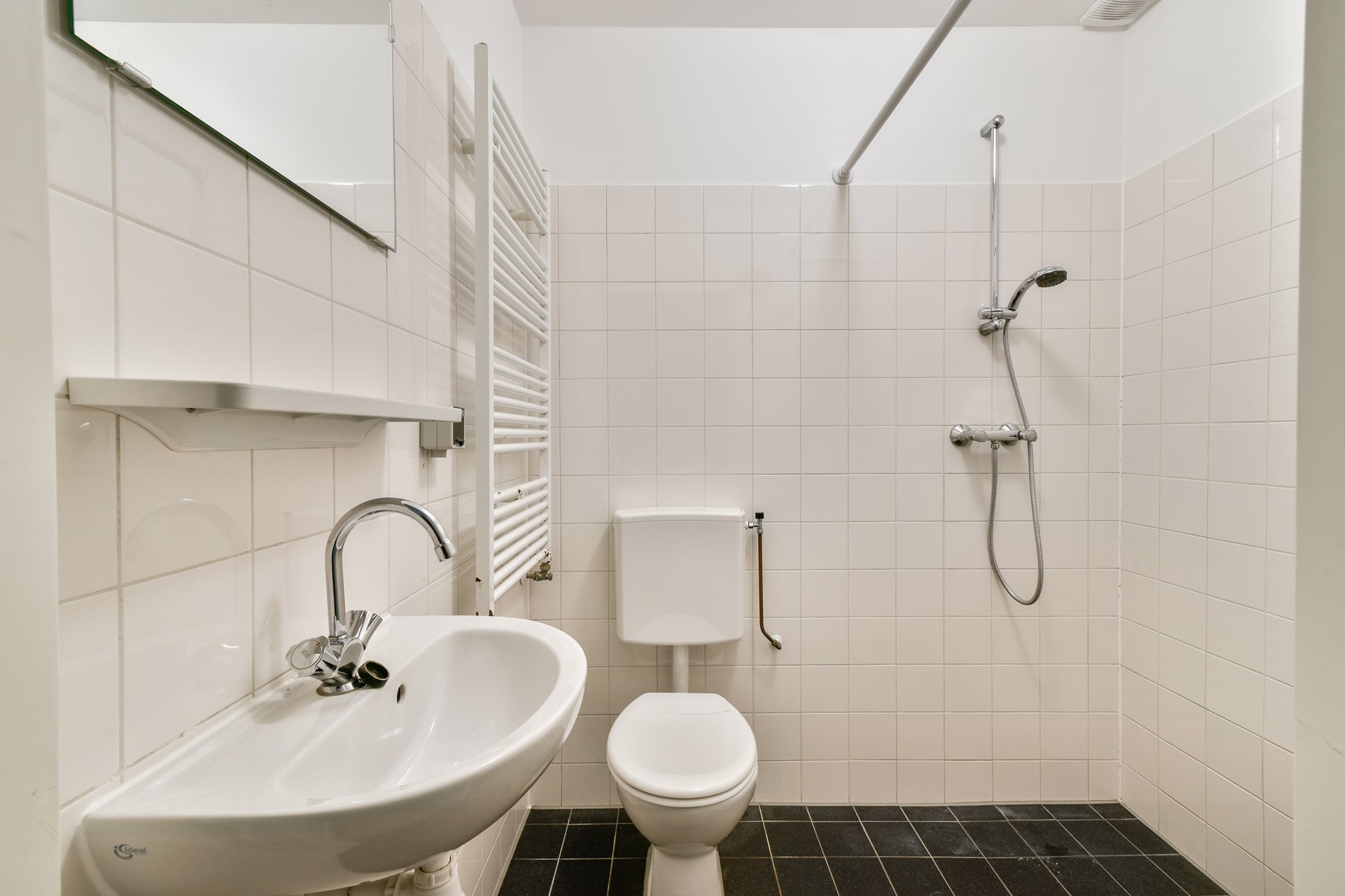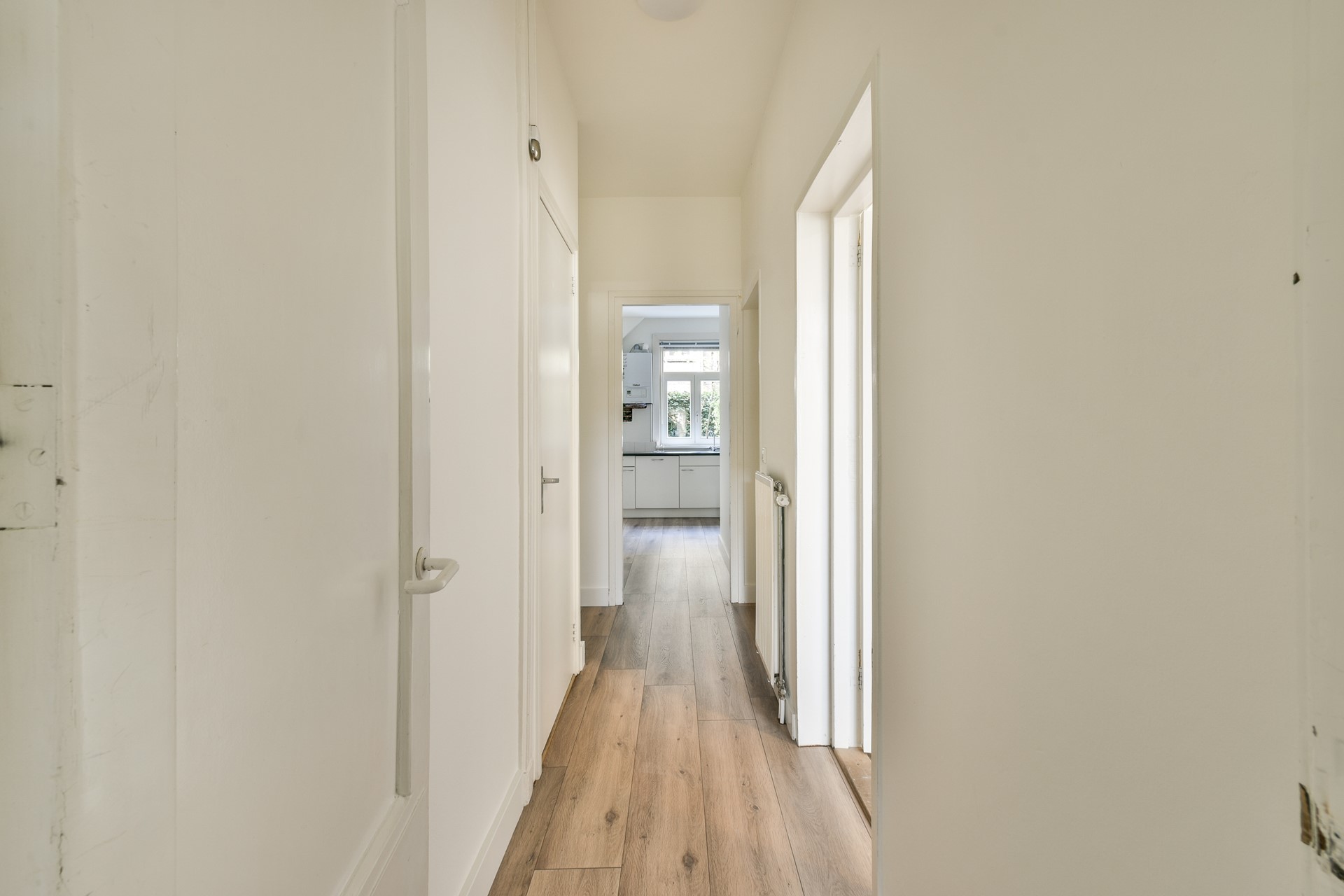 Private entrance with the living room directly on your right hand, next to the living room you will find the laundry area with connection for the washing/dryer and the bathroom with a sink, walk in shower, towel heater and toilet. On the end of the hall you will find the good sized bedroom with next the kitchen located, equipped with an oven, gas stove, integrated extractor hood and a dishwasher. From the kitchen you have acces to the private garden with a storage.