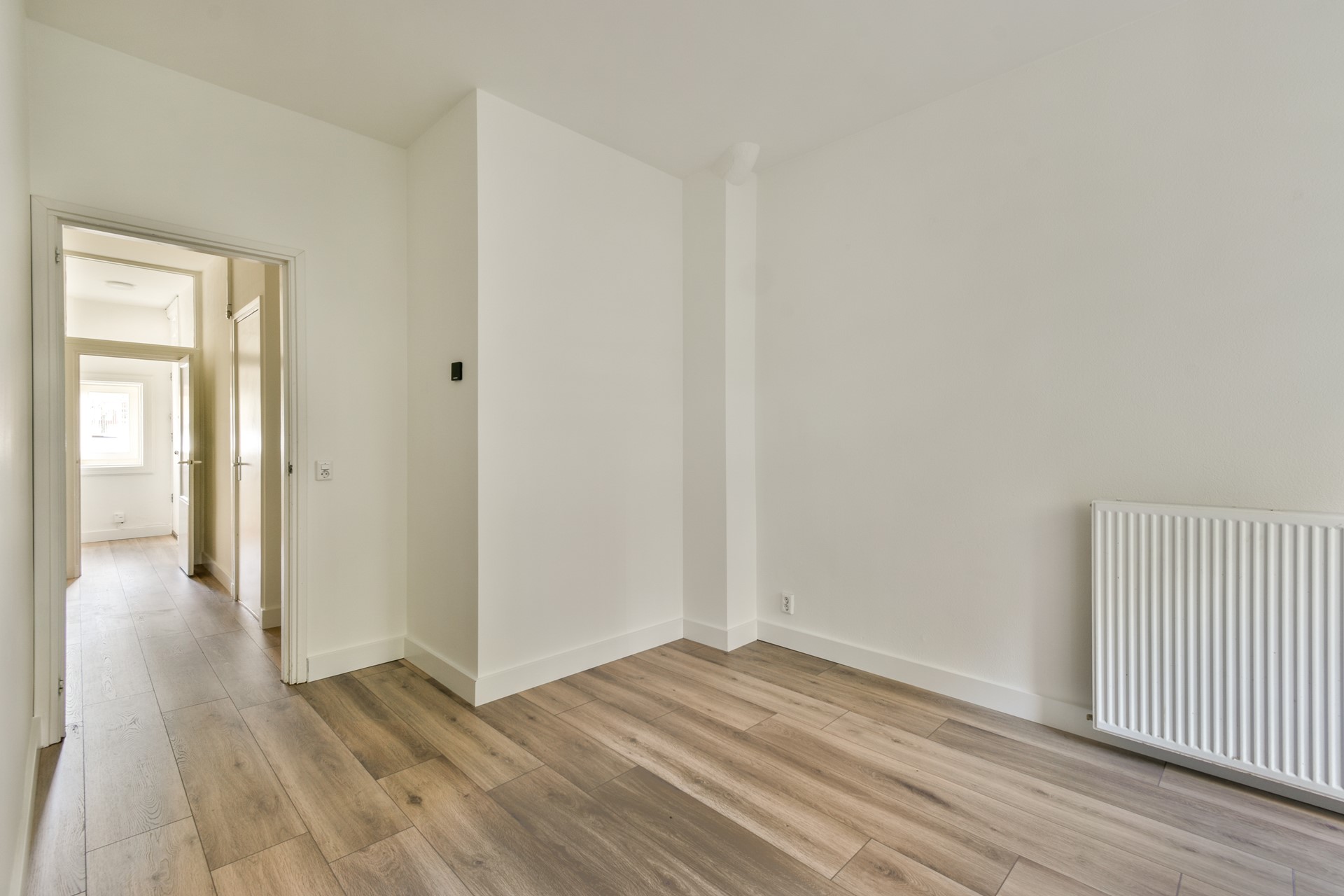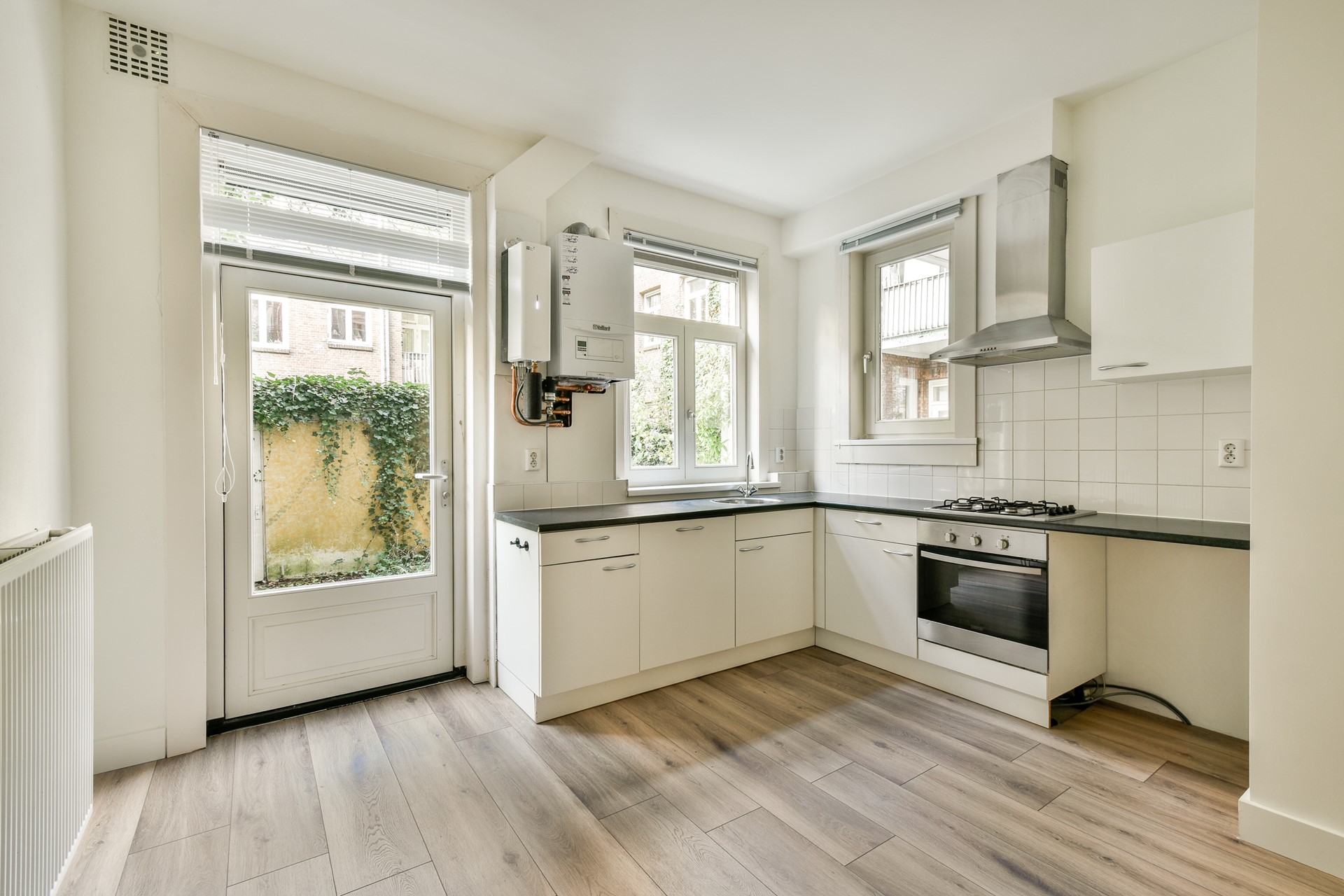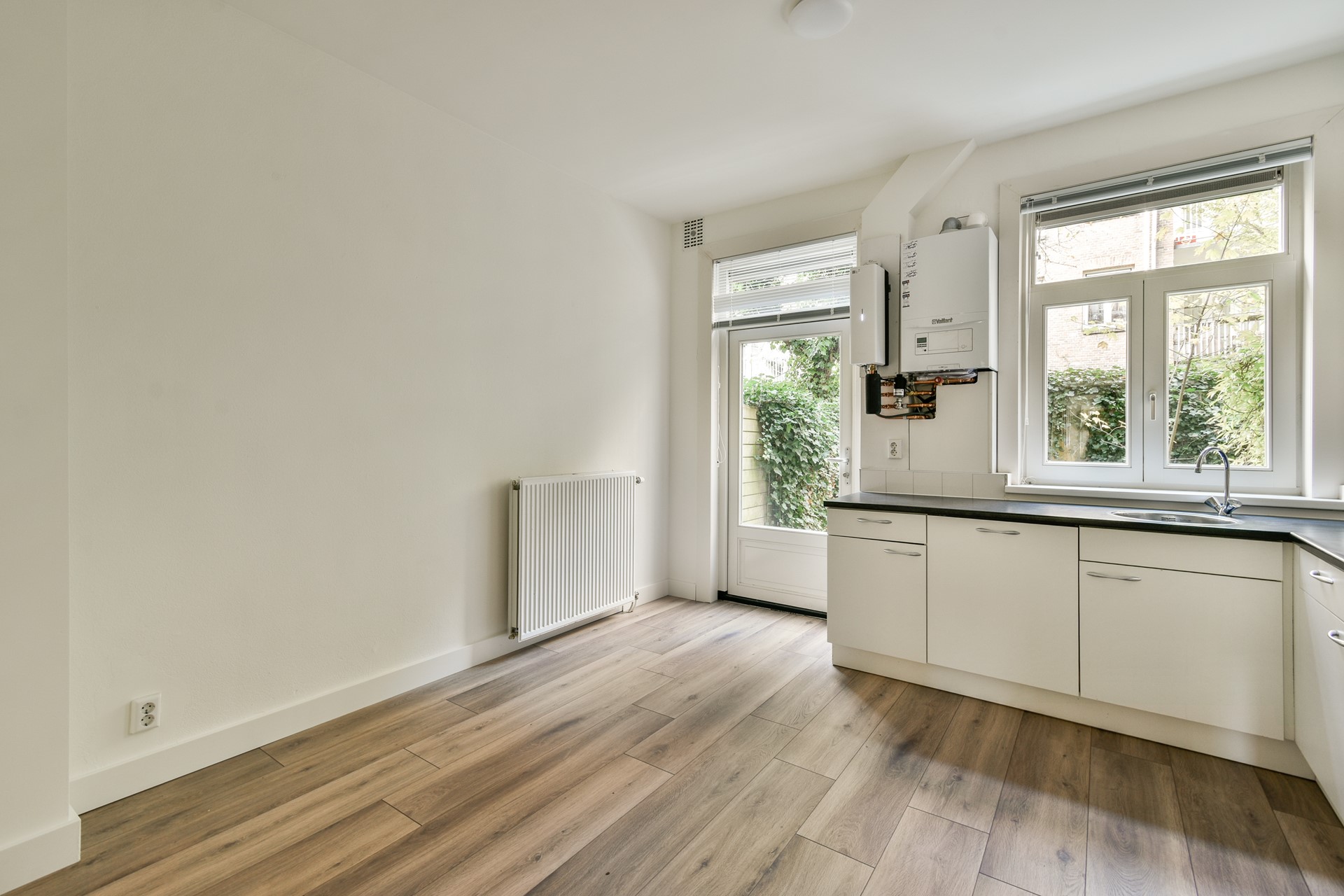Stunning ground floor apartment with an energy rating A+. This unfurnished 1 bedroom apartment comes with decent upholstering like laminate flooring, curtains/blinds and light fixtures. The apartment is located on a very quiet and green location. It offers a living room, spacious bedroom, spacious bathroom, laundry area with connection for washing/dryer and a spacious garden of 37m2 with external storage of ca. 5m2.