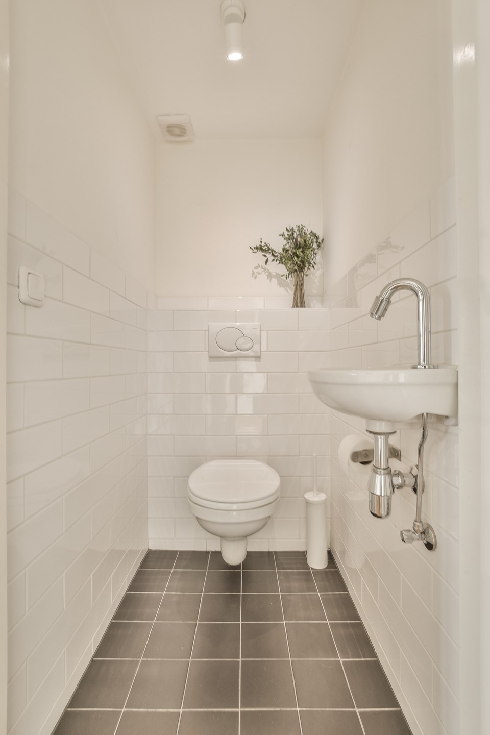 De badkamer is centraal gesitueerd en voorzien van een douche, dubbele wastafel, radiator en een ligbad. In de hal bevinden zich een separaat toilet met fontein, een meterkast met watermeter en een aparte ruime bergkast.