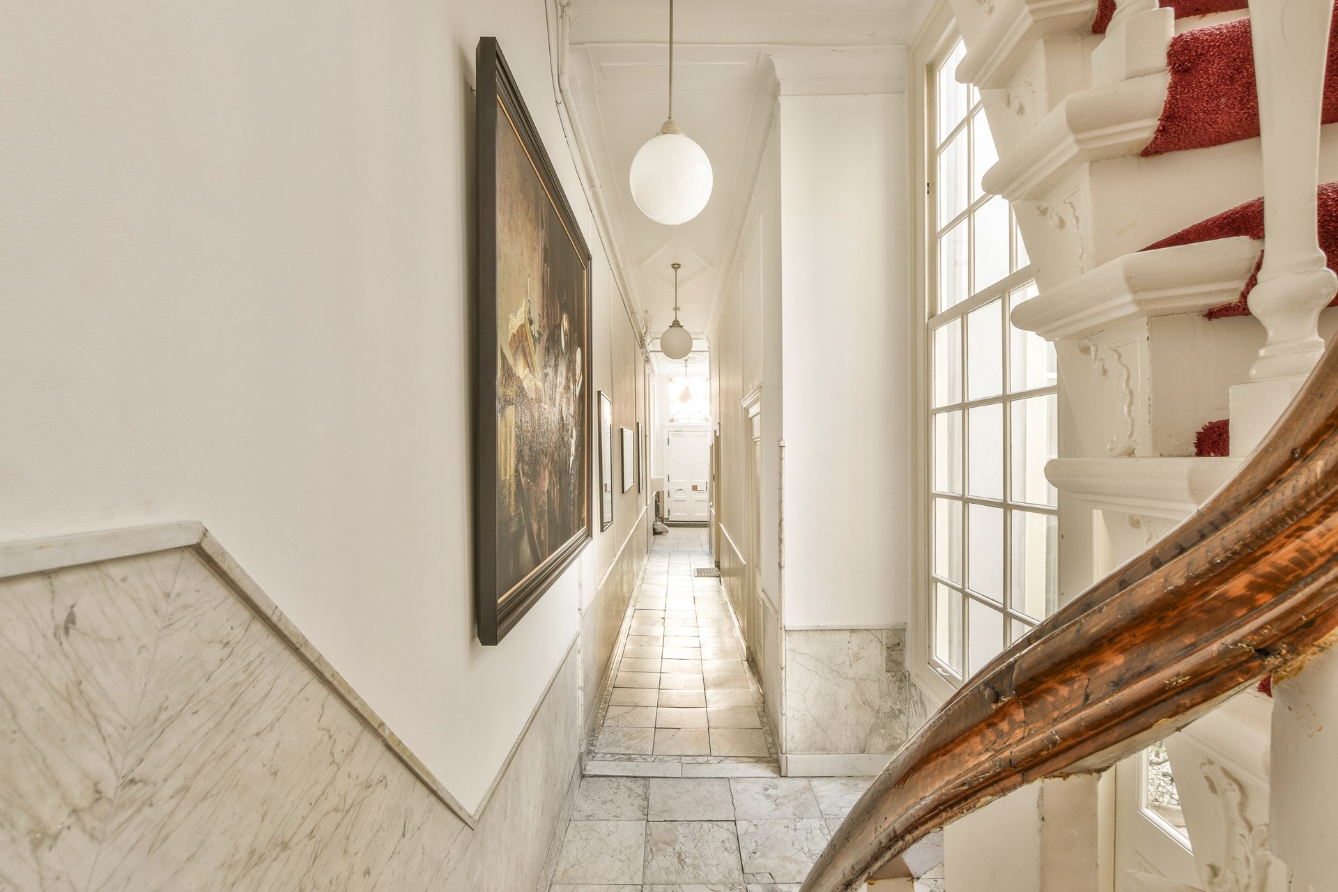 Via de monumentale bordes-trap aan de voorzijde van het indrukwekkende pand vindt u de entree. De fraaie vestibule met een marmeren vloer geeft gelijk het monumentale gevoel van dit rijksmonument weer.