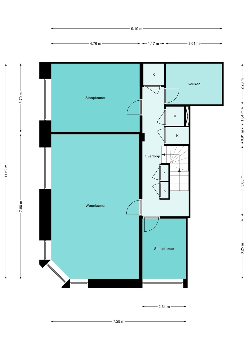 Ingang op de eerste verdieping; trap naar de 2e verdieping