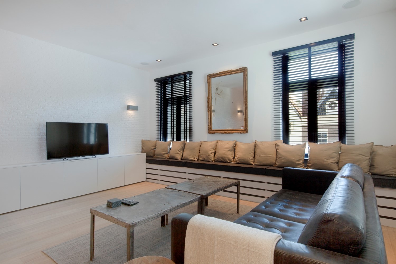 Het appartement vormt een sfeervolle mix van industrieel design, kunst en vintage elementen. De woonkamer heeft hoge plafonds en is ingericht met een vintage 3-zits leren bank en een kast met grote flatscreen Smart TV.
