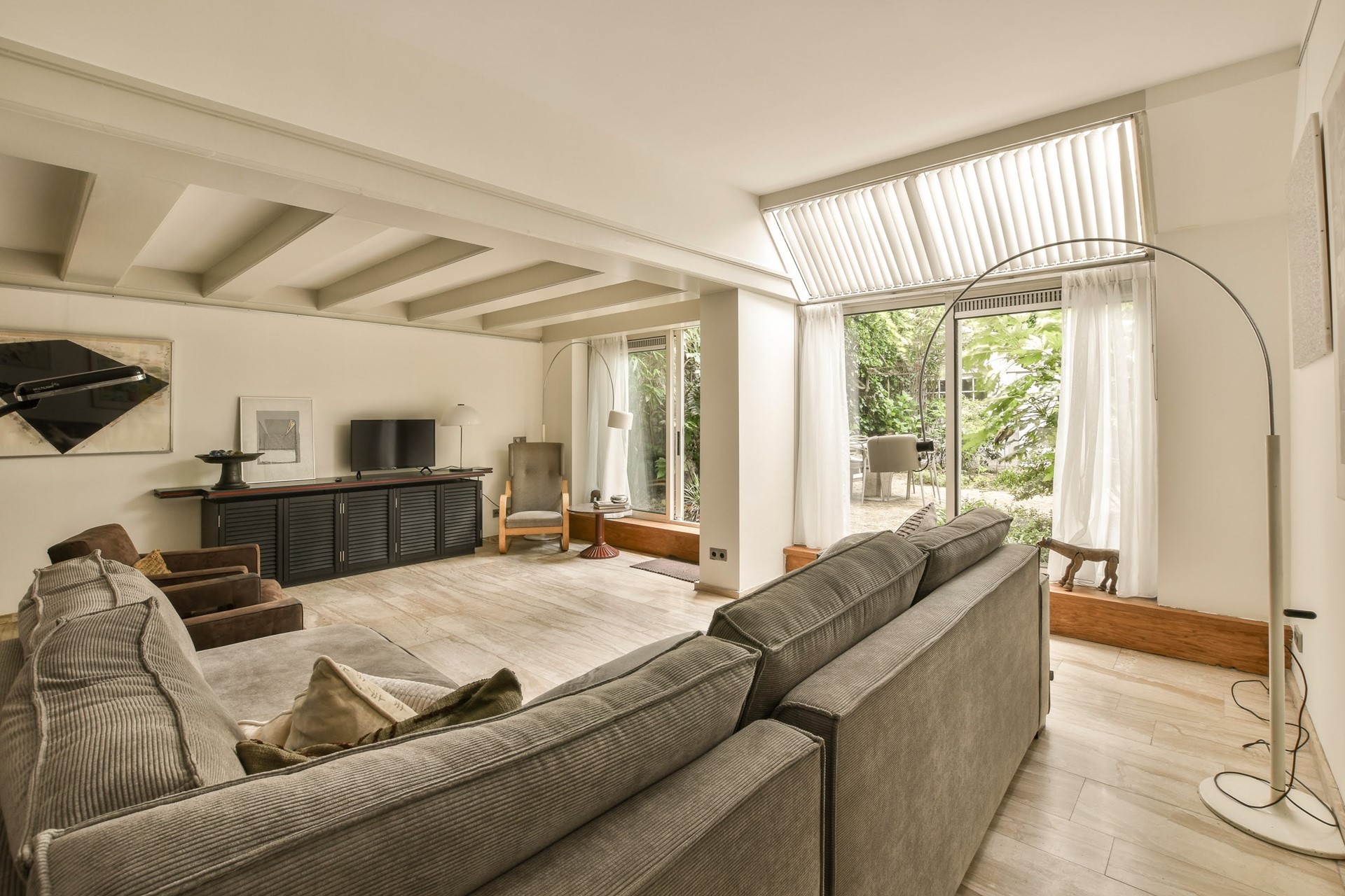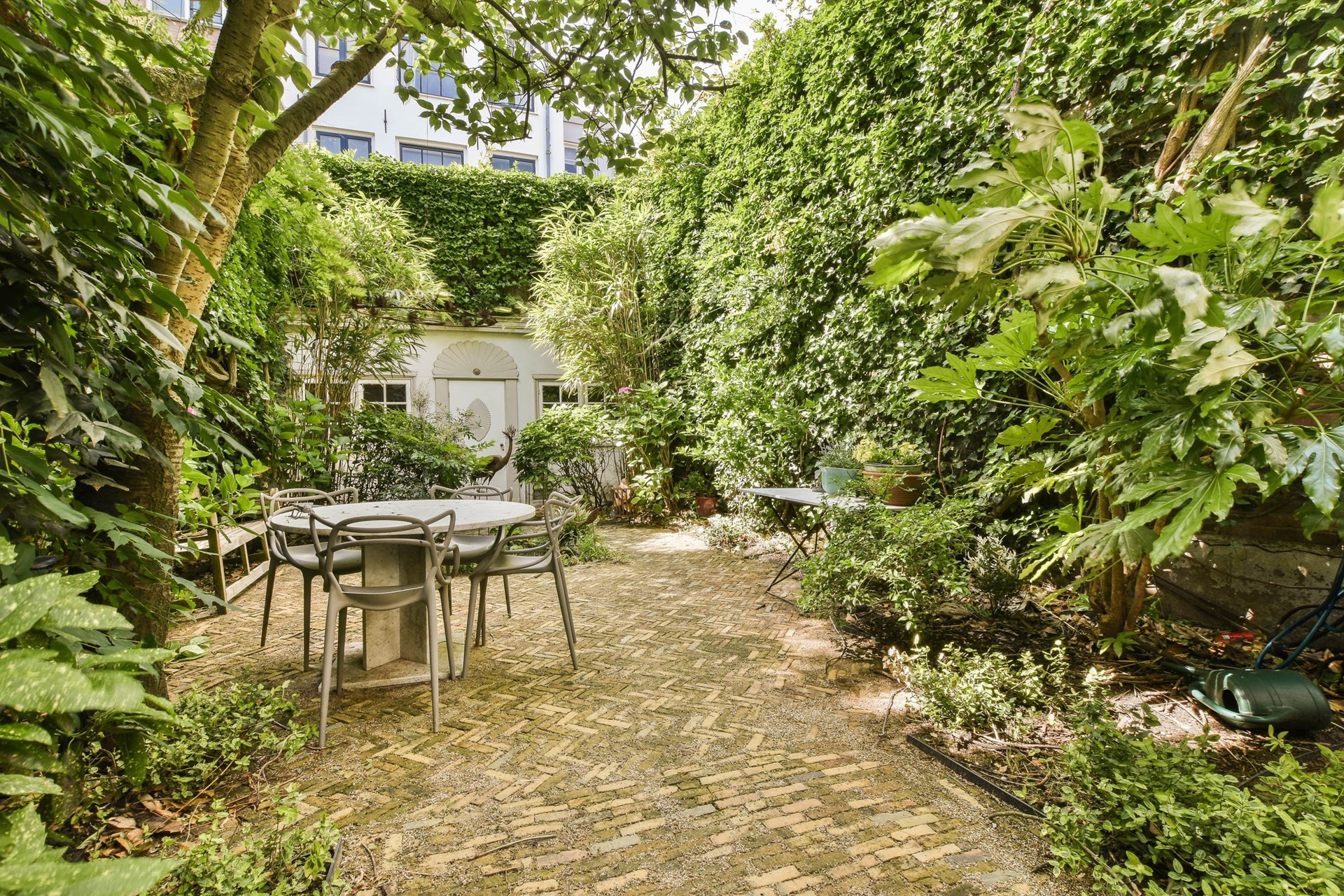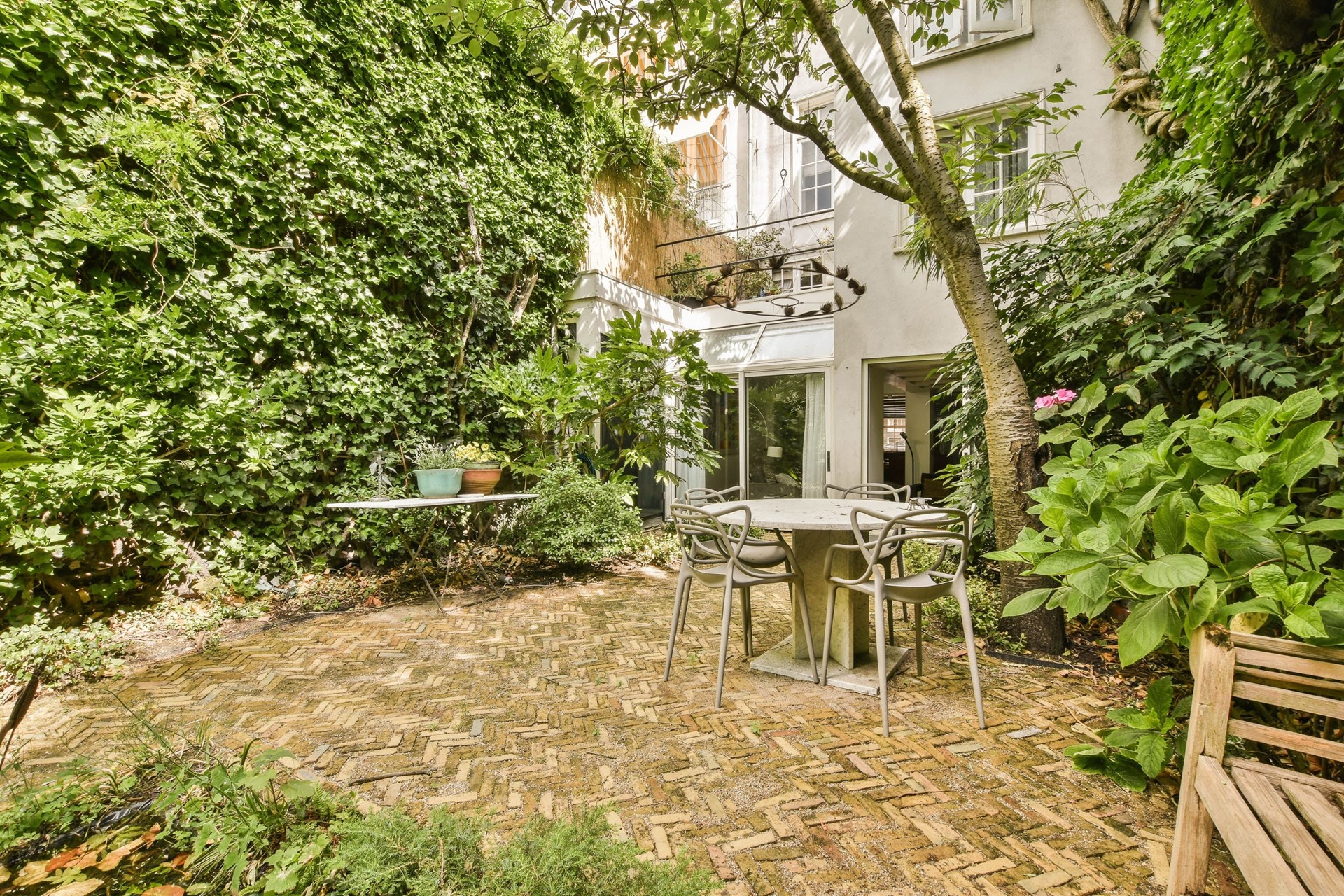 Private entrance on the ground floor. Through the hallway, you enter the living room, which is situated at the rear of the property. The living room provides access, through French doors, to the beautifully maintained garden with a garden house, currently used as a home office. The garden house also contains the washing machine and dryer.
