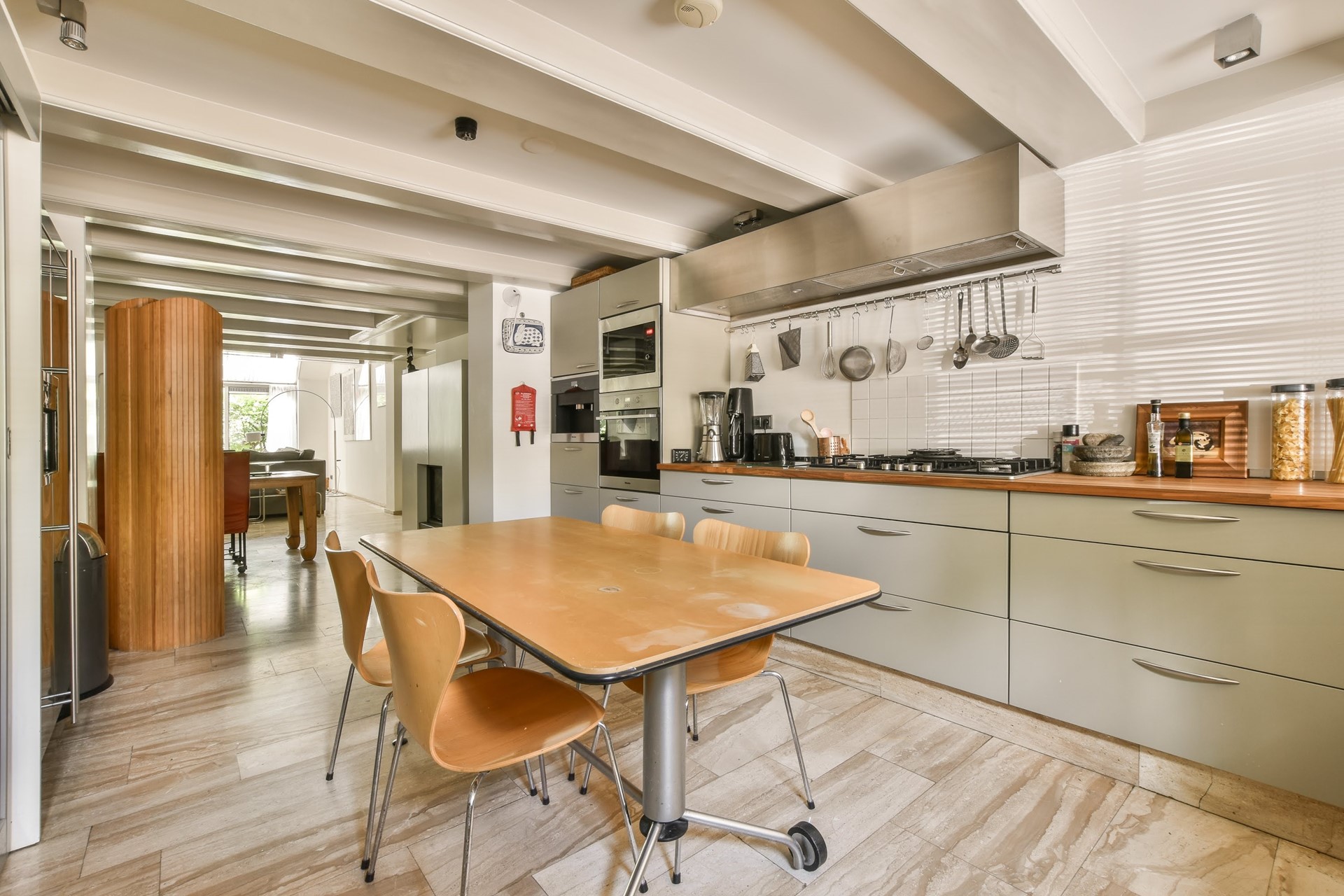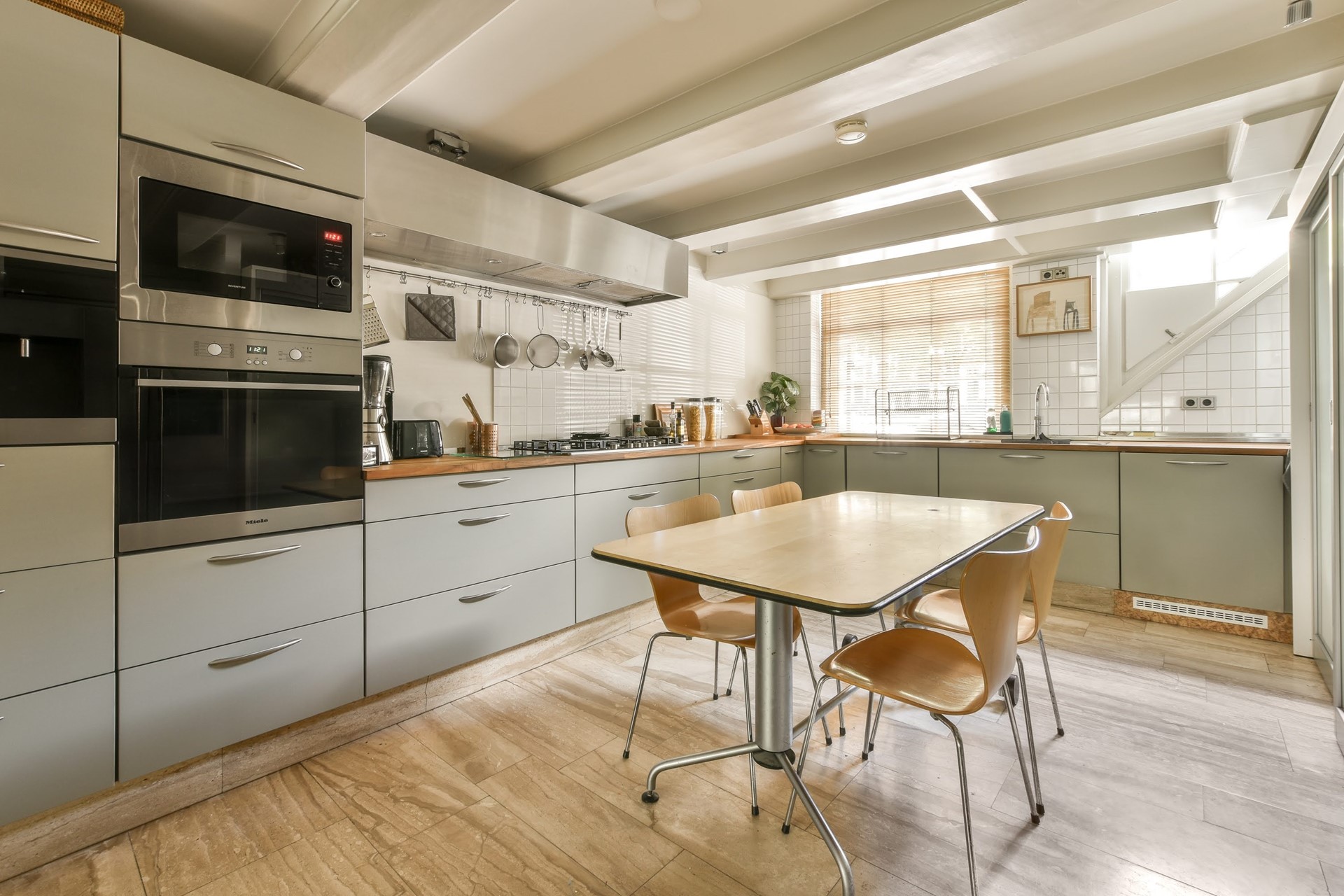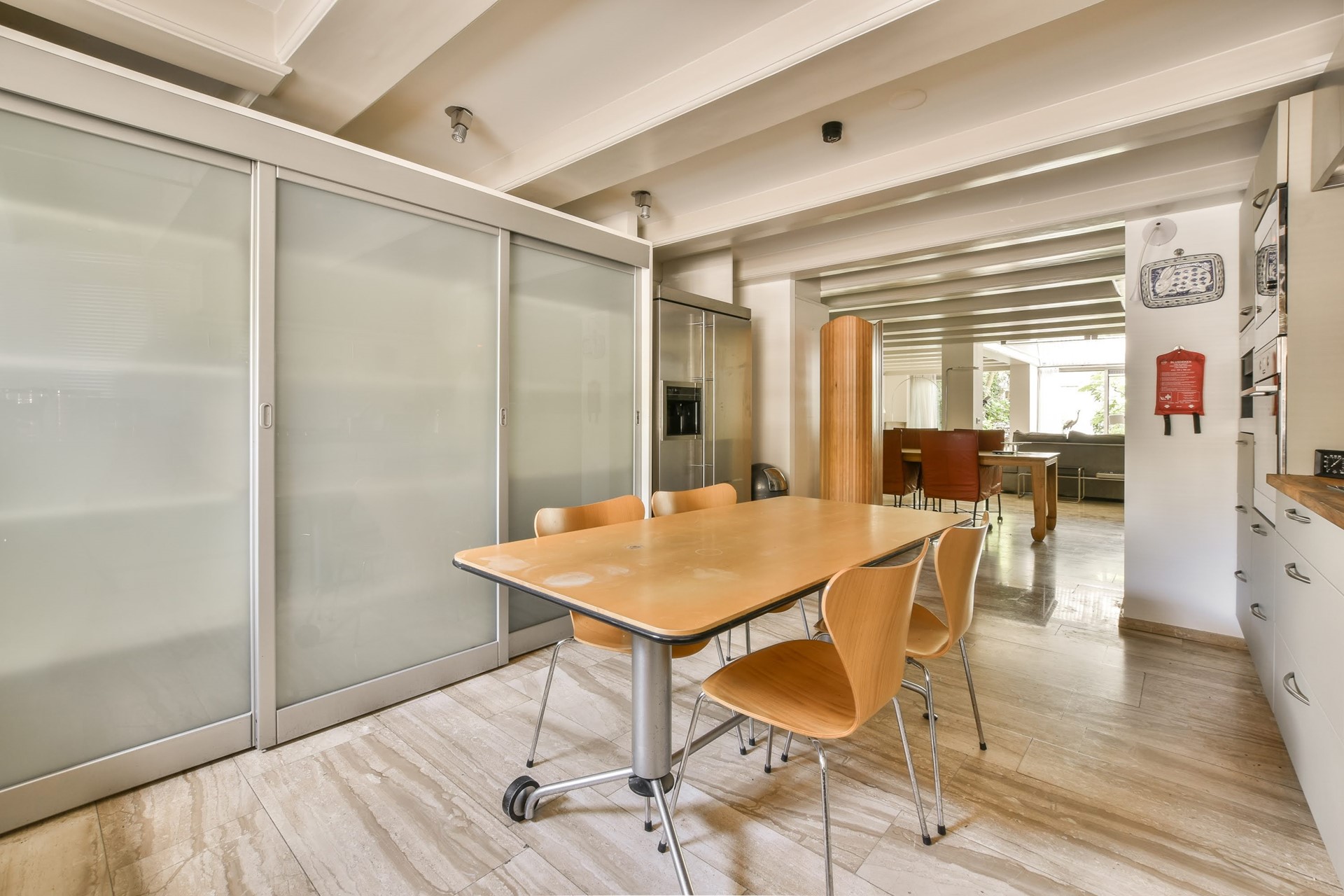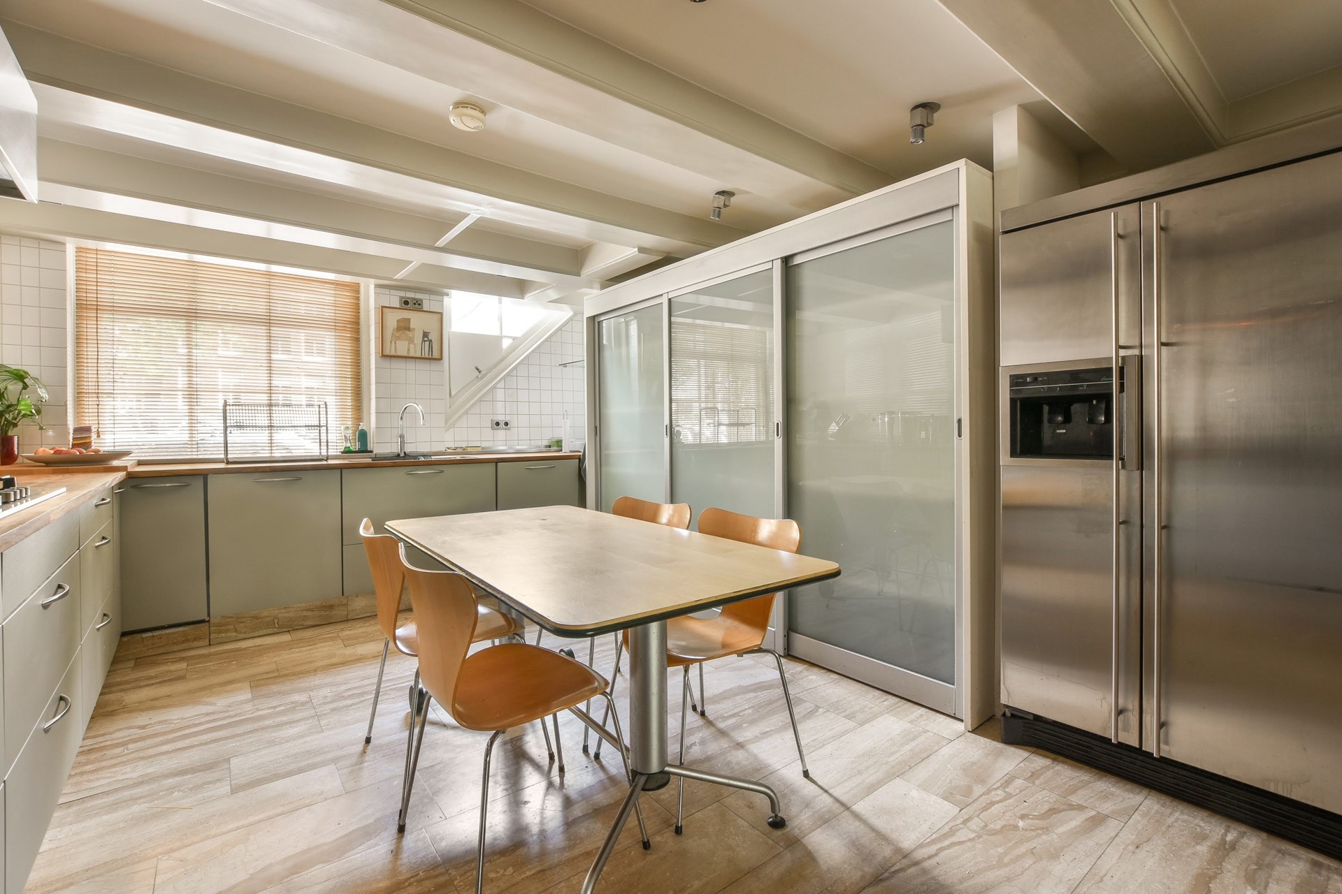 Aan de voorzijde van de woning is de eetkeuken met uitzicht op de gracht. De keuken is voorzien van een grote losstaande ijskast met vriezer, een gaskookplaat, een afwasmachine, een oven en een magnetron.