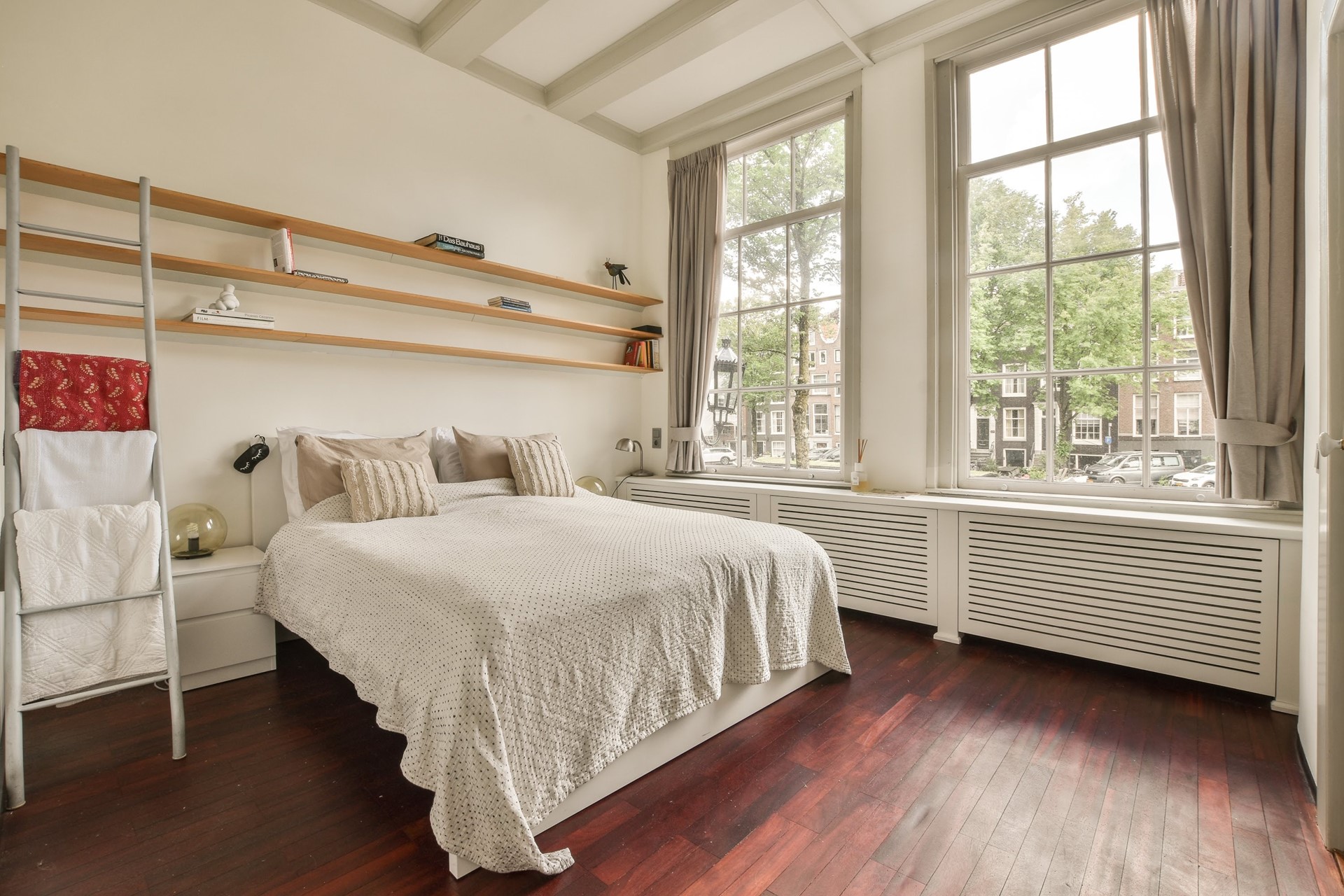 Via the internal staircase in the hallway, you reach the first floor with both bedrooms and the bathroom. At the front is the first bedroom, featuring a double bed and canal views. At the rear is the master bedroom, also equipped with a double bed and a walk-in closet. The bedroom also gives access to the terrace.