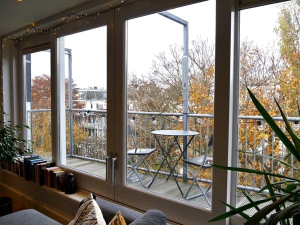 Entree, trap naar de 3e verdieping. Privé ingang met trap naar de bovenste verdieping. Open woonkamer met zit- en eetgedeelte. L-vormige keuken met alle ingebouwde apparatuur die je nodig hebt. Balkon over de volledige breedte van het balkon aan de achterzijde. Hal met aparte wc. 2 slaapkamers. Hoofdslaapkamer met grote inbouwkast en tweepersoonsbed. 2e slaapkamer met een eenpersoonsbed, ideaal te gebruiken als logeerkamer/studeerkamer. Badkamer met inloopdouche, wastafel en bad.