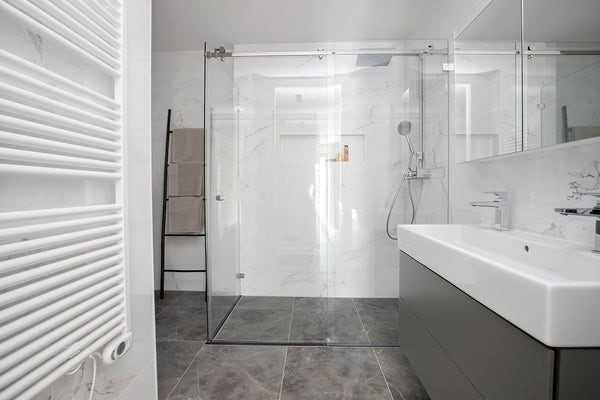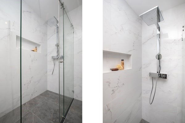 De moderne badkamer is voorzien van een ruime inloopdouche, luxe marmerlook tegels betegeld tot het plafond, dubbele wastafel en 2e toilet.