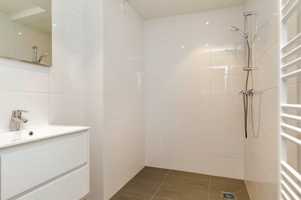 Het appartement beschikt over twee goed bemeten slaapkamers en een privé balkon van ca. 7 m². In de hal bevindt zich een praktische bergkast met wasmachine. De moderne badkamer is uitgerust met een douche en wastafel. Daarnaast is er een separaat toilet aanwezig.