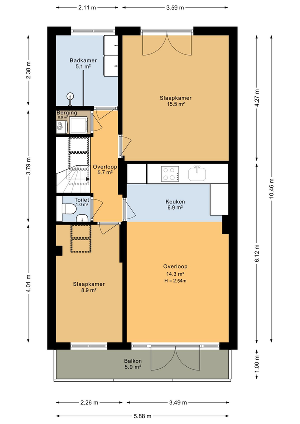 Het appartement ligt op de derde en tevens bovenste verdieping. Via een gedeelde entree kom je met de trap naar de derde verdieping. Je komt binnen in de hal welke toegang geeft tot alle ruimtes. In d ehal is een apart toilet met een fonteintje. De woonkamer met open keuken is licht en ruim. De keuken in voorzien van inbouwapparatuur zoals een koel-vries combinatie, gaskookplaat, combimagnteron, afzuigkap en een vaatwasser. Er zijn twee slaapkamers waardoor de woning ook geschikt is voor twee werkende delers. De badkamer heeft een douche, wastafel en een handoekradiator.