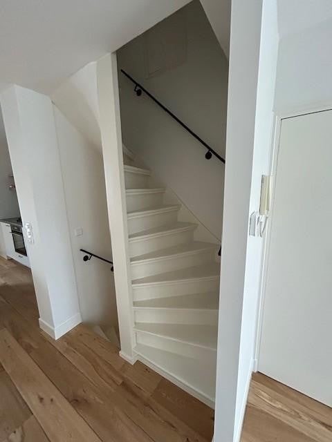 Via het trappenhuis bereik je de ruime en lichte woonverdieping. Hier bevindt zich de woonkamer met open keuken, voorzien van een strak “kookeiland” en moderne inbouwapparatuur. De grote ramen zorgen voor een prettige lichtinval en een open, warme sfeer. Daarnaast is er op deze verdieping een separaat toilet en een aparte ruimte voor de wasmachine en droger.