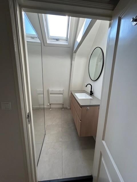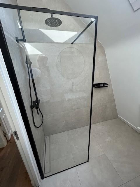 De badkamer is modern en stijlvol afgewerkt en beschikt over een inloopdouche en wastafel.