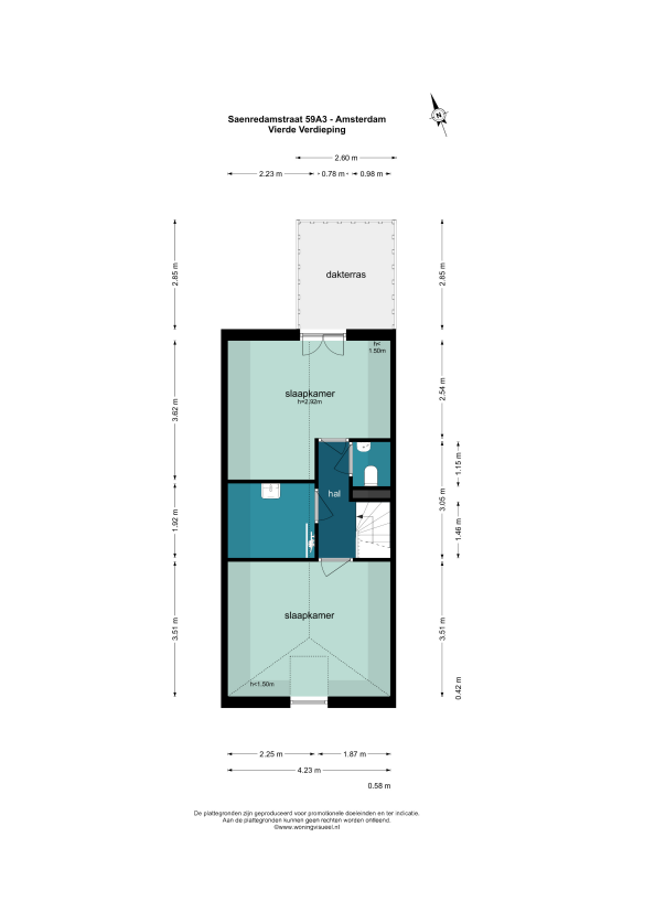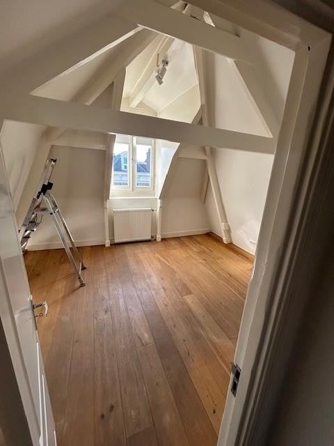 Op de vierde verdieping bevinden zich twee slaapkamers. Deze verdieping heeft een unieke uitstraling dankzij de hoge nok en zichtbare balken, wat zorgt voor een ruimtelijk en karaktervol geheel. Vanuit deze verdieping is er toegang tot het dakterras.
