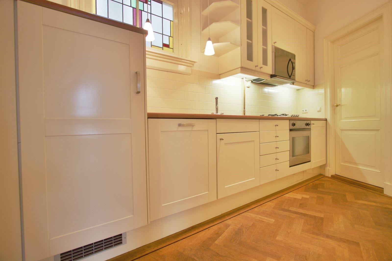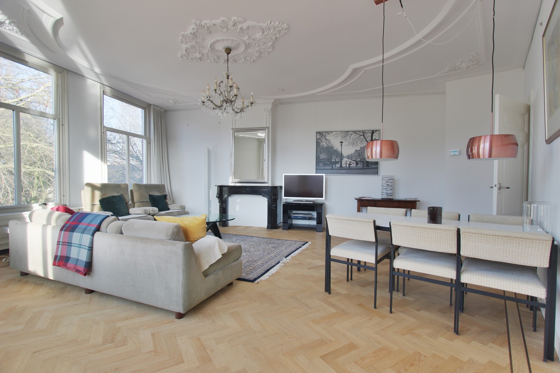 Light and bright living room in the front with 5 windows overlooking the "Rijksmuseum" with high ornamented ceiling wooden fishbone parquet floors throughout. Semi-open fully equipped kitchen. Side room with balcony.