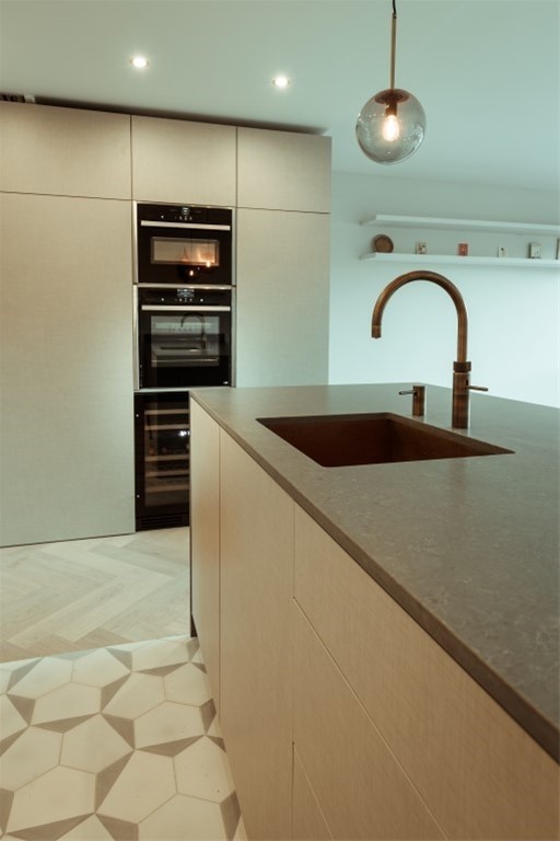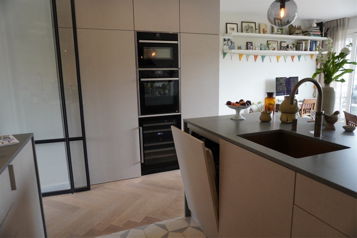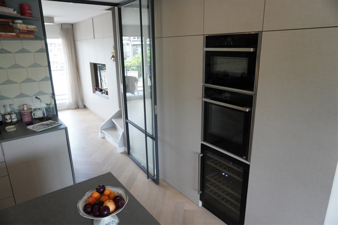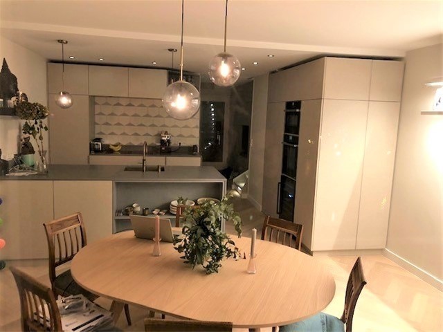 Dining area on the front with sliding doors to the balcony on the canal facing North East. Open fully equipped kitchen with brass farmers basin and tap with integrated Quooker, induction cooking hob, two ovens (combi micro and steam), large refrigerator and separate freezer, all from NEFF, and a large wine cooler. The apartment has numerous handmade cupboards to create optimal living and storage space.