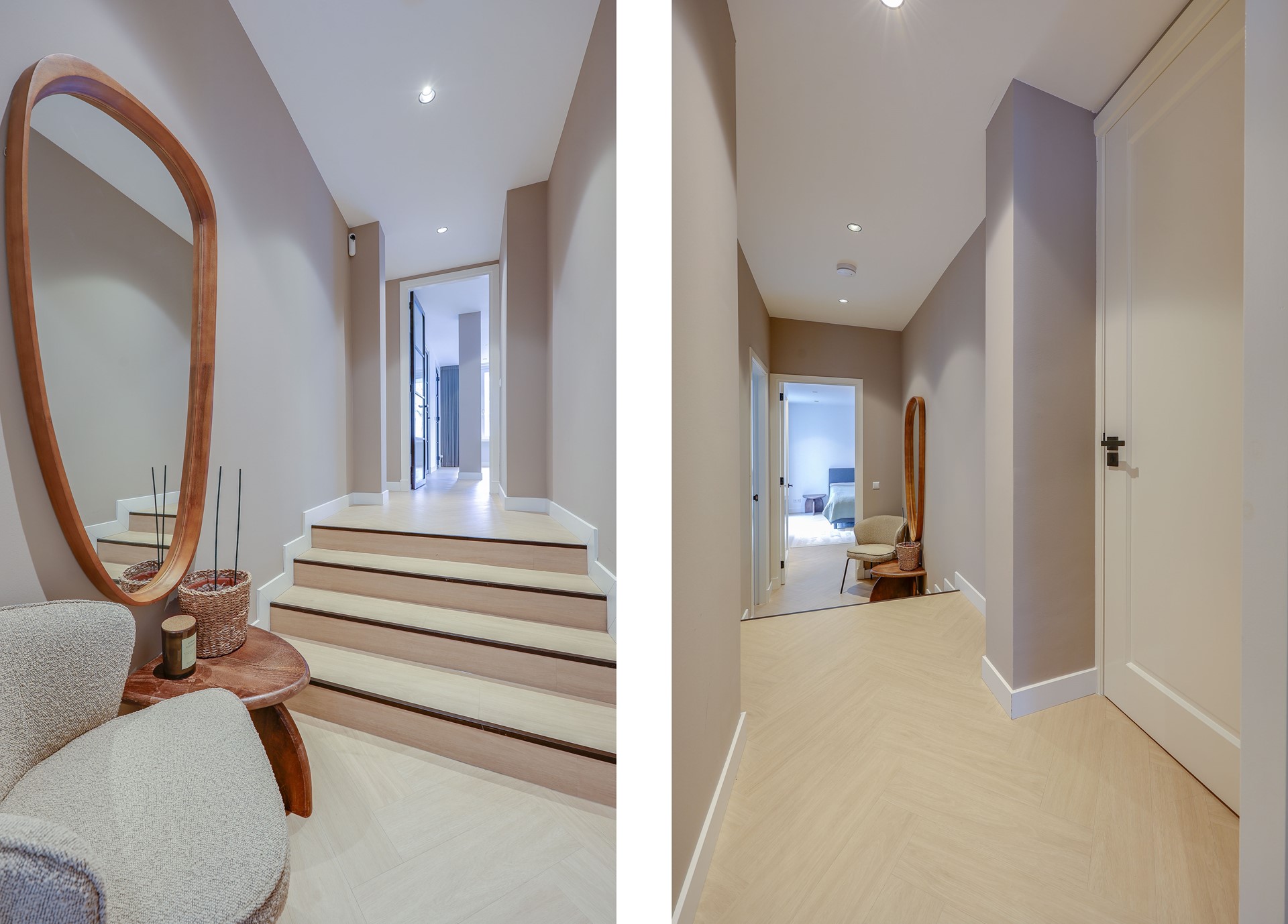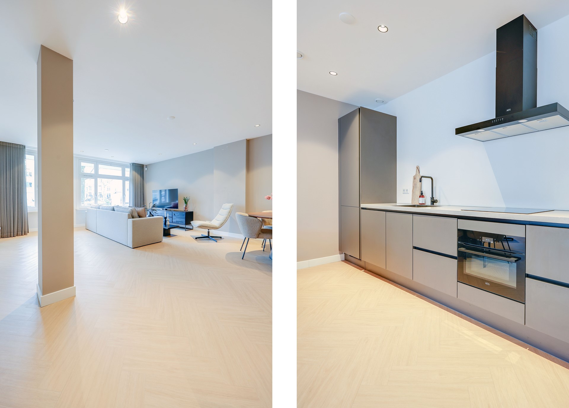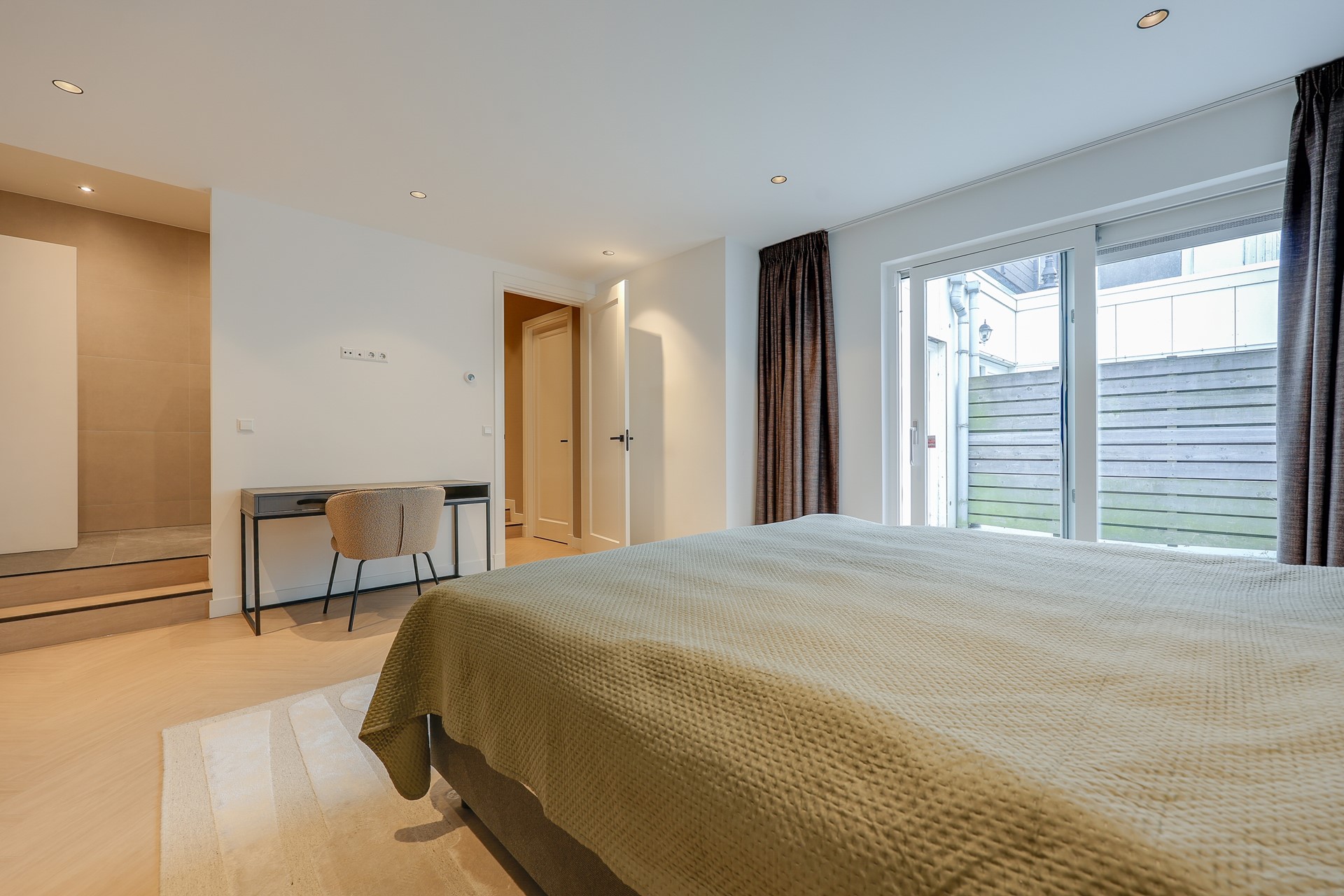 Het appartement is onlangs volledig gerenoveerd en voorzien van hoogwaardige moderne afwerking. Entree, modern toilet. Ruime woonkamer met prachtige visgraatvloer en luxe open keuken uitgevoerd in mat-antraciet en voorzien van hoogwaardige inbouwapparatuur. De eerste badkamer beschikt over een ruime inloopdouche met moderne touch. De ruime masterbedroom beschikt over een eigen en-suite badkamer met inloopdouche, wastafel en toilet. Tweede slaapkamer is tevens zeer ruim. De patio/het terras is aan de achterzijde gelegen en bereikbaar via de schuifdeuren van beide slaapkamers.
