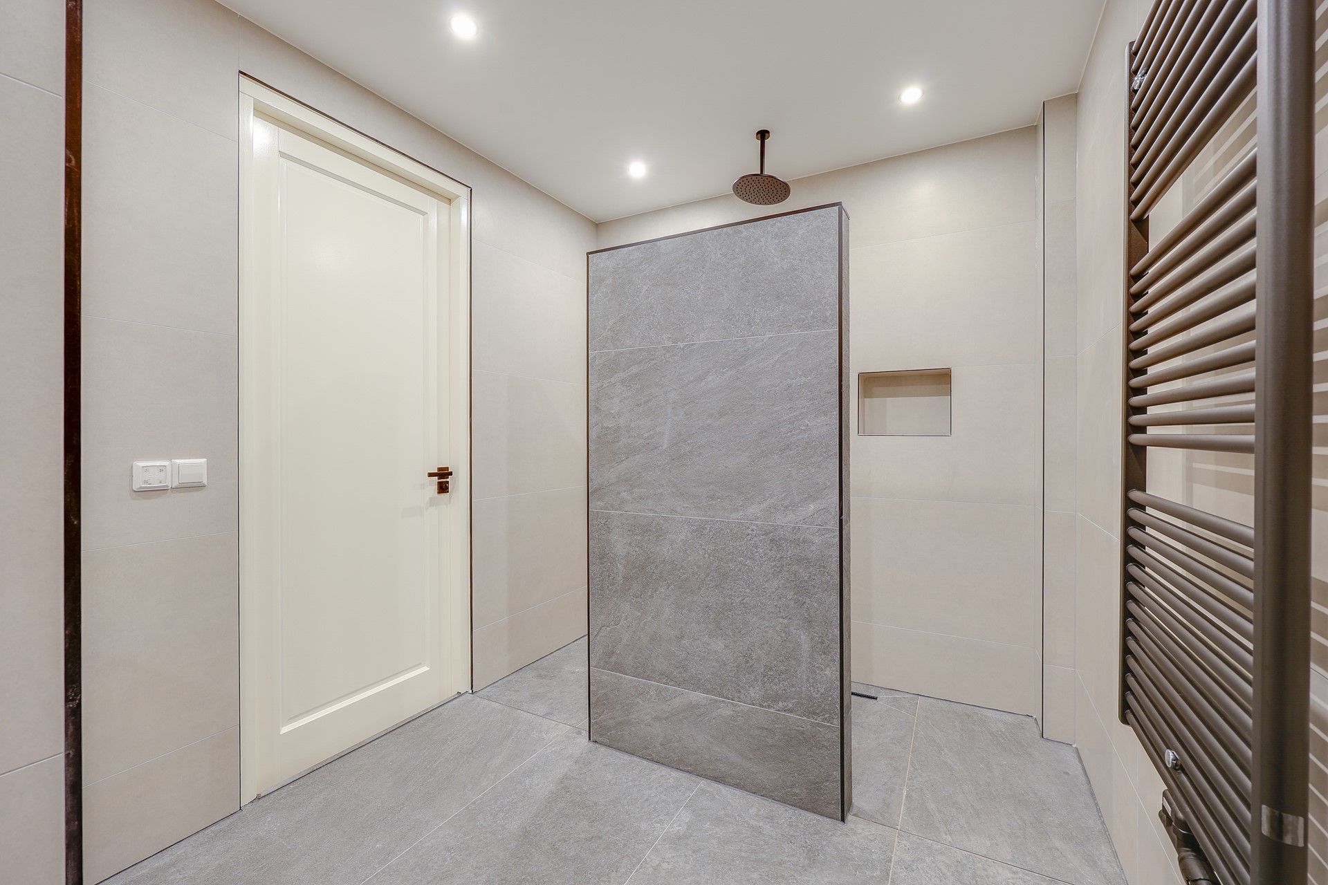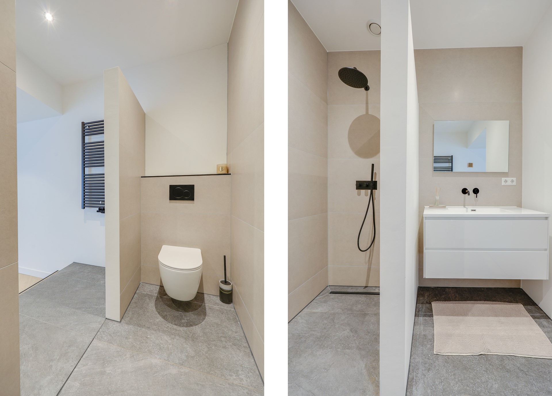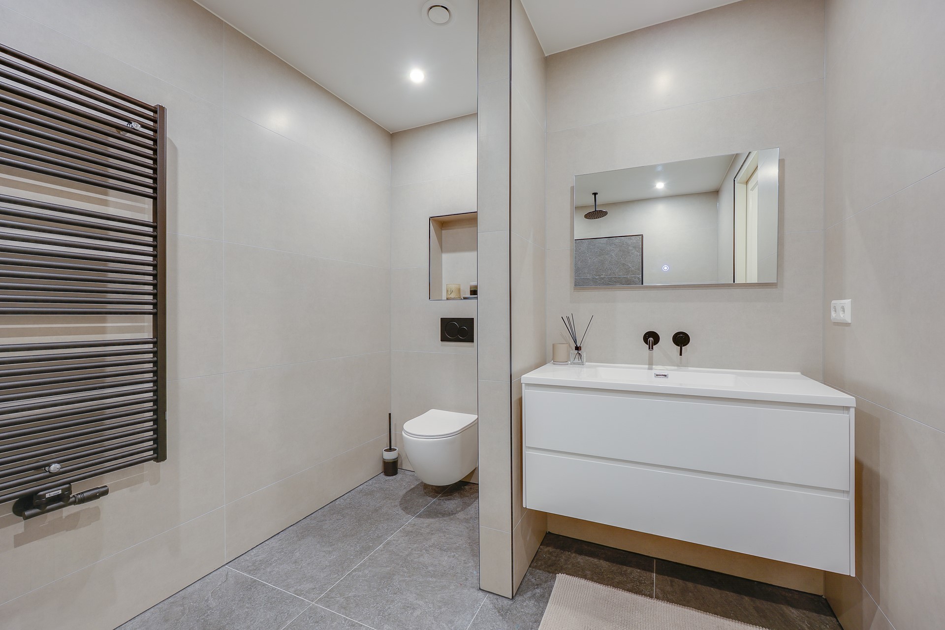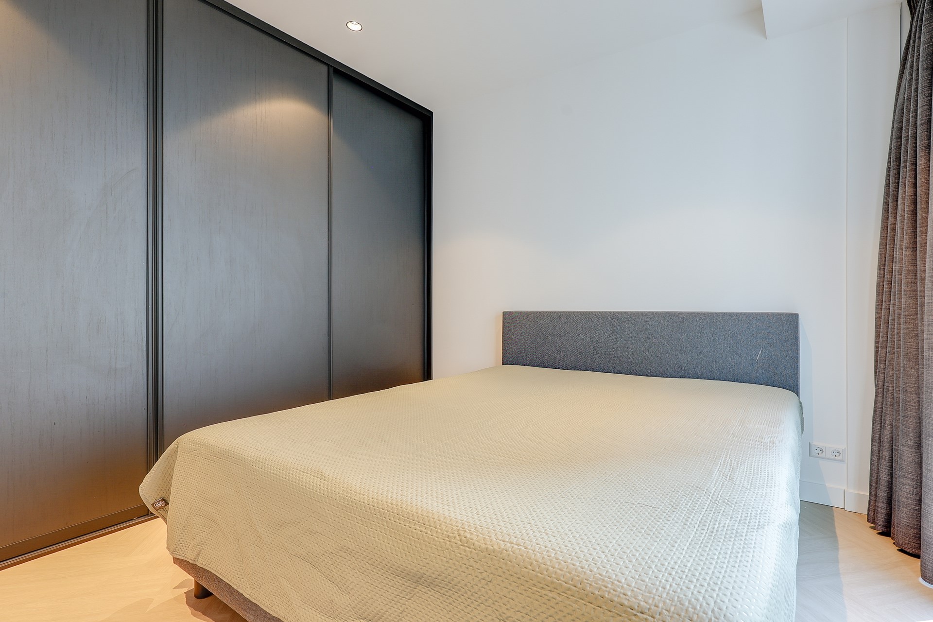 The apartment has been fully renovated and features a high-end modern finish throughout. Entrance, modern toilet. Spacious living room with a beautiful herringbone floor and a luxurious open kitchen in matte anthracite, equipped with high-quality built-in appliances. The first bathroom features a large walk-in shower with a modern finish. The spacious master bedroom has its own en-suite bathroom with walk-in shower, washbasin, and toilet. The second bedroom is also very spacious. The patio/terrace is located at the rear and can be accessed through sliding doors from both bedrooms.